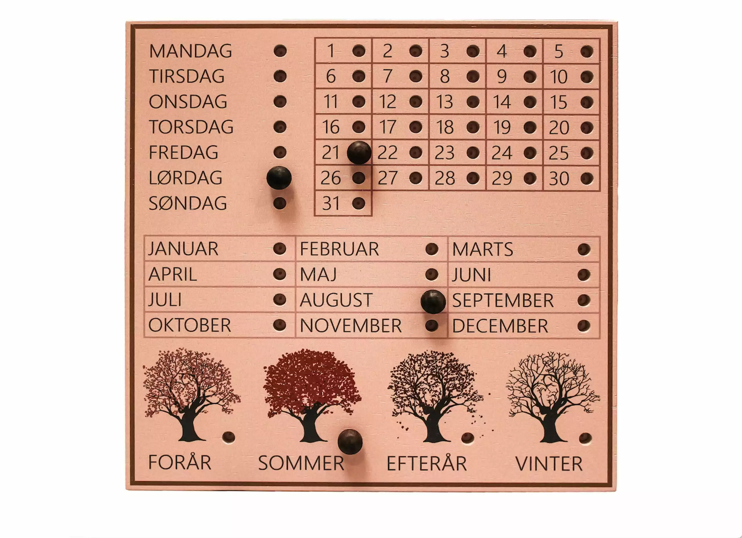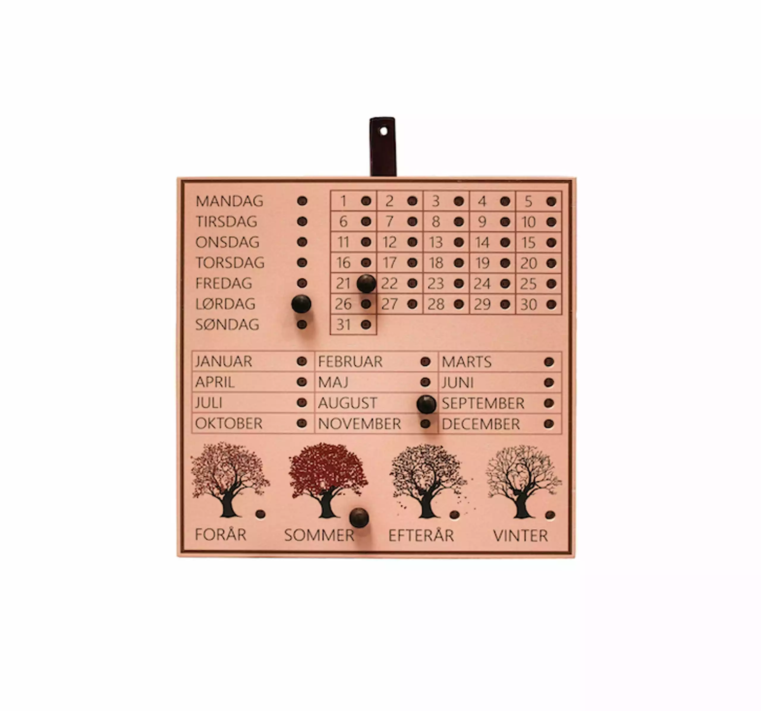 The Perpetual calender is available in different colors and comes in to different languages (Danish and English). The calender includes 4 knobs that you can atach to your calender.