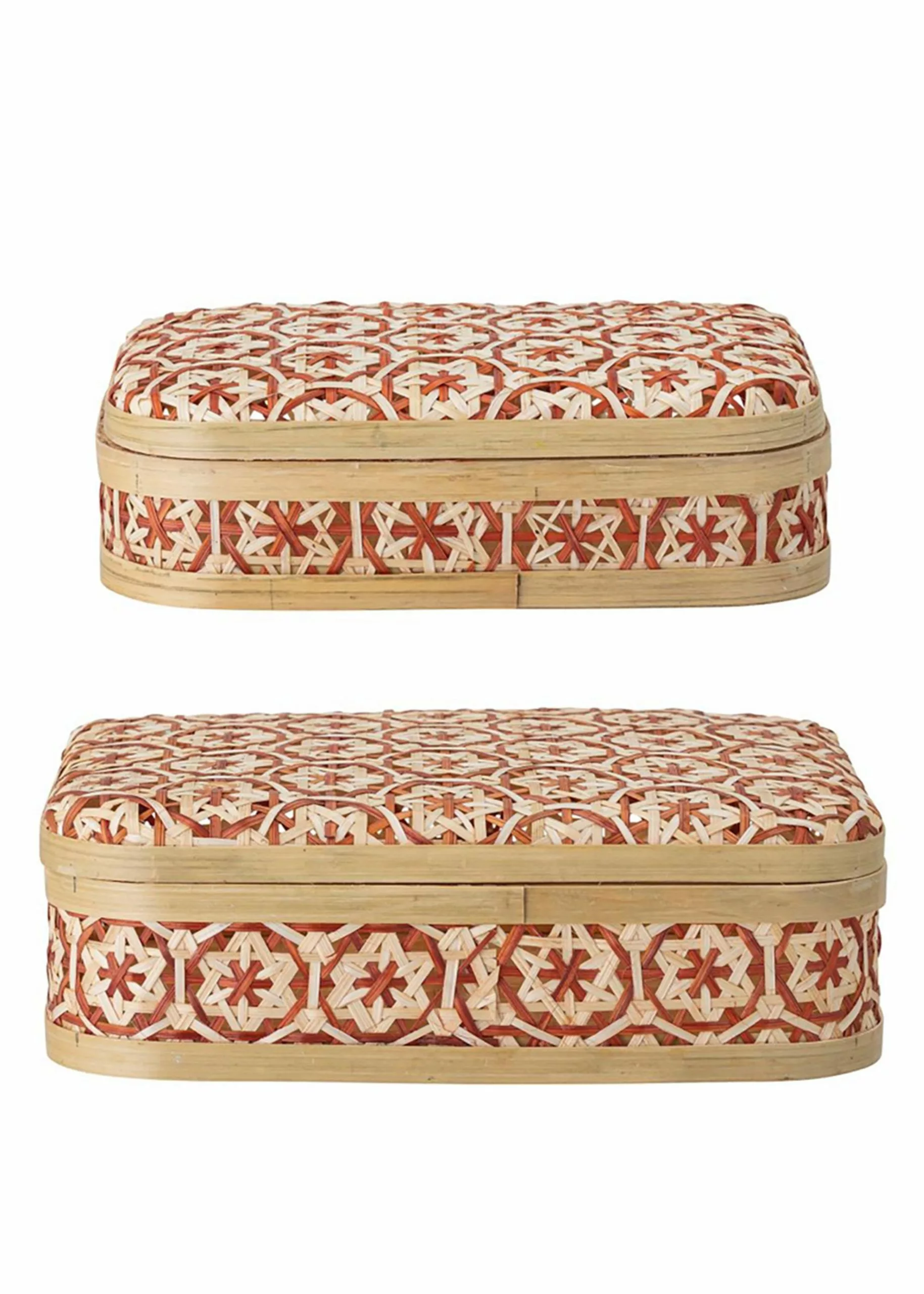 Fine braided bamboo basket with beautiful red painted pattern. The bamboo creates an organic and natural look and in combination with the red color it makes the baskets very decorative in itself. These baskets are perfect for storing jewelry or small items.