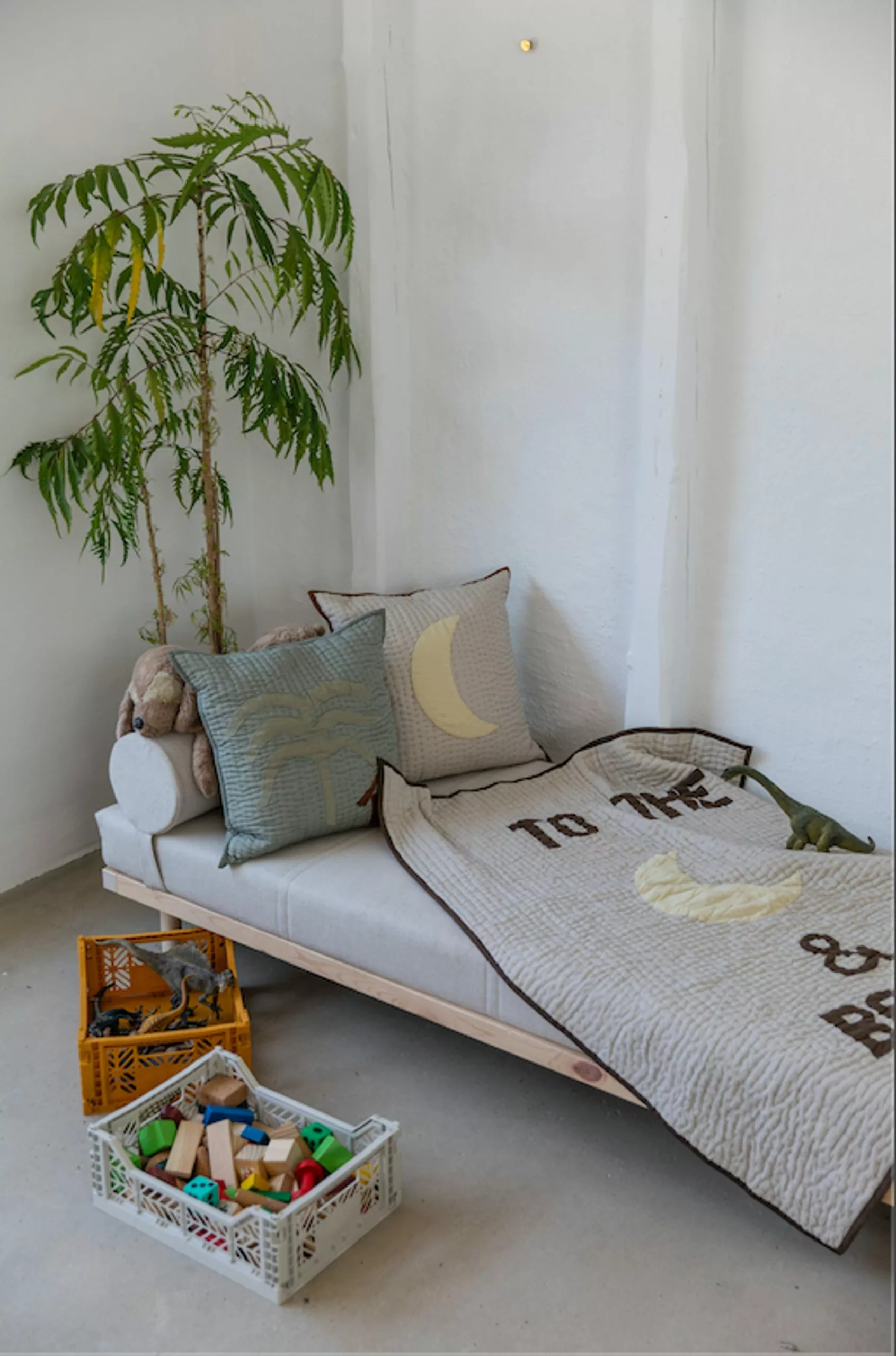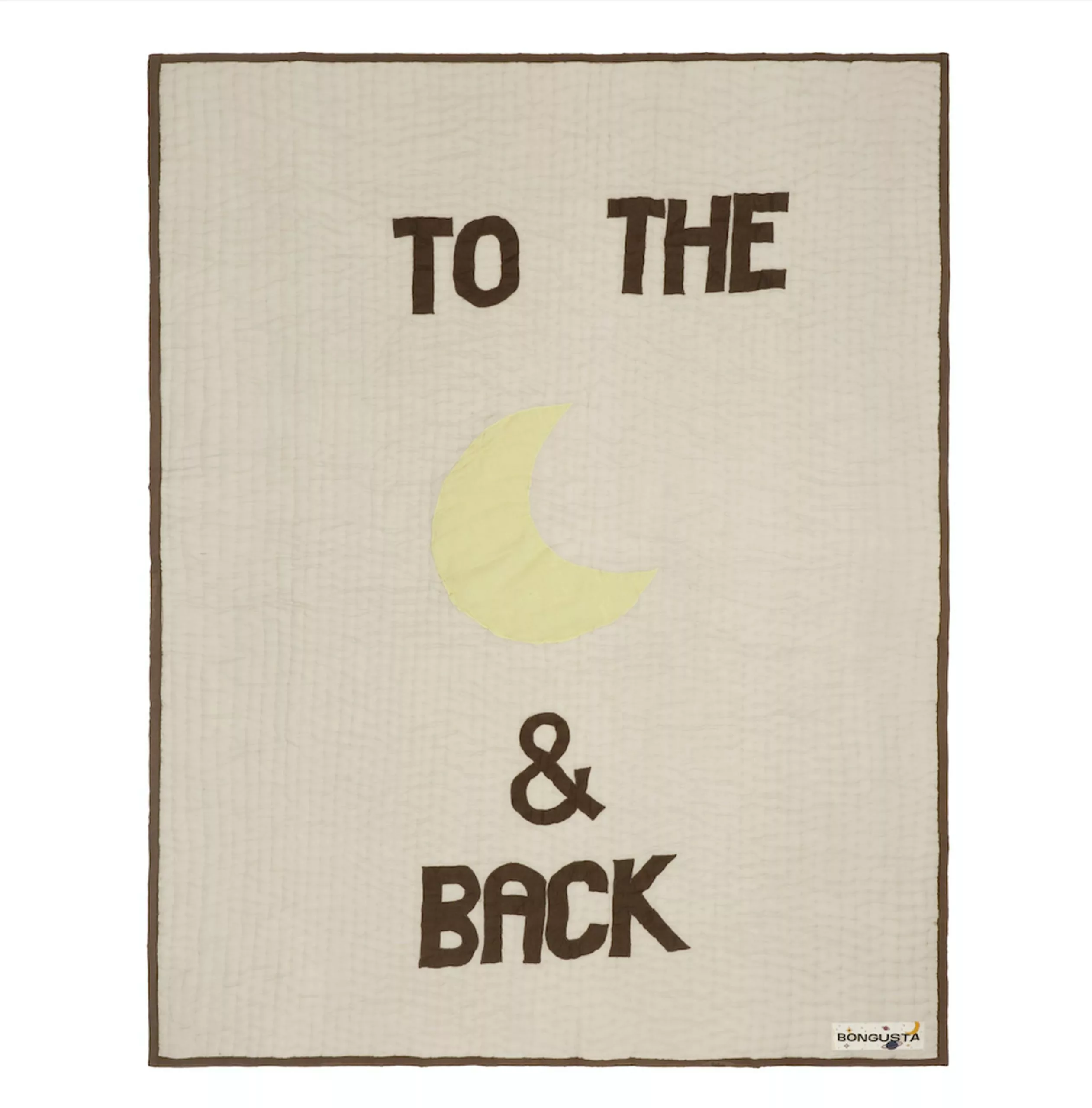 The To the Moon bedspread is quilted by hand, giving it a modern look. The rug is created in 100% soft cotton. The motif sets the mood for a good night's sleep, and refers to the phrase 'I love you to the Moon and back'.