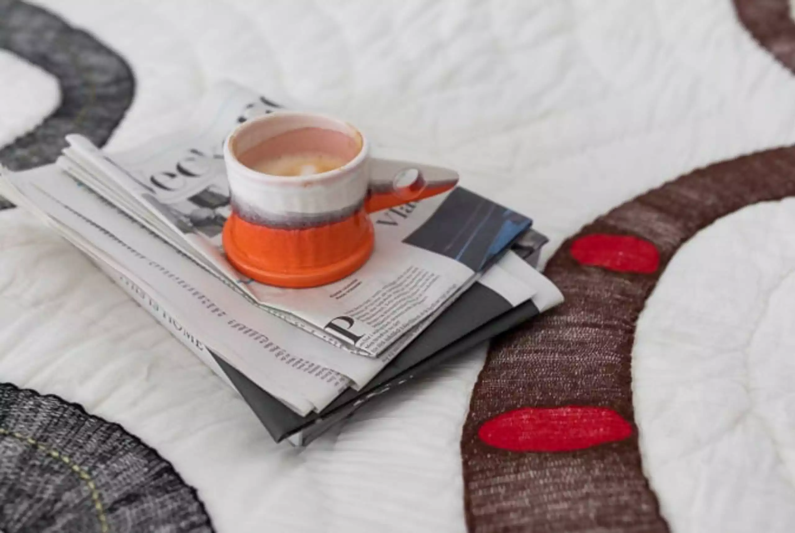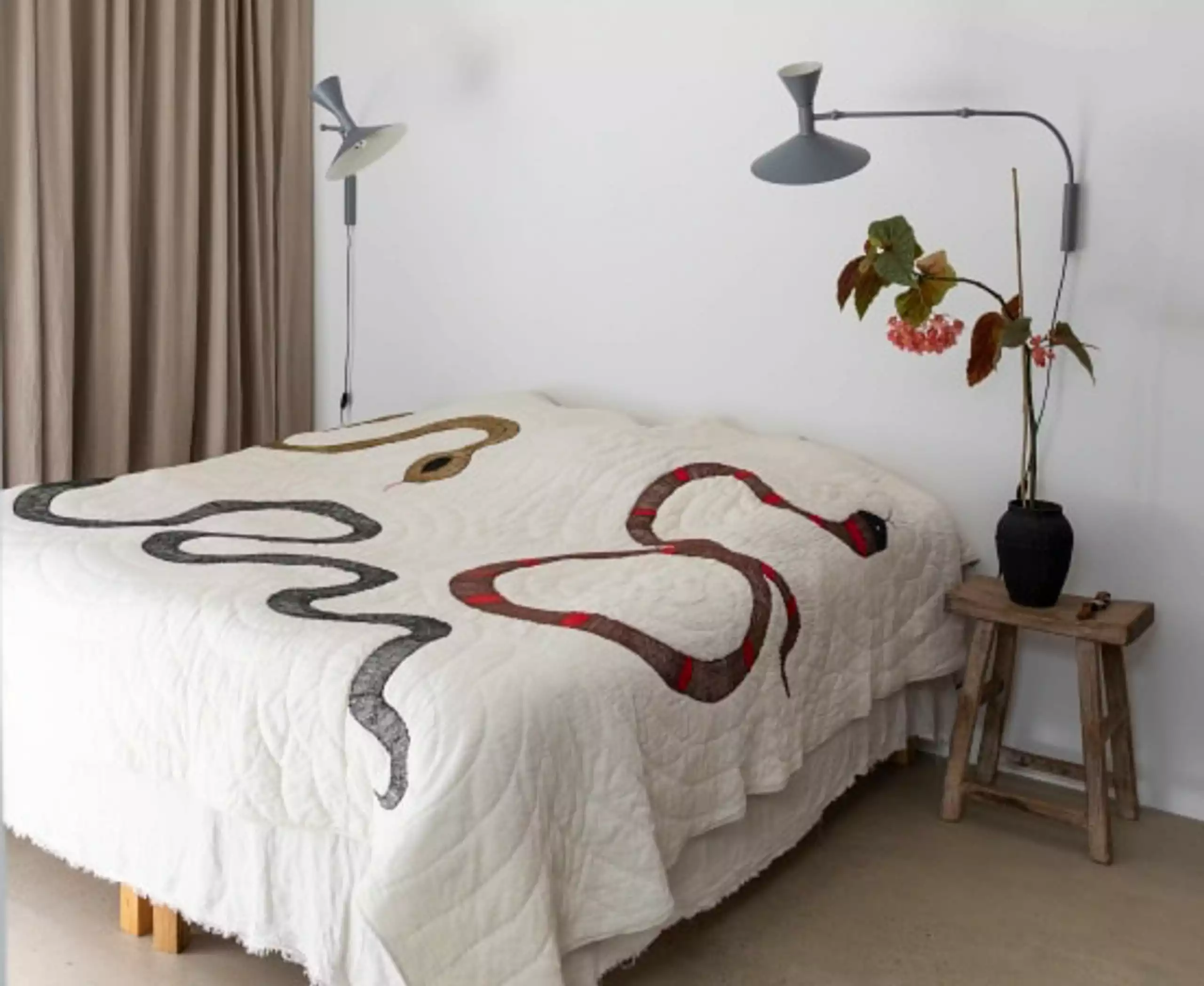 The chaos of everyday life can just be hidden away with a fine bedspread from Bongusta that is both a minimalist rug with still a little playful design with the handmade snakes. The whole rug is handmade on a manual sewing machine, which also makes it quite unique.