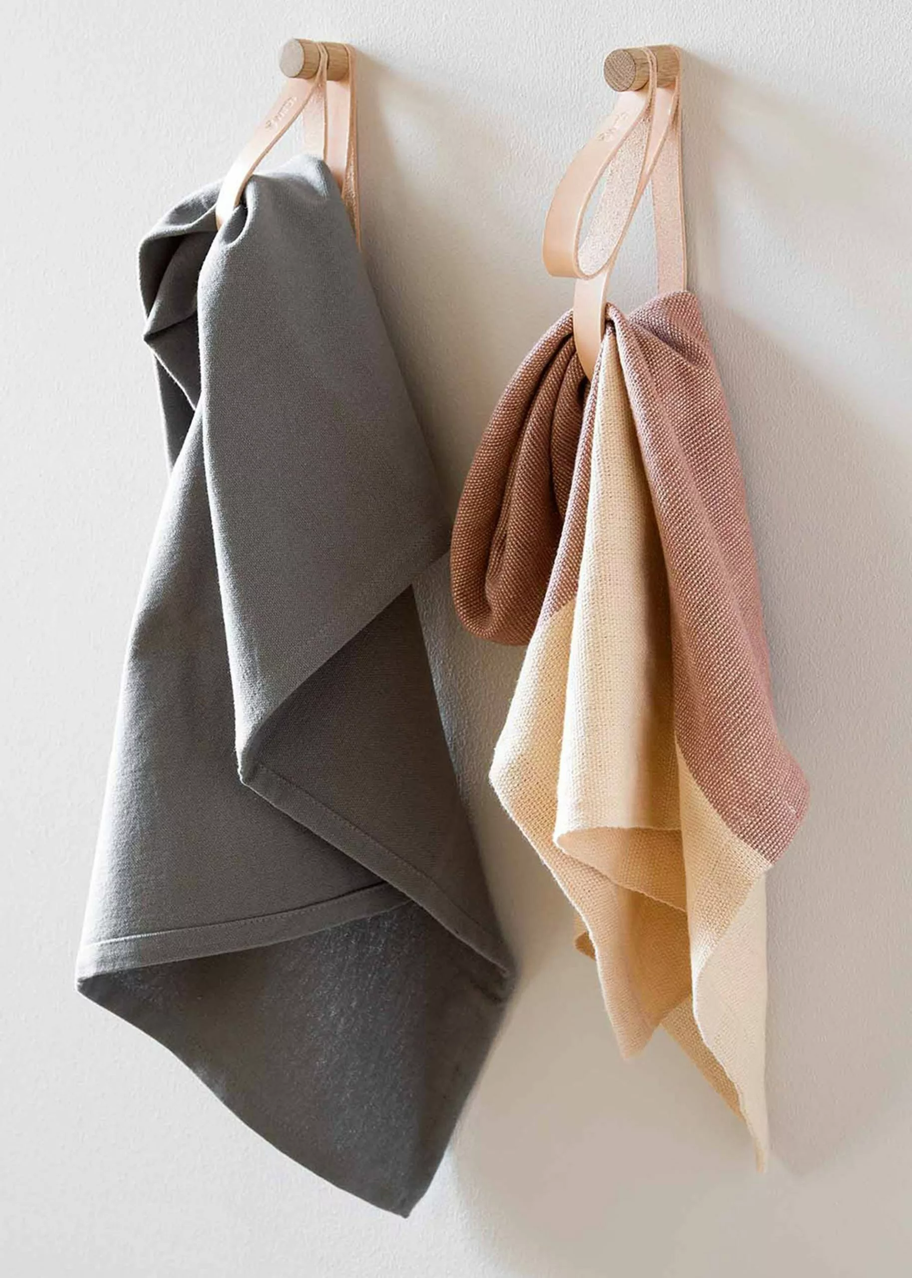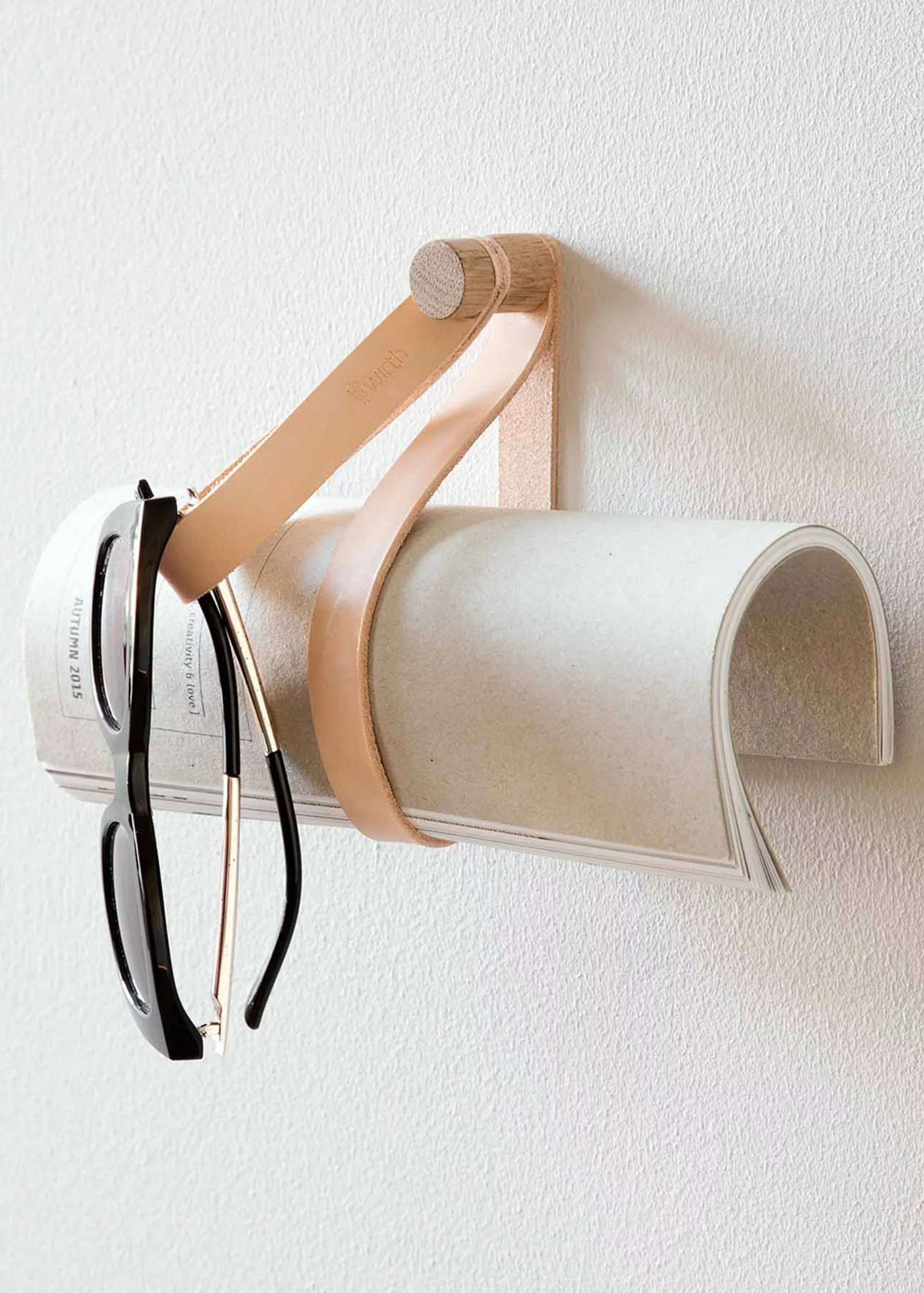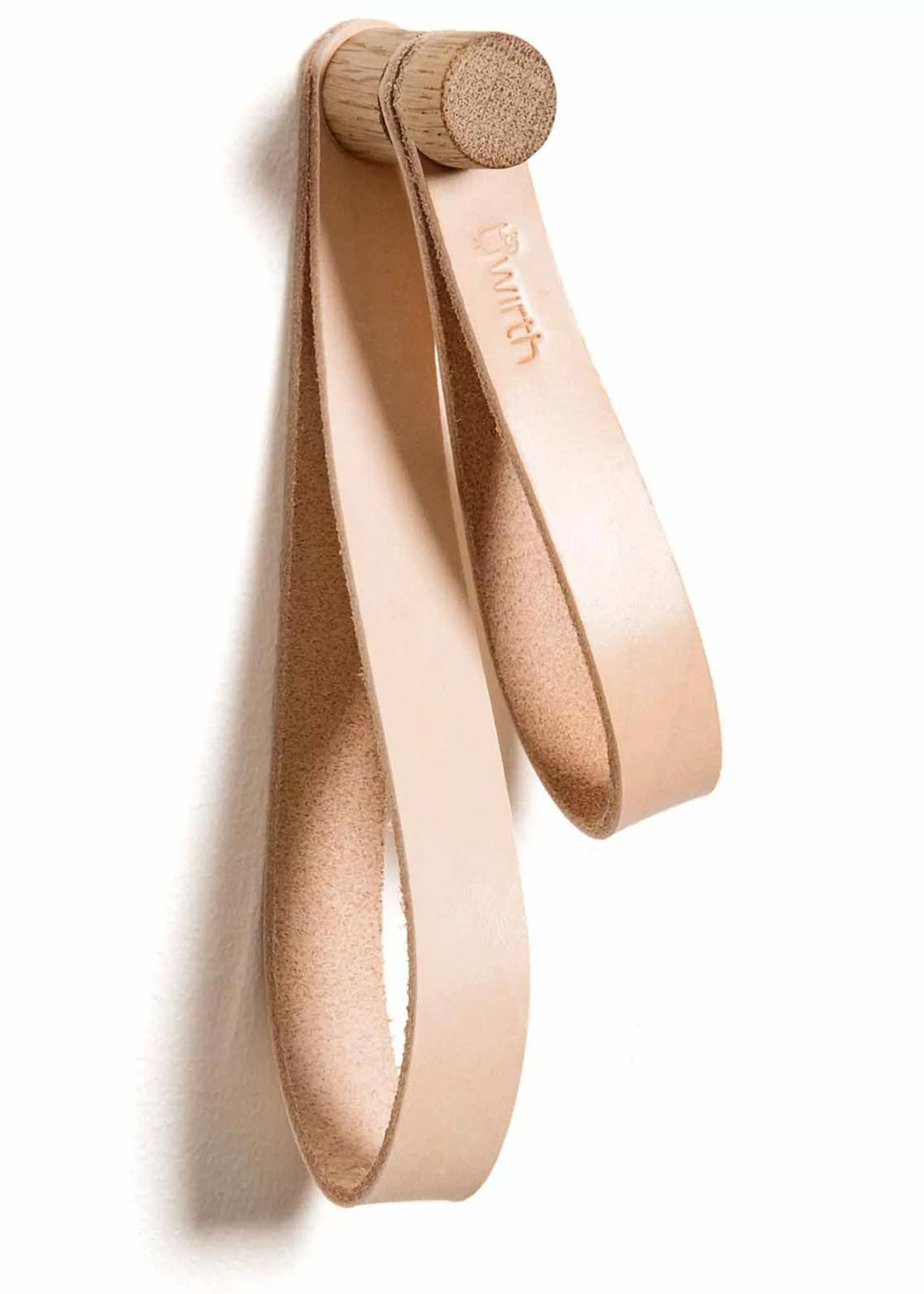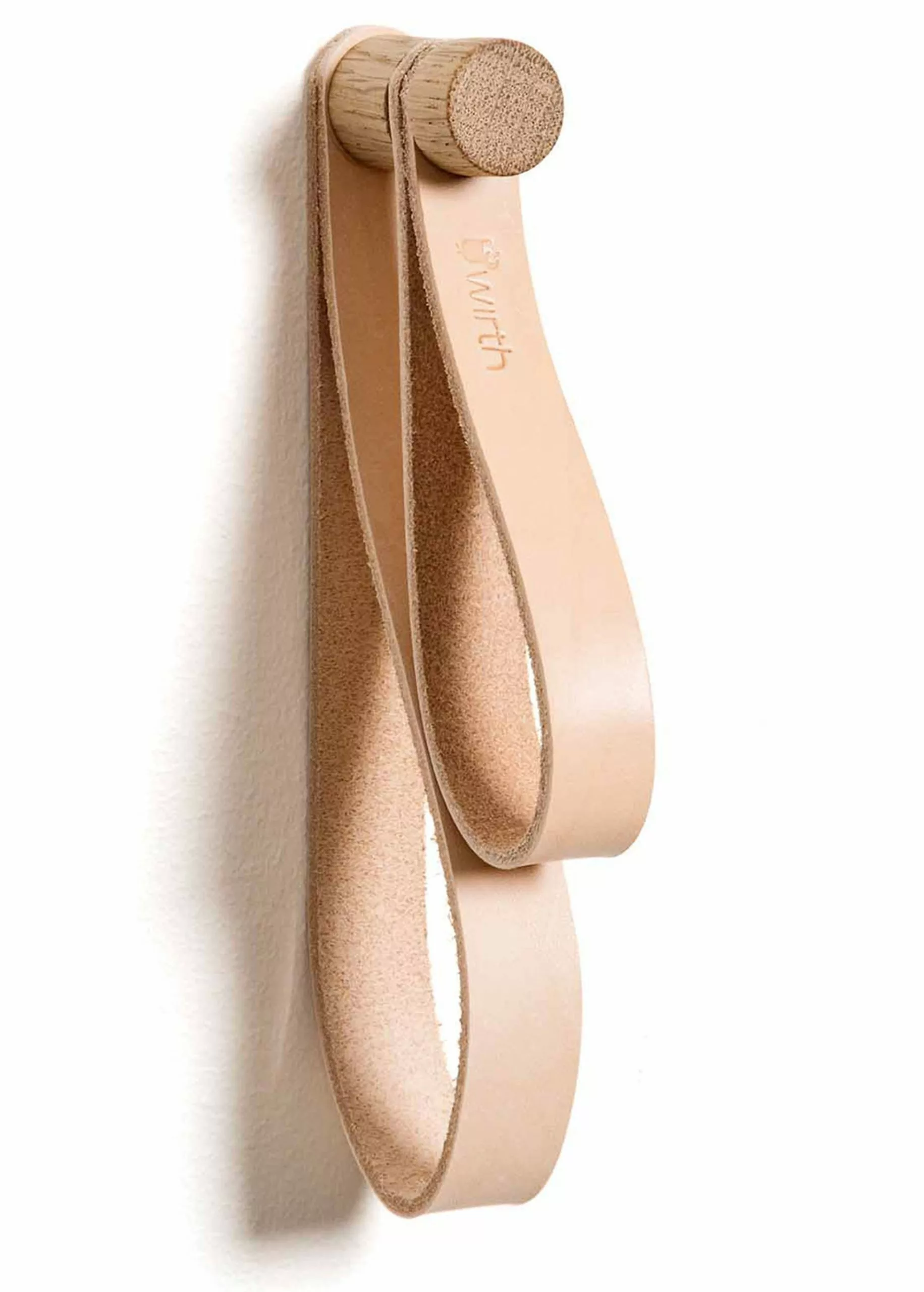 Double Loop is made by By Wirth. Double Loop consists of an oak hanger with two leather rings, which can be hung alone or together with others in a rack. The hook is long enough to hang something on it.