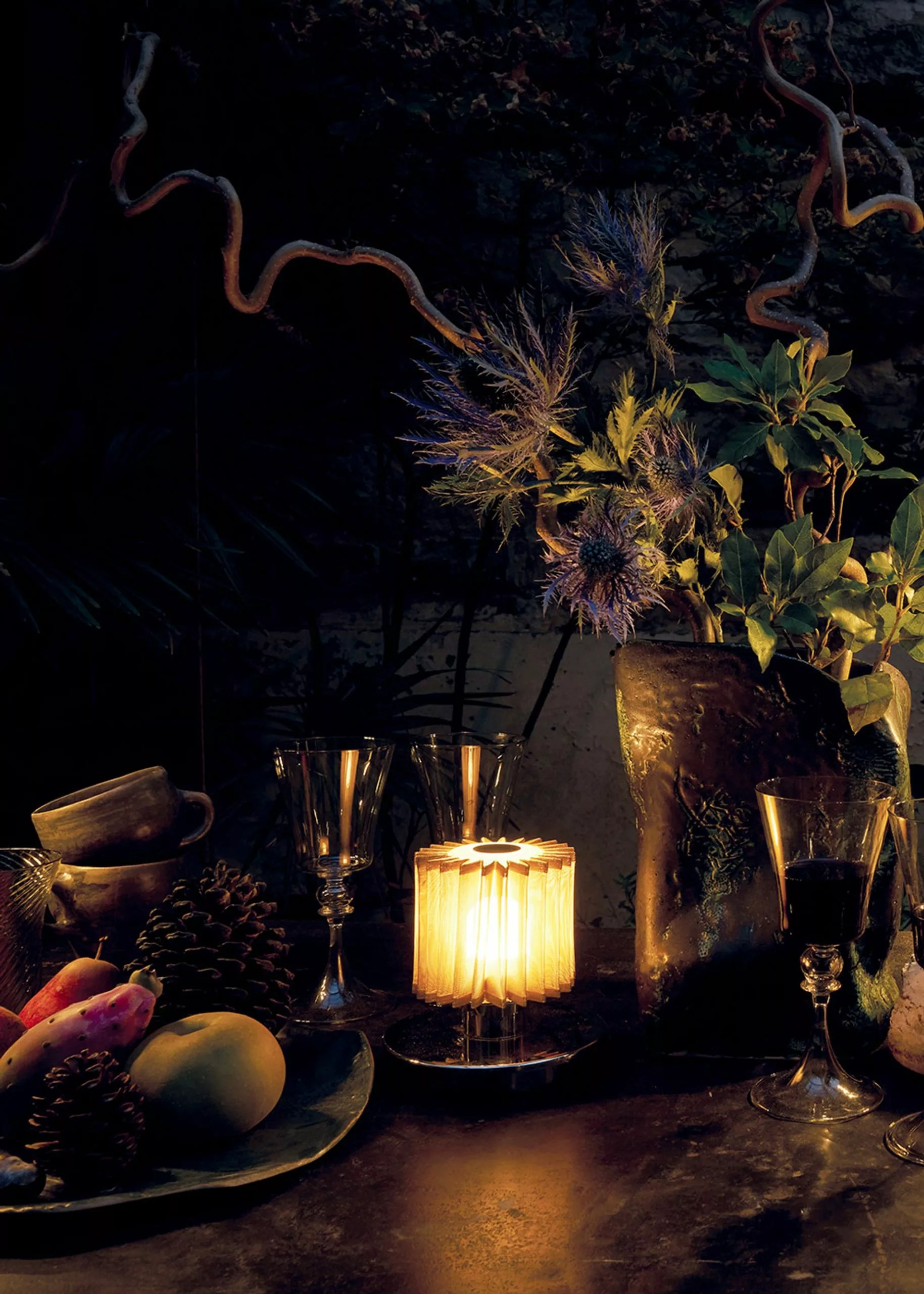 The In The Sun series is designed by Dominique Perrault and Gaëlle Lauriot-Prévost. It was designed as an homage to the "Sun King". They got the idea for the lamp during the renovation of the Pavillion Dufour at the Chateau de Versailles. The lamp comes in gold and silver which elegantly represents the "Sun King". Together, the lamps create a unique and magical atmosphere.