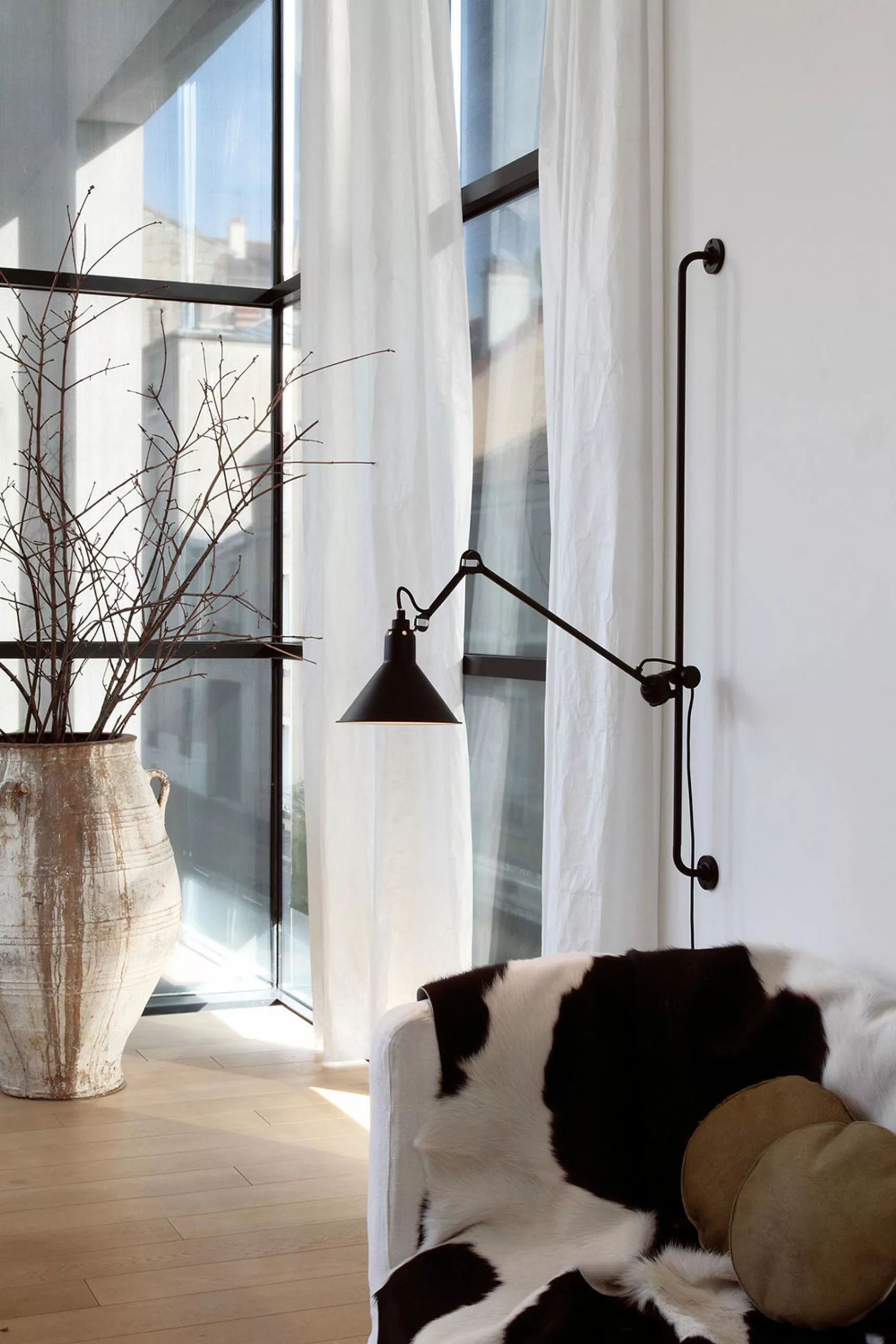 The N°214 wall lamp was designed by Bernard-Albin to be the perfect functional lamp. The steel lamp is built in a spring based design that allows the position and height of the lamp arm to be adjusted as required. Use the lamp at your desk, in hallways, in the entrance hall or next to your bed.