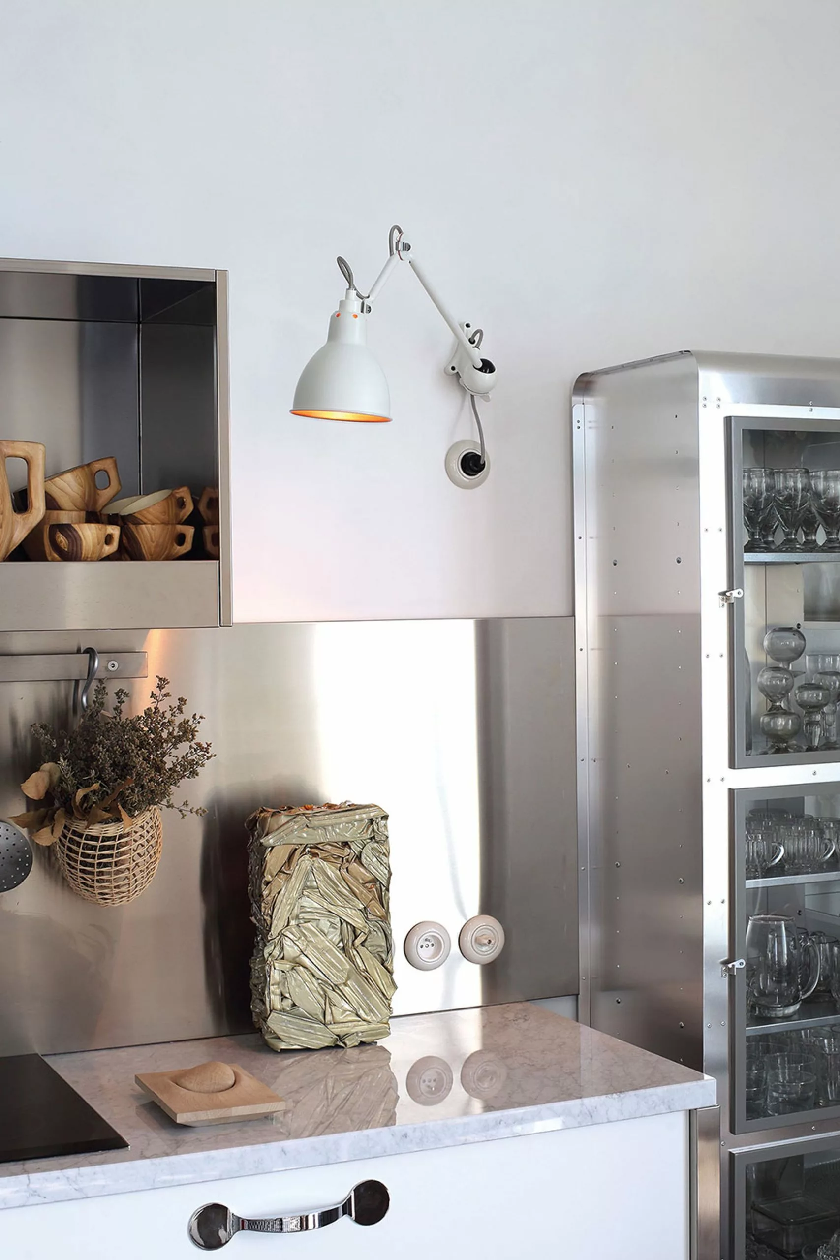The N°222 wall lamp was designed by Bernard-Albin to be the perfect functional lamp. The steel lamp head can be adjusted, the central arm can be tilted down and up, as well as rotated 360 degrees out from the wall. Use the lamp at your desk, in hallways, in the entryway or next to your bed.