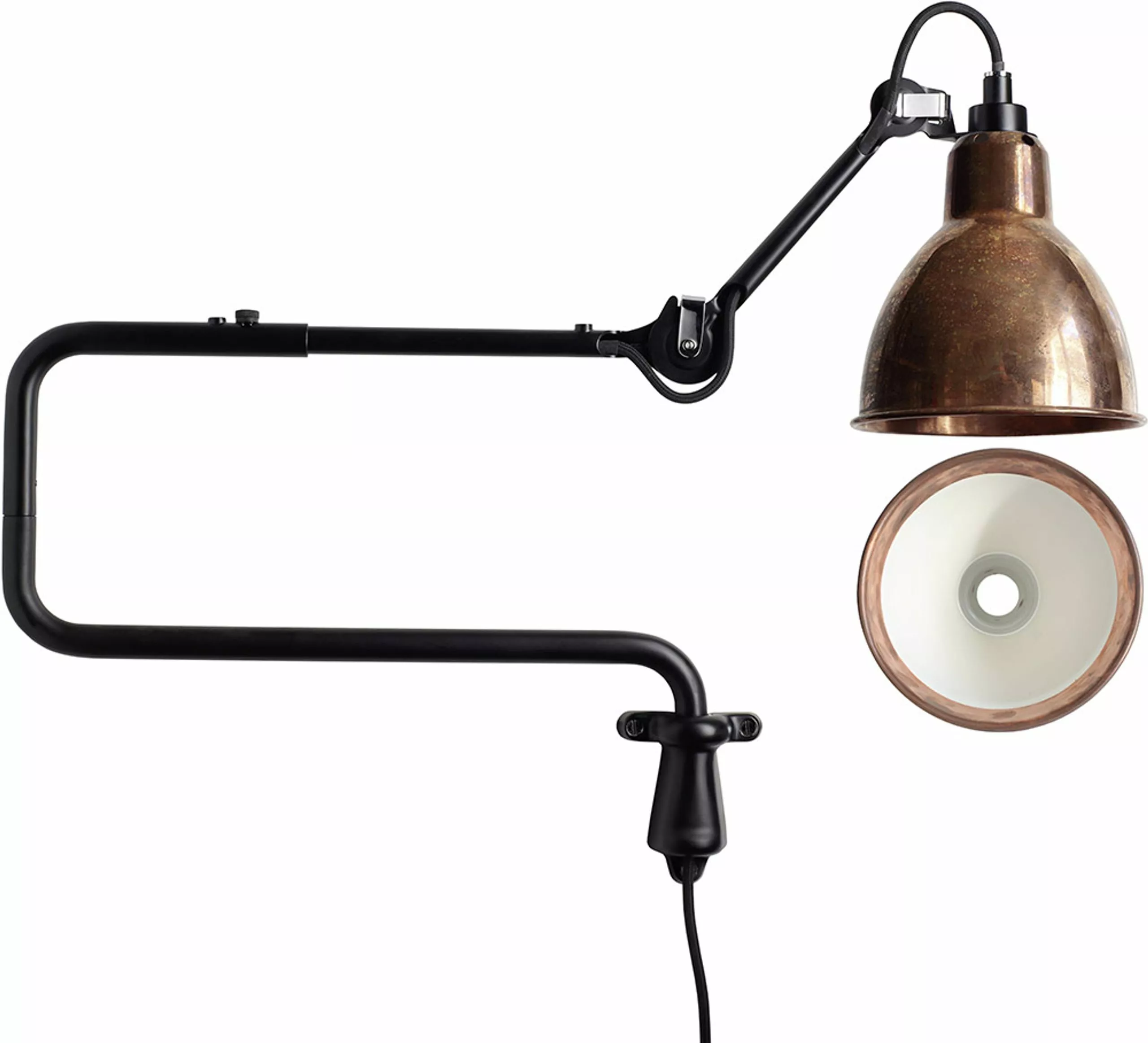The N°303 wall lamp was designed by Bernard-Albin Gras to be the perfect, functional lamp. The ball joint has been replaced with a pivot as it is better suited for intensive handling in this specific configuration. In this way, the lamp can easily be adjusted and is therefore ideal for when a more focused light is needed.