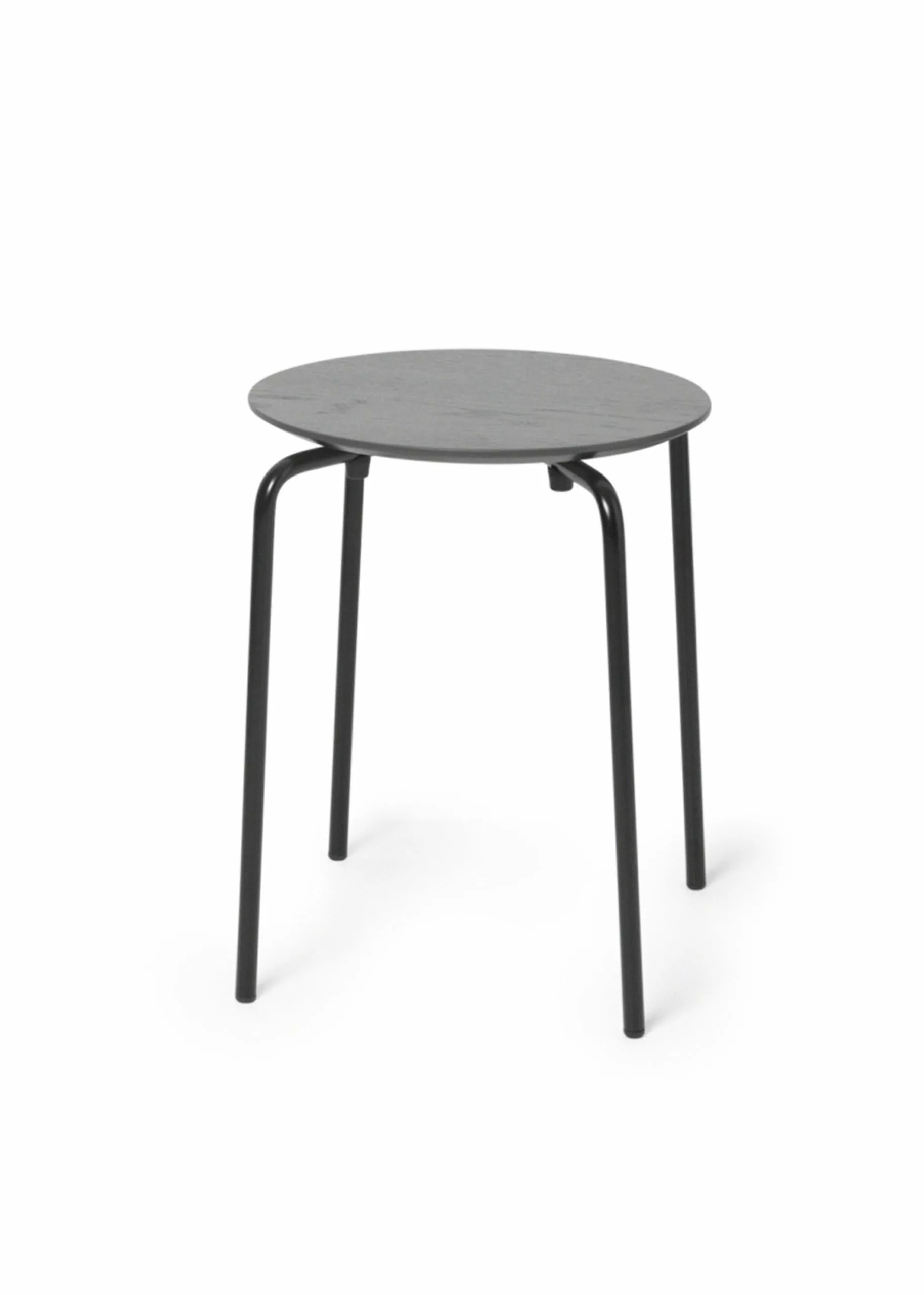 Ferm LIVING's stool in the Herman series is available in elegant and modern color games, contrasts and textures. Available with a seat in either stained oak veneer or lined with a layer of durable and sustainable linoleum on a classic powder-coated metal or chrome frame. This stackable stool, designed by Herman Studio, has a large oval seat.
