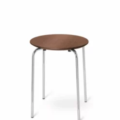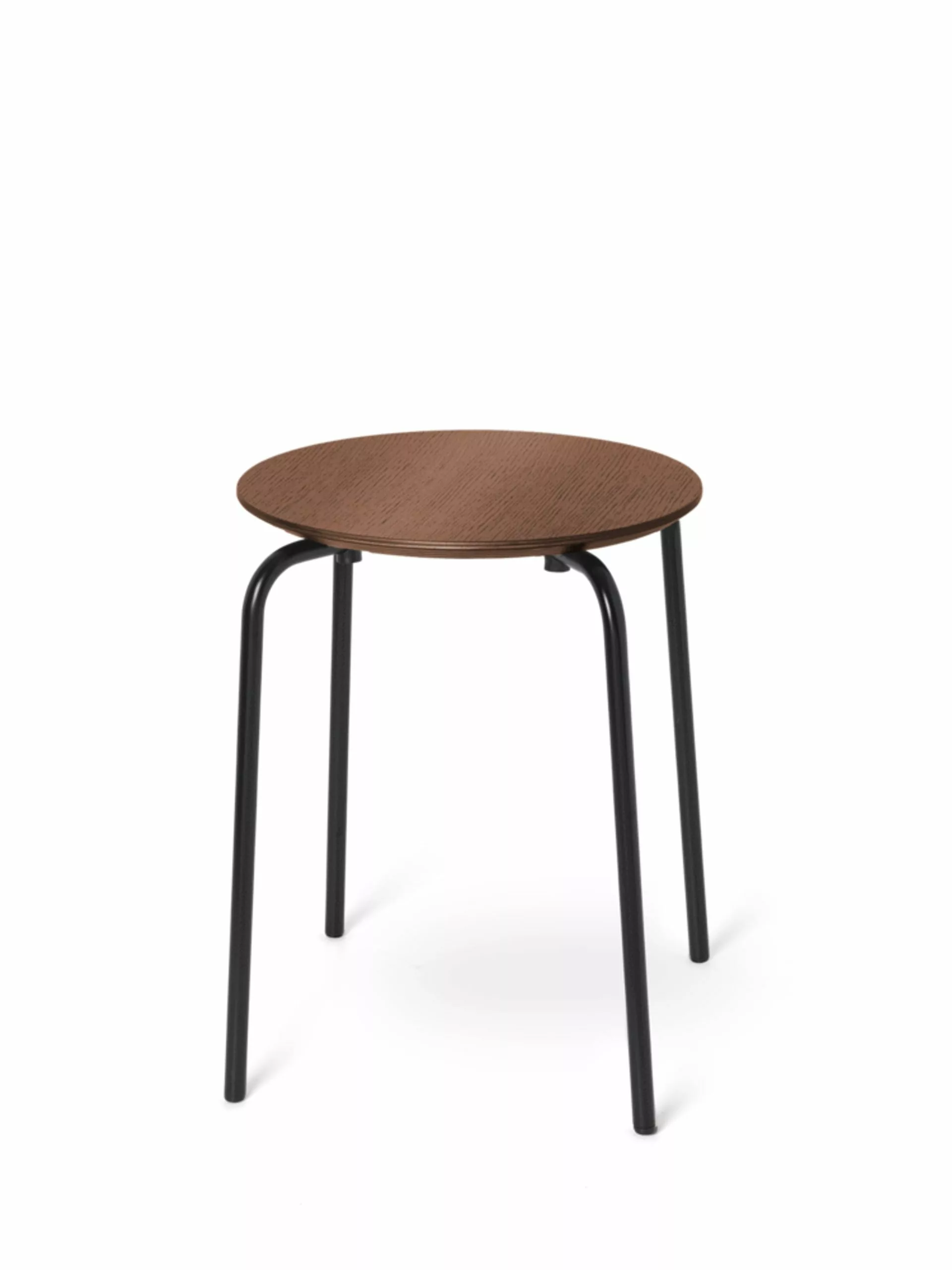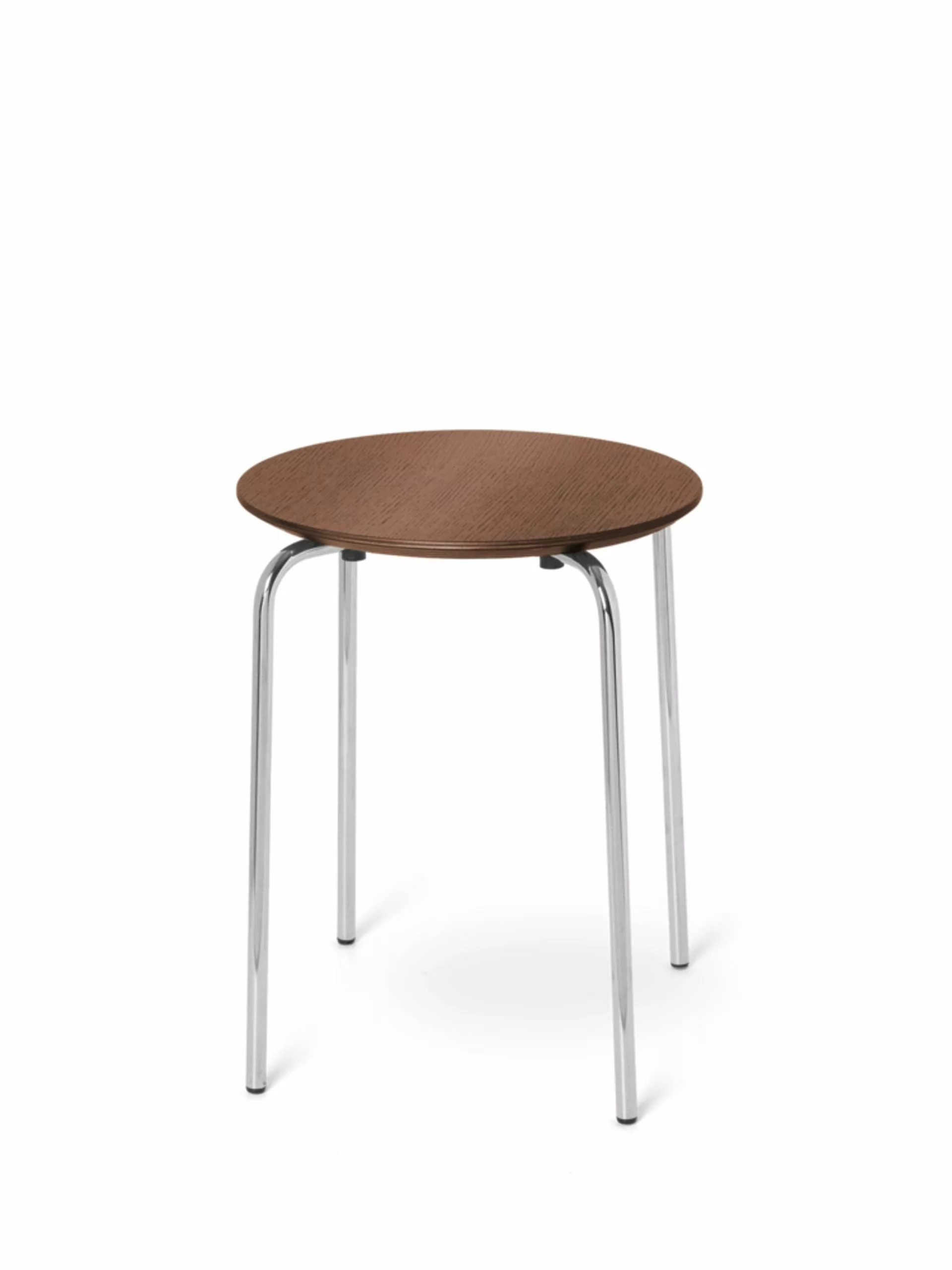 Ferm LIVING's stool in the Herman series is available in elegant and modern color games, contrasts and textures. Available with a seat in either stained oak veneer or lined with a layer of durable and sustainable linoleum on a classic powder-coated metal or chrome frame. This stackable stool, designed by Herman Studio, has a large oval seat.