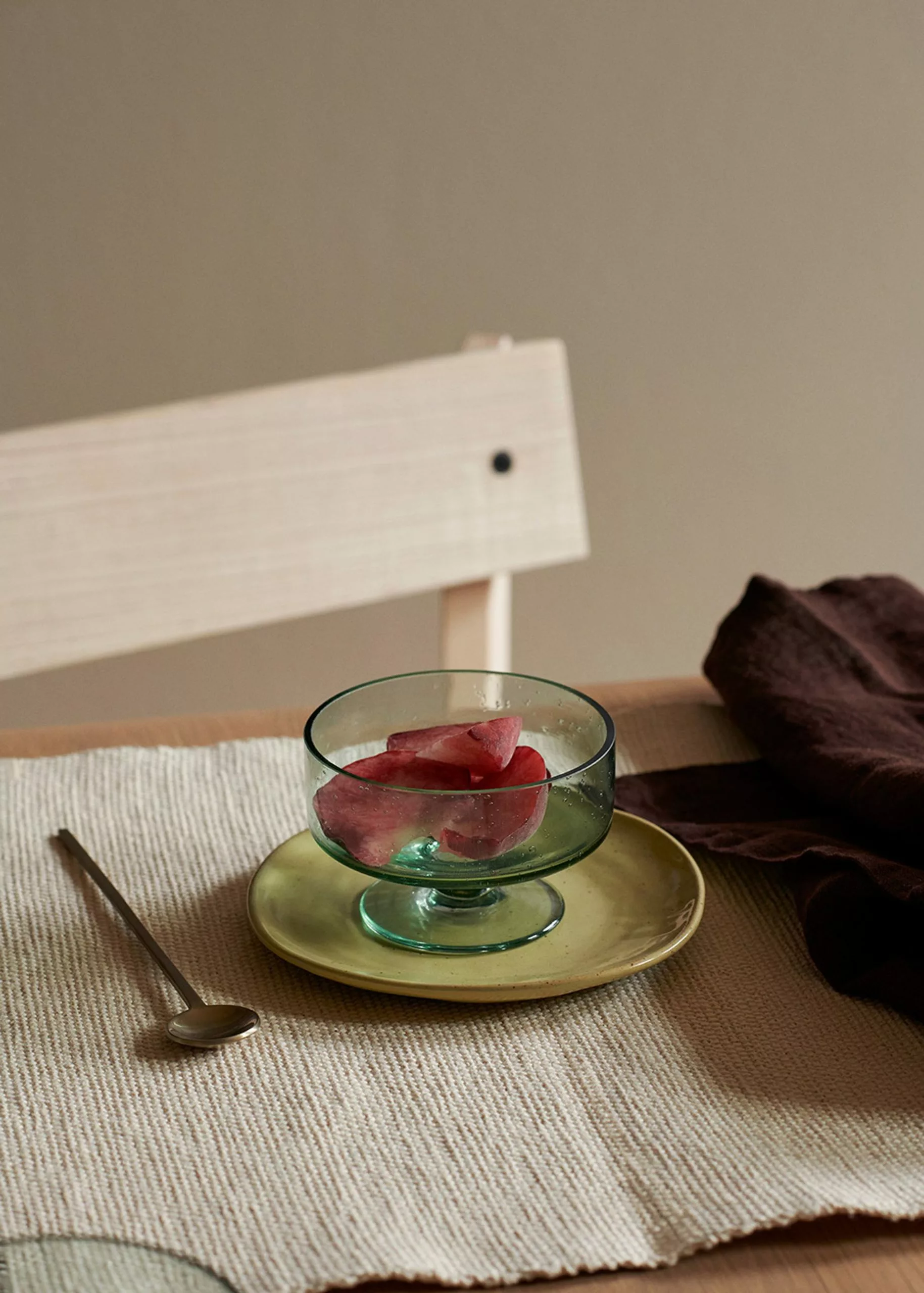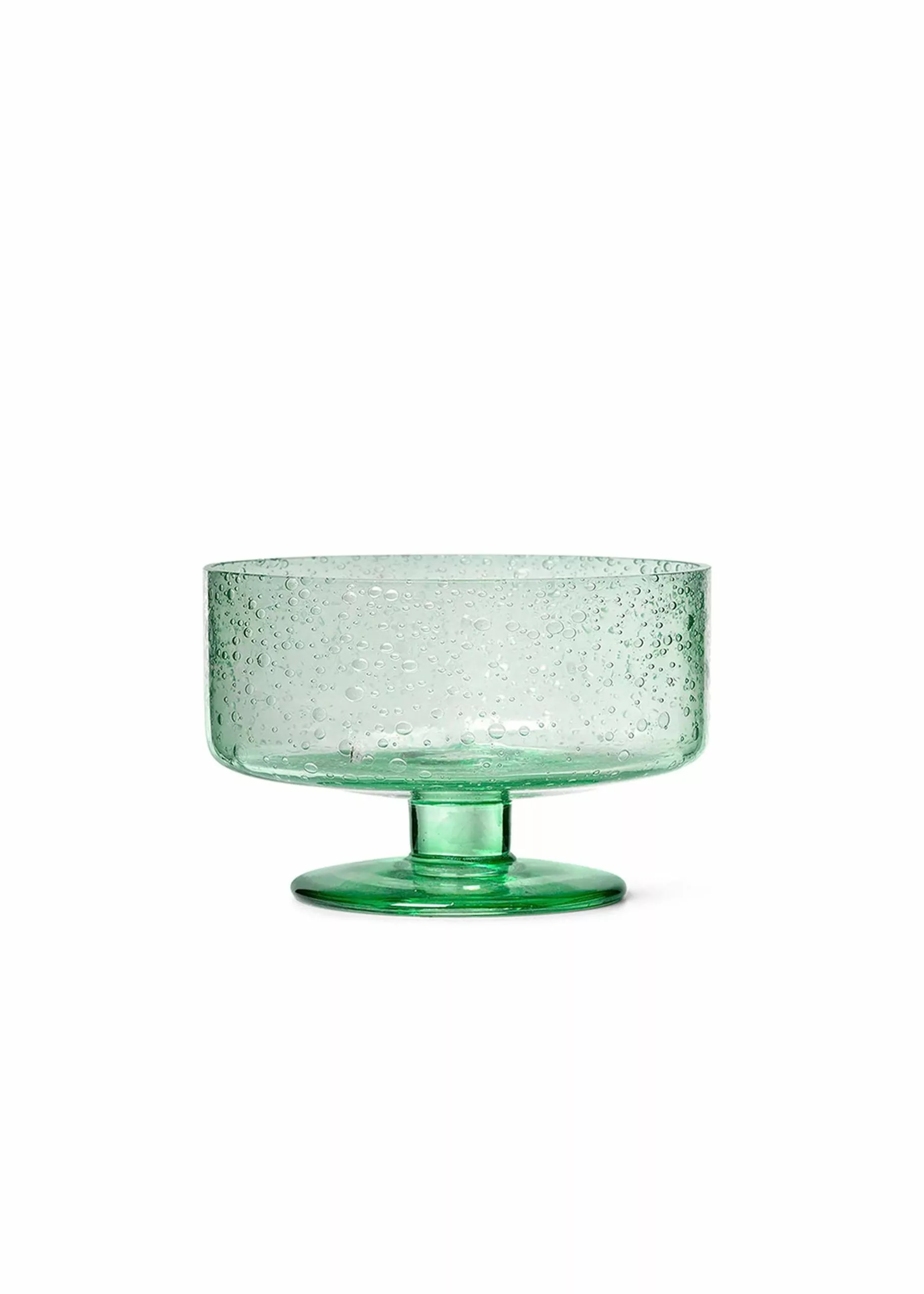 Oli Dessert Cup from Ferm Living is made of 100% recycled glass, which gives the glass a unique shine. The glass is characterized by small air bubbles created by the air pockets between the layers of glass. Each glass is mouth-blown and completely unique in their expression, both in color, shape and amount of bubbles. Use the glass to serve your dessert in a unique and elegant way.