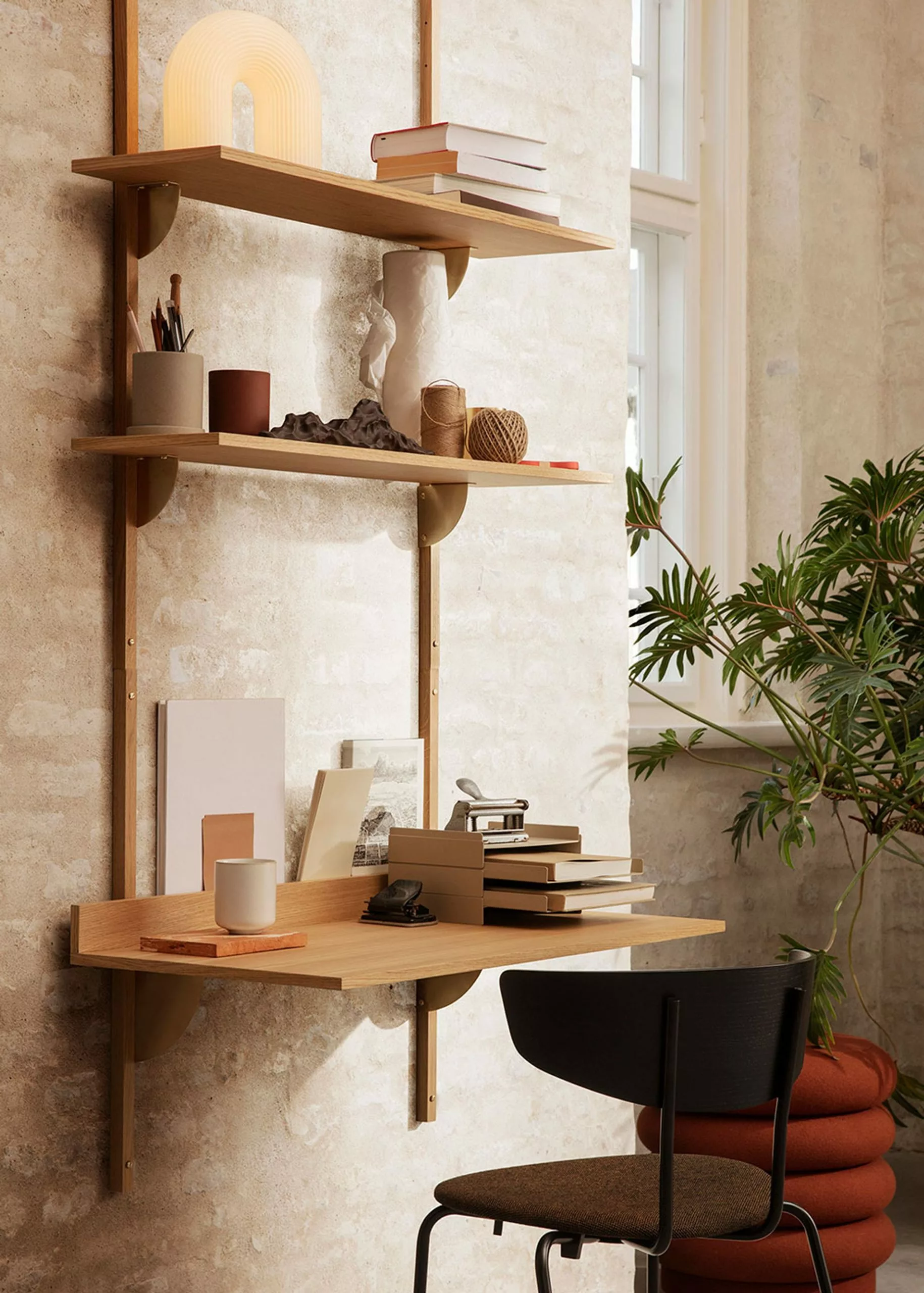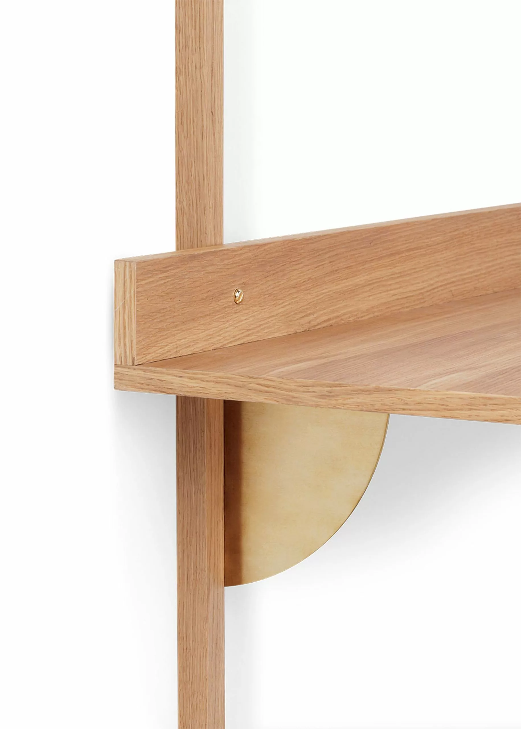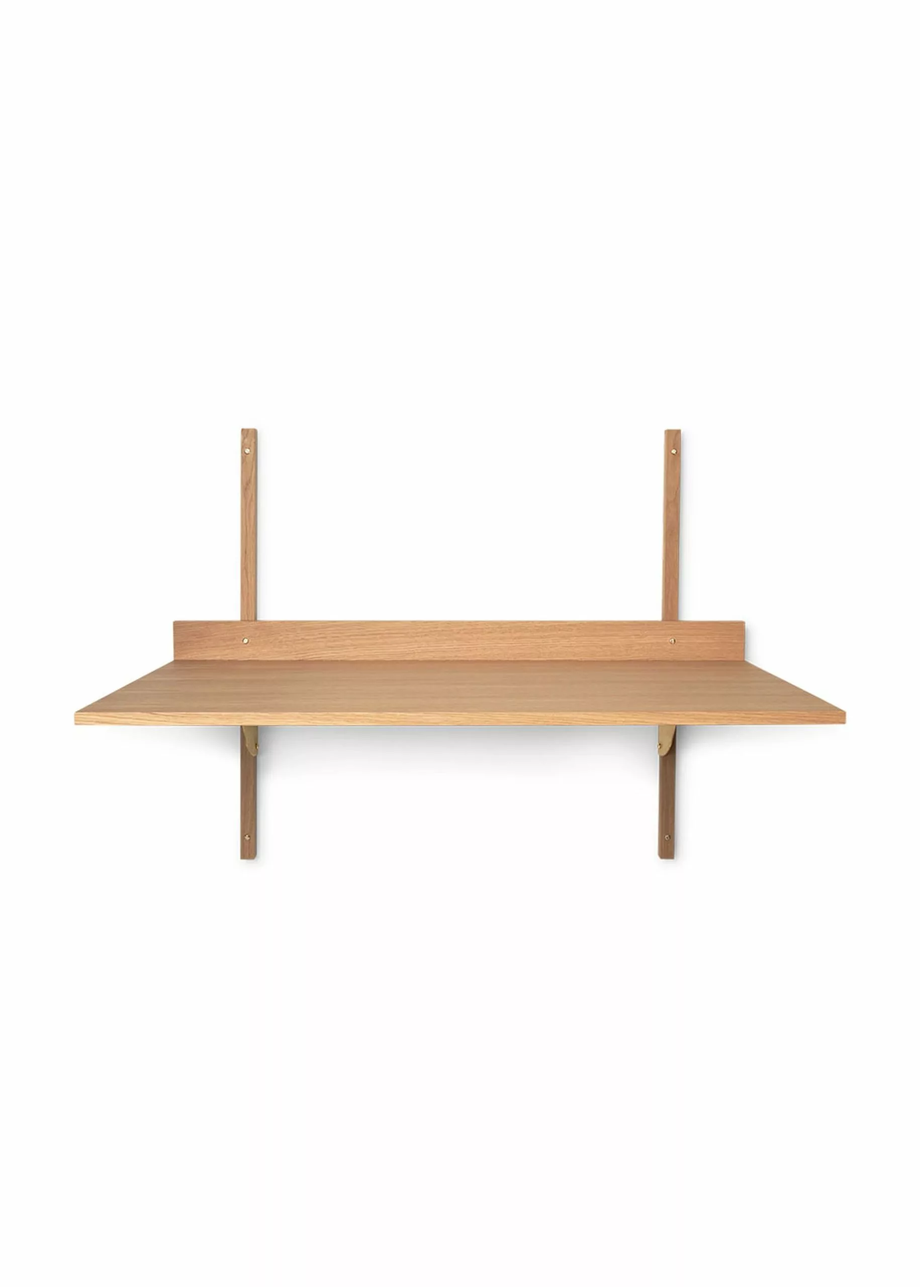 Sector Desk is an attached desk from Ferm Living. Sector is a new and modern interpretation of the shelving systems of the 50s and 60s and is characterised by its robust simplicity and classic combination of wood and brass. A short edge at the end of the desk creates a small, narrow space ideal for handwritten notes or a favourite photograph.