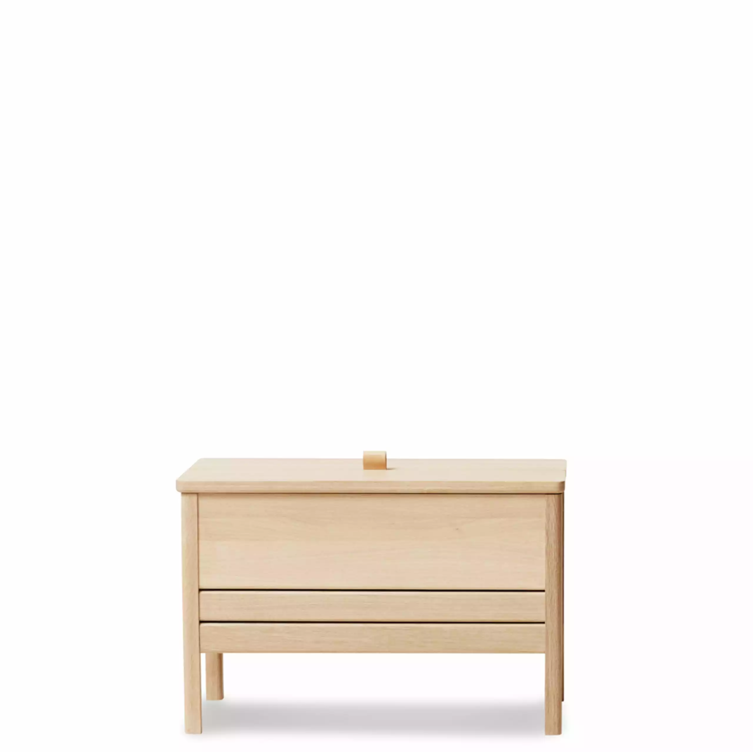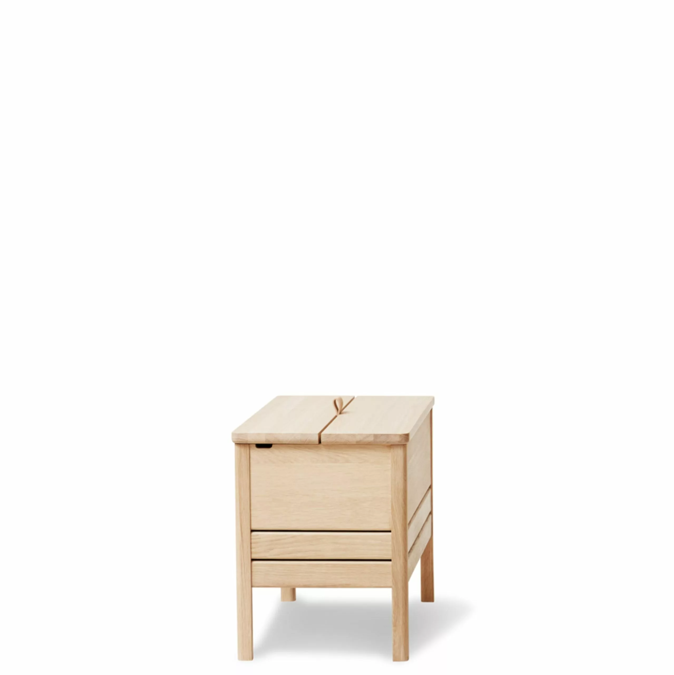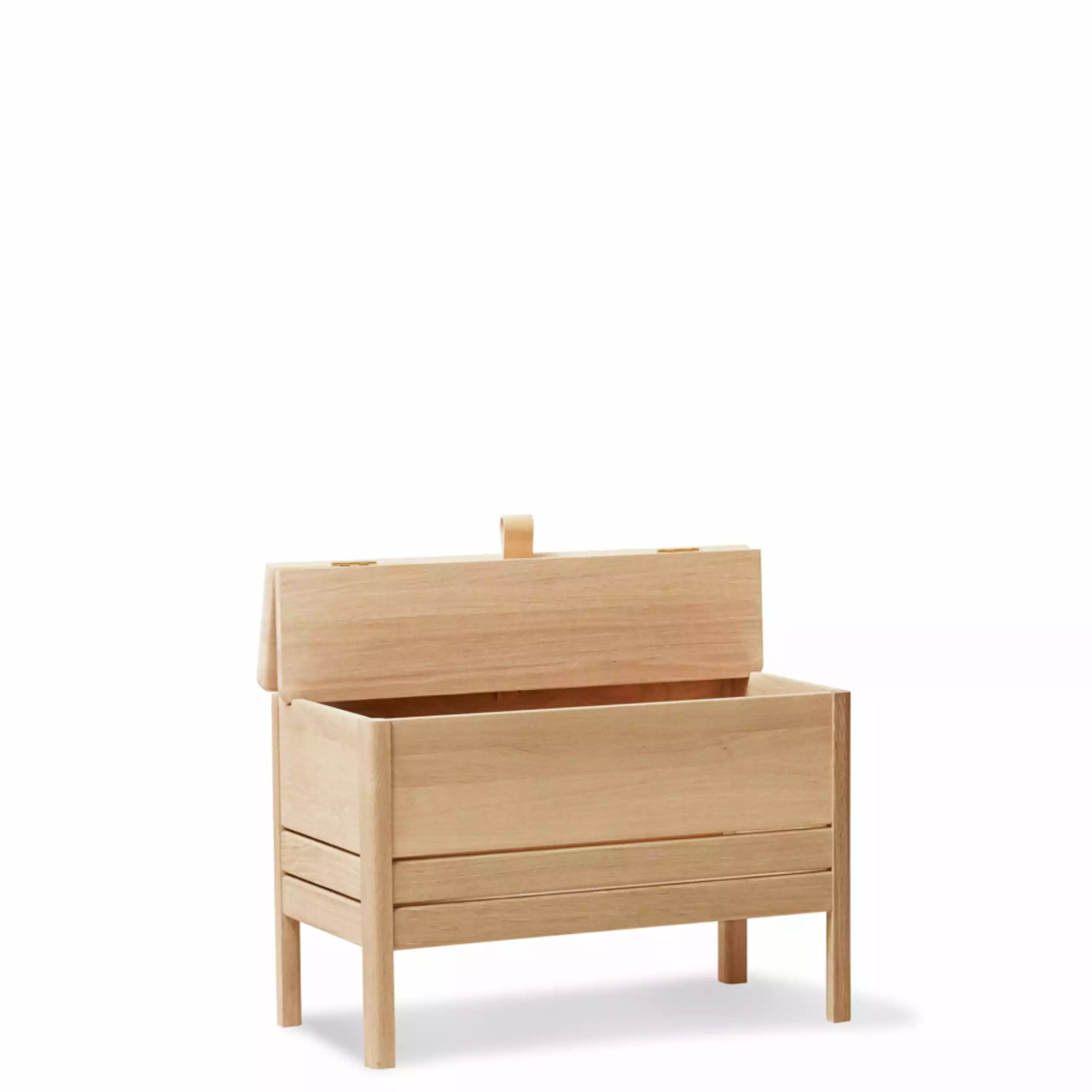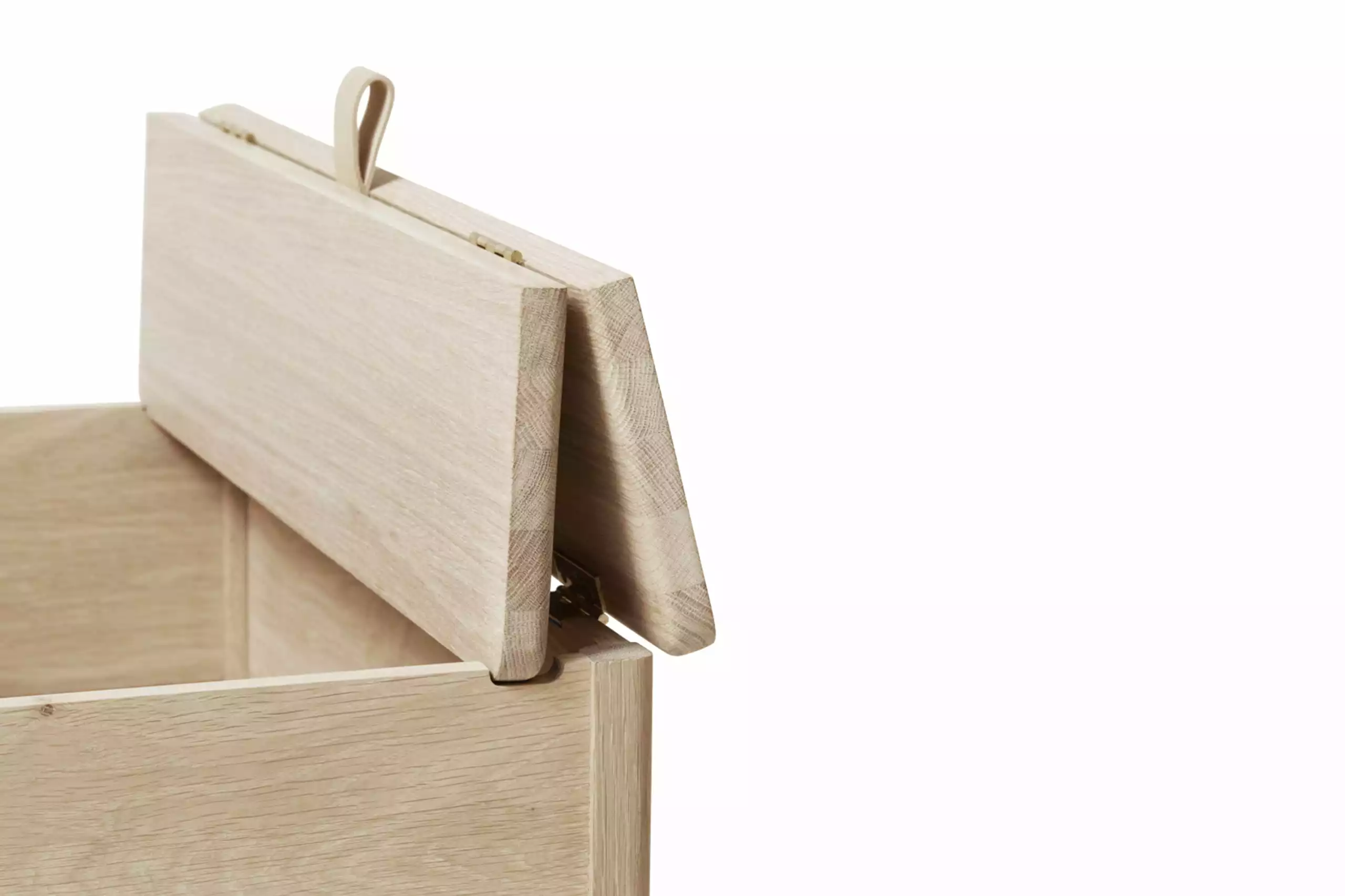 An updated version of the classic disposal bench, where functionality meets pure form. A solid and versatile bench with lighter, slightly reduced dimensions and minimalist attitude. It is convenient with a large storage area. The lid is lifted via a small leather handle and the construction holds the lid in place while it is in use. The lower cut on the two legs and angles gives it a feeling of being lifted, while the overall design is solid and robust. A versatile bench either as a stand-alone item in a hallway, bedroom or any sitting area.