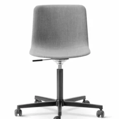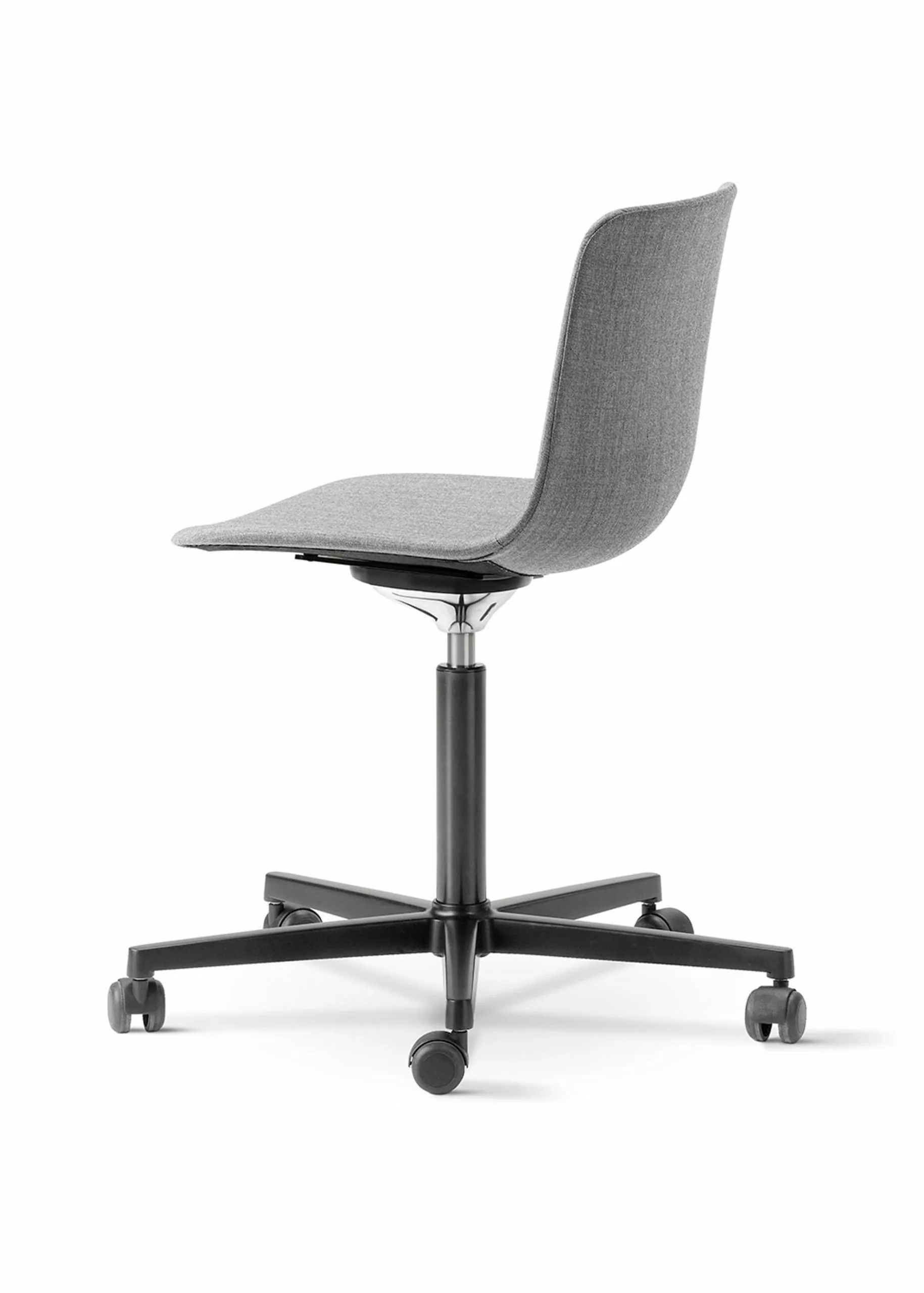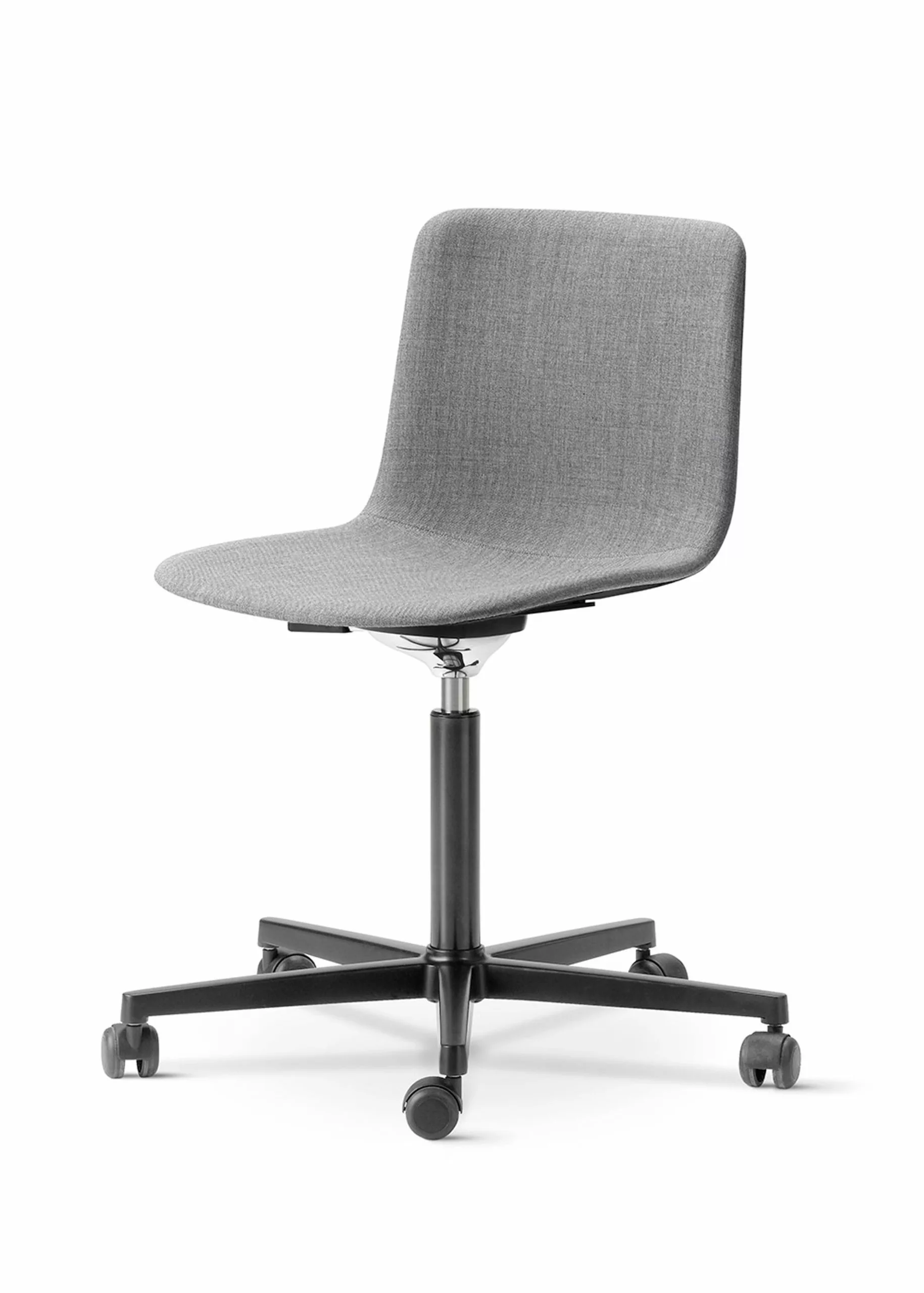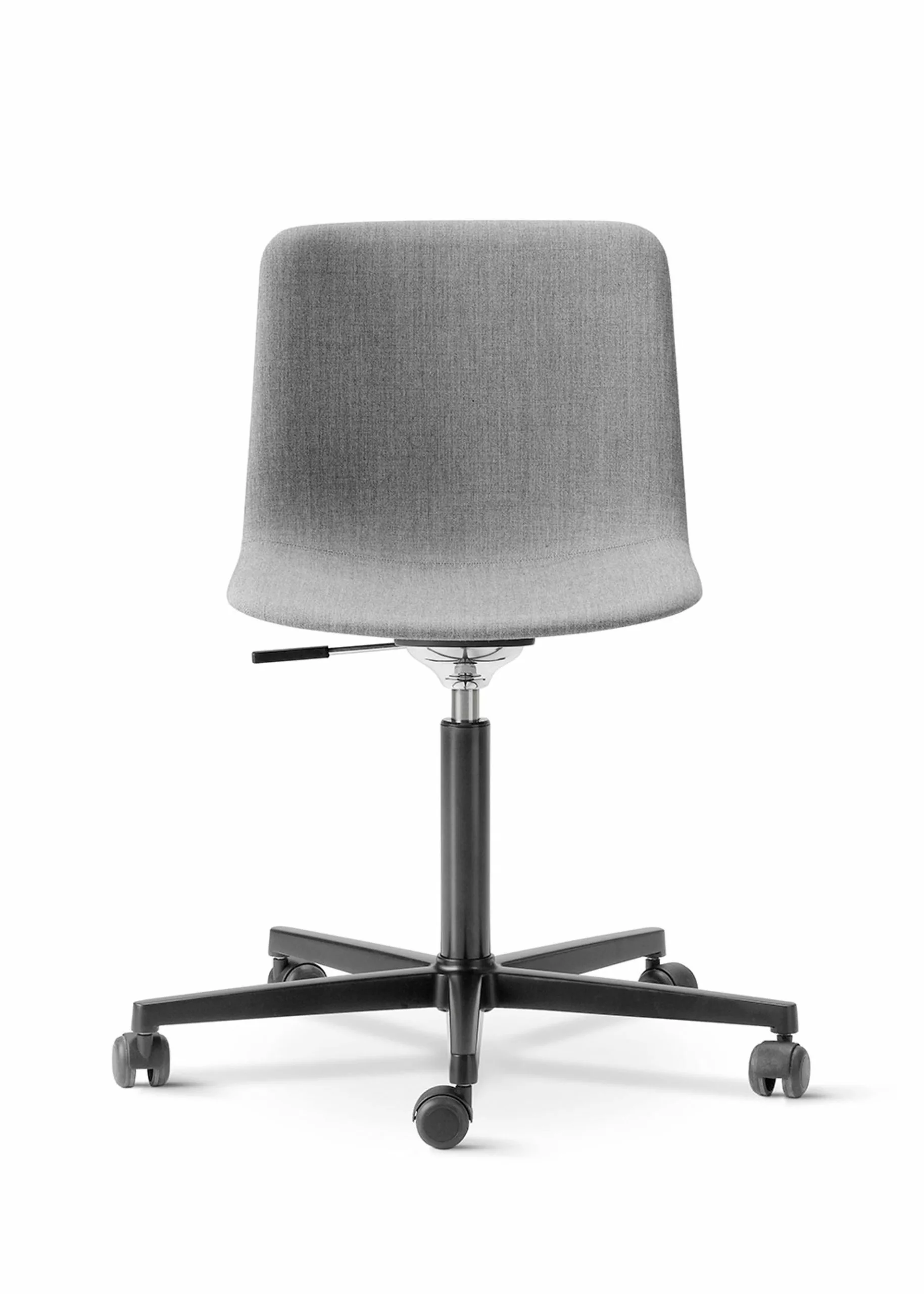 - Frame in polished aluminium or powder coated steel. Seat upholstered in CMHR foam, covered in desired textile or leather. Supplied with standard matching castors as well as height-adjusting function.