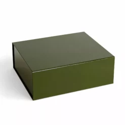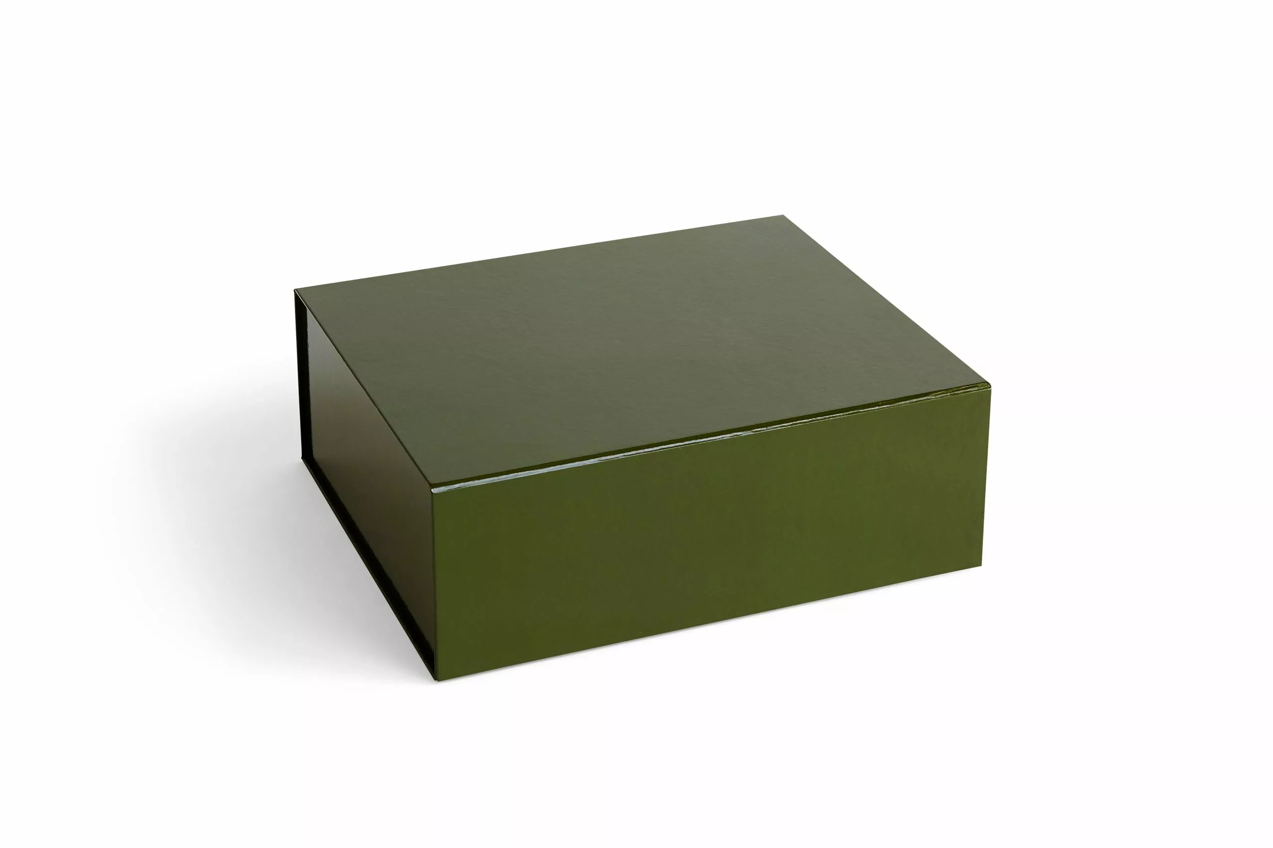Colour Storage from HAY. This is a series of decorative and useful storage containers. The rectangular shape of the box is made from a durable extra thick FSC certified cardboard blend. A beautiful glossy finish has been applied to the top of the box. Use the boxes to organise and store small items on your desk, shelves or in cupboards.The boxes are available in 3 different sizes and come in a wide range of beautiful colours. Use the boxes in your interior design for example by stacking the boxes. There are options for colourful displays or just simple statements in the home.