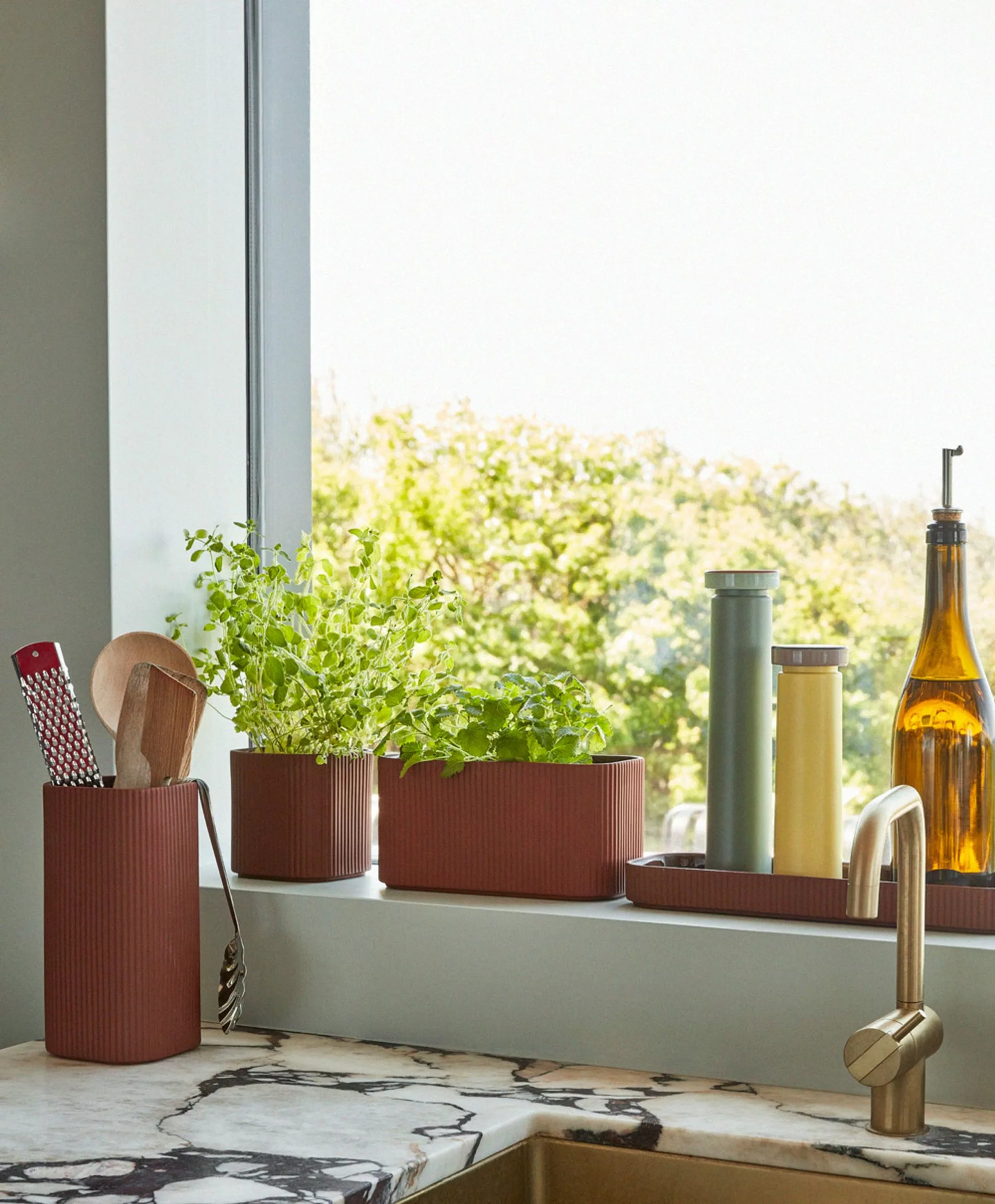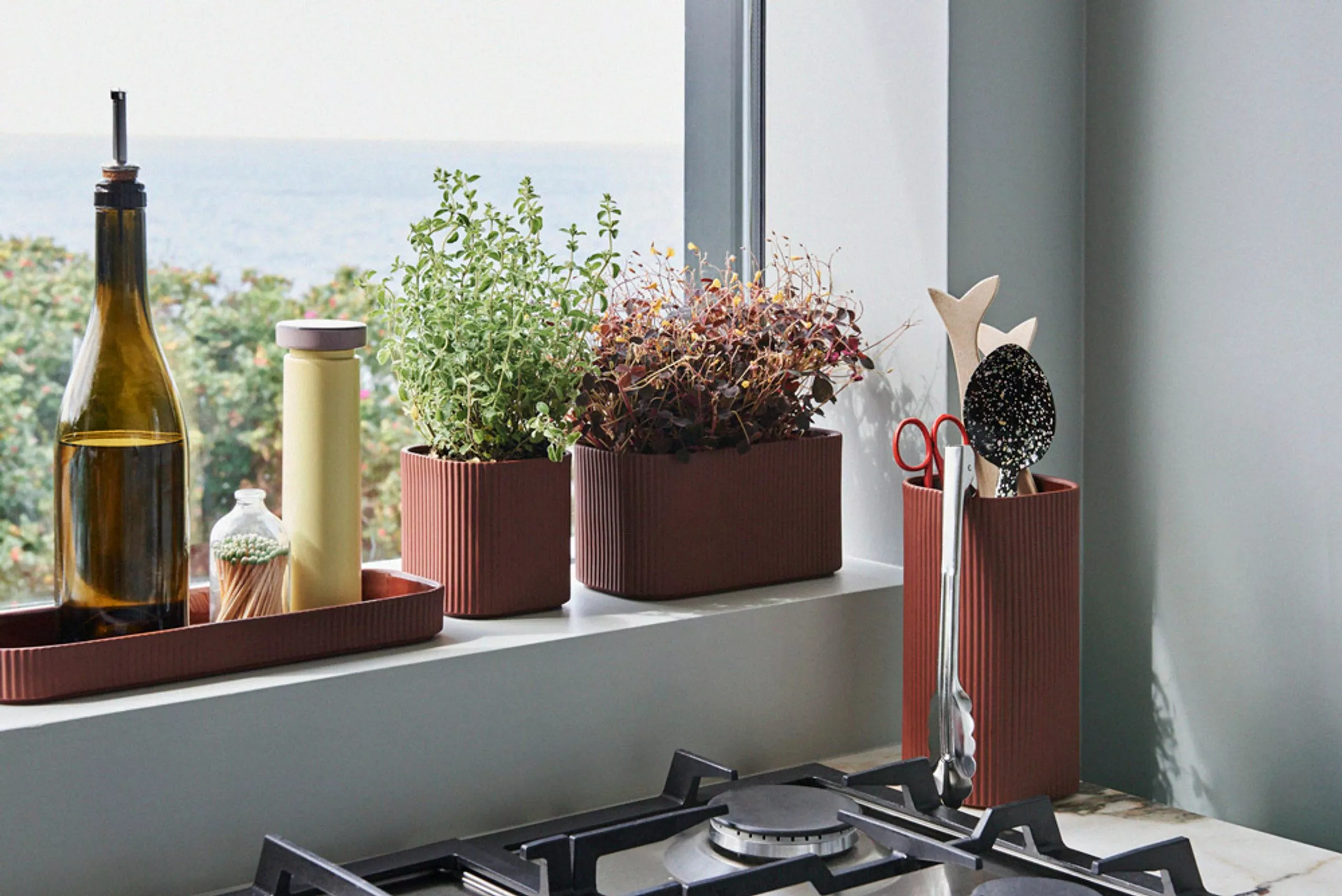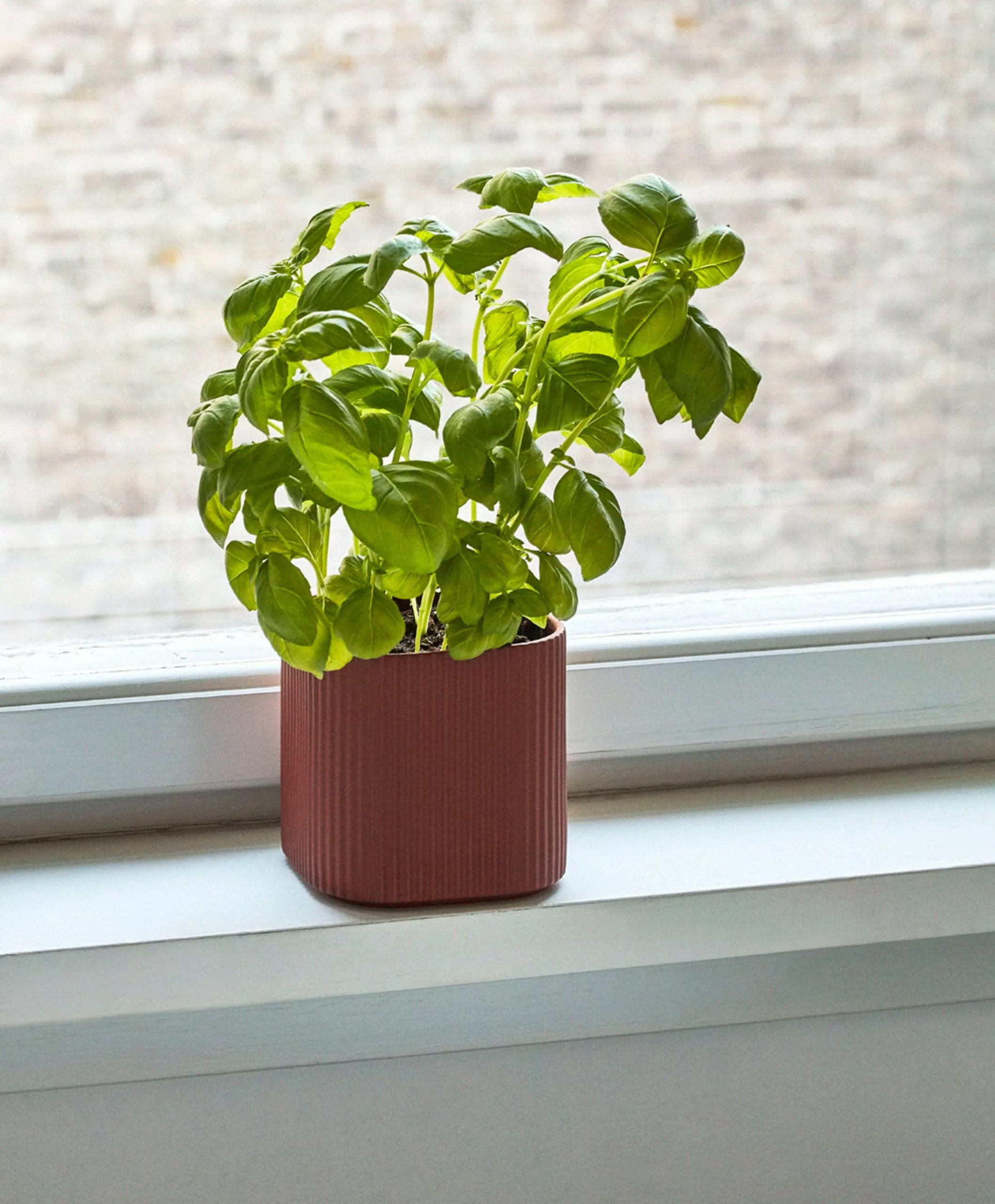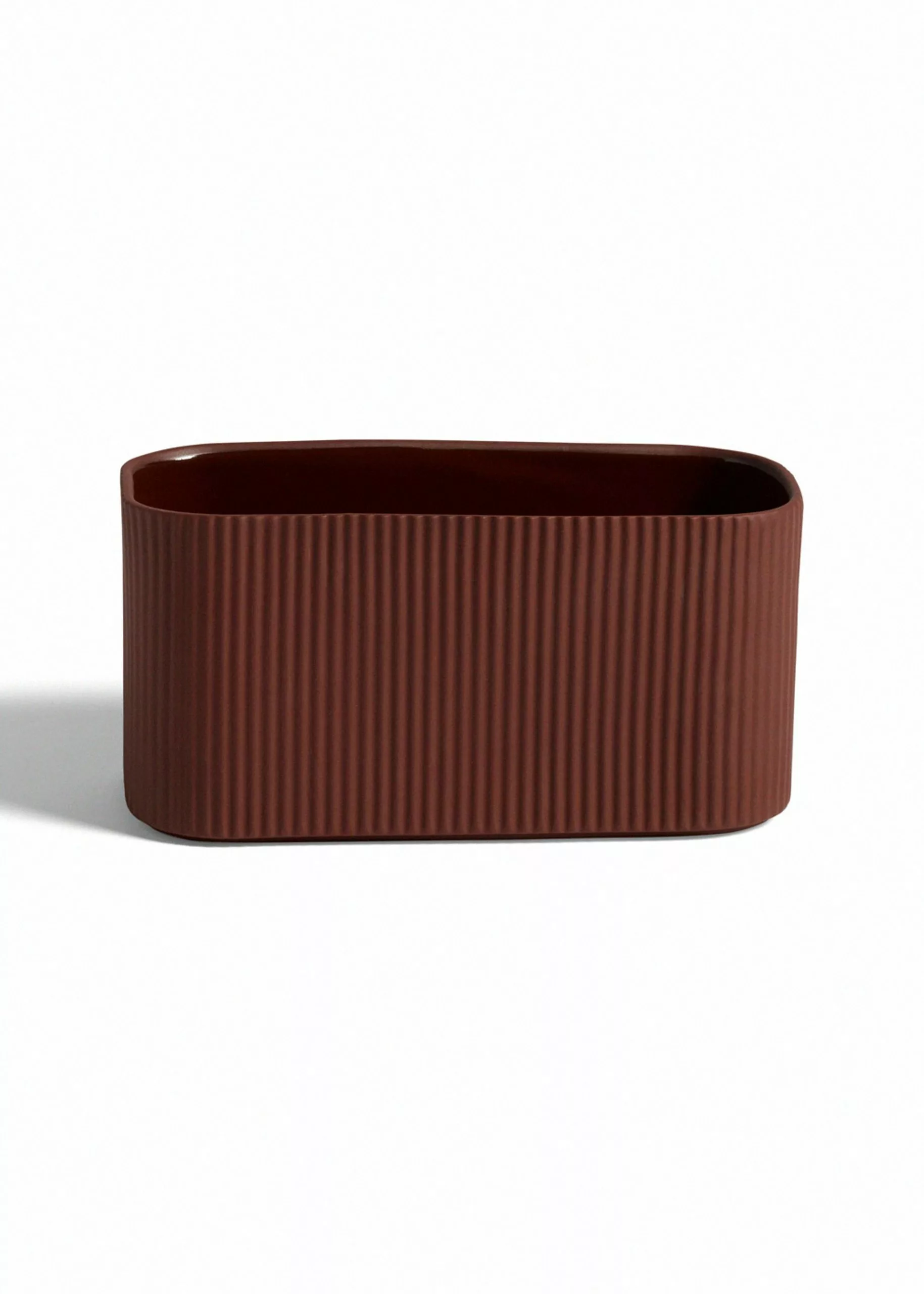 The facade mini series consists of four beautiful stoneware elements that create the perfect set for both the kitchen, living room or bathroom. The dark terracotta color with the matte ribbed edge and glazed inside has an organic and deep expression. The dish is perfect for serving or exhibiting fine decorative items. The vase is ideal for a beautiful bouquet or in the kitchen for essential utensils. And the pots work both for herbs and flowers or for food. The entire Facade series is intended for both food and oven