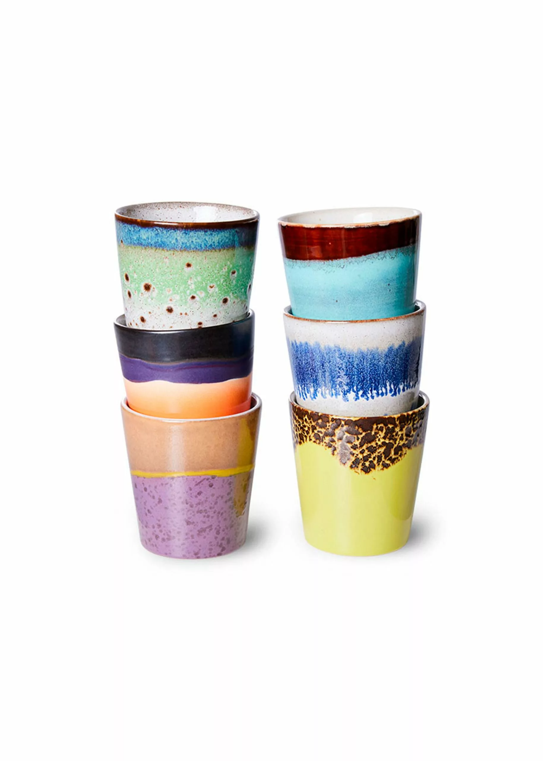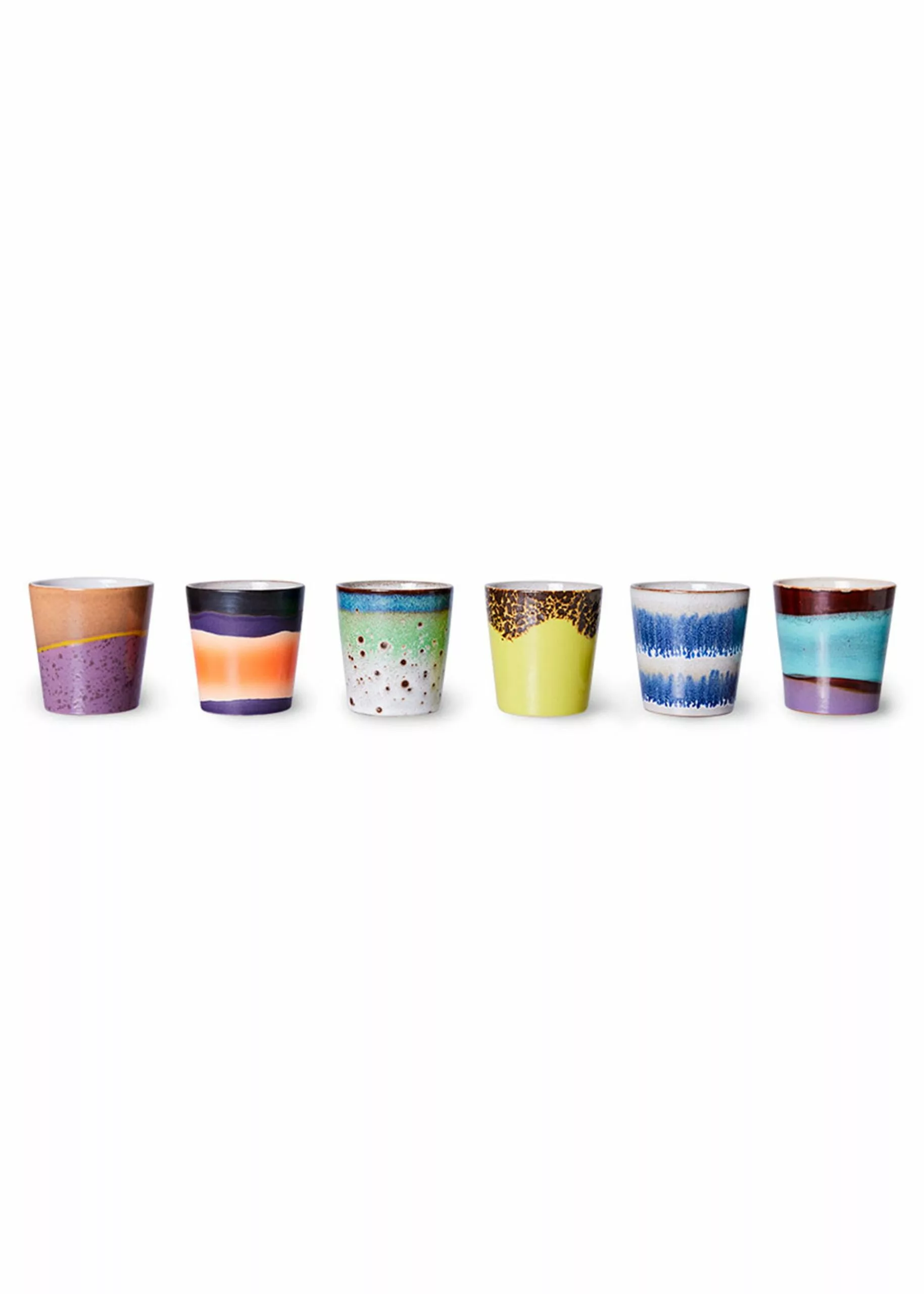 70s Coffee Mug from HK Living is a set of fine coffee mugs in several different colours and patterns. The cups are perfect for a delicious cup of coffee. The 70s collection is a mix of the modern pastel colours and the retro look reproduced in a cup. The entire 70s range is made from handmade stoneware, which helps to give variations in colour and pattern, so each mug is unique.