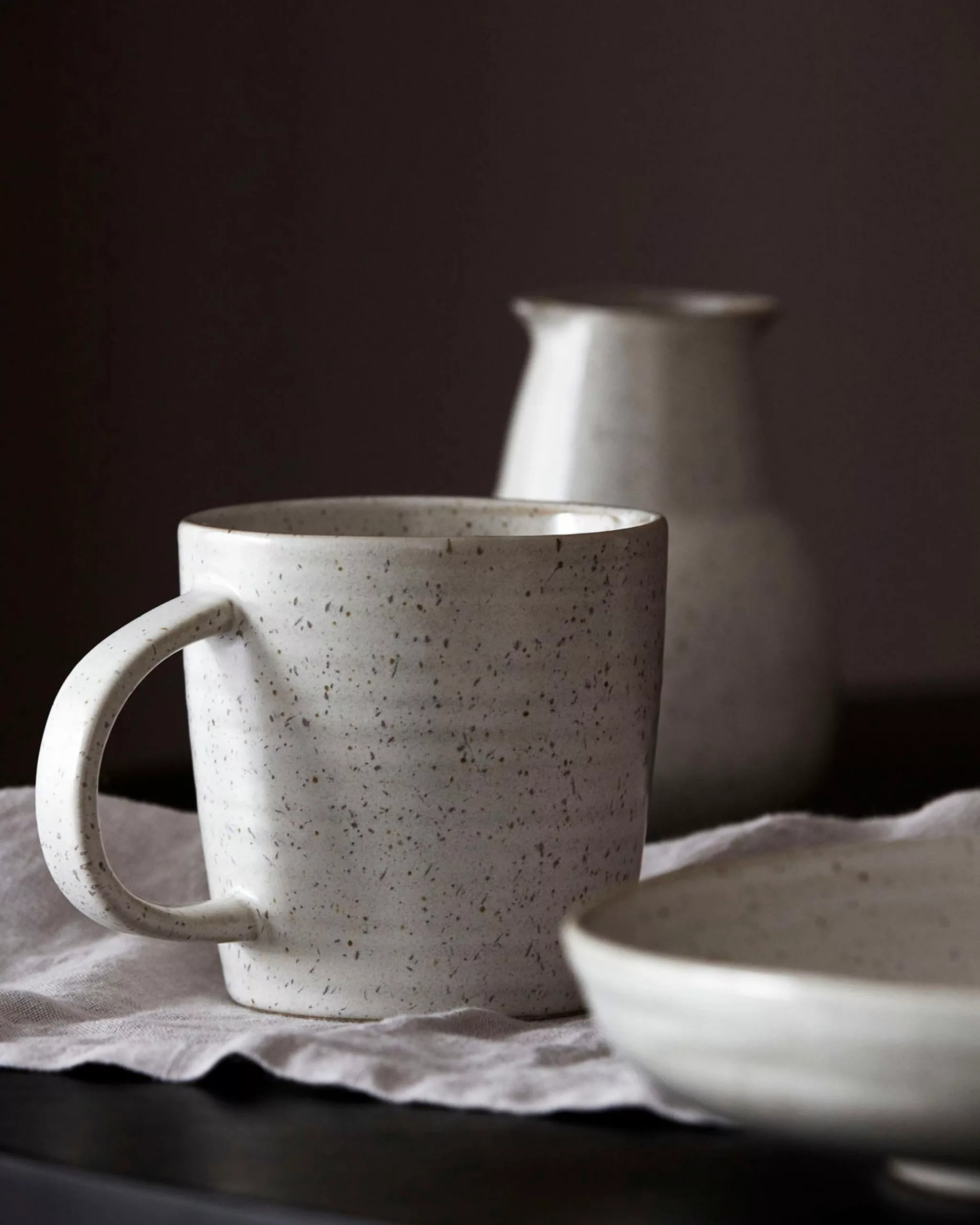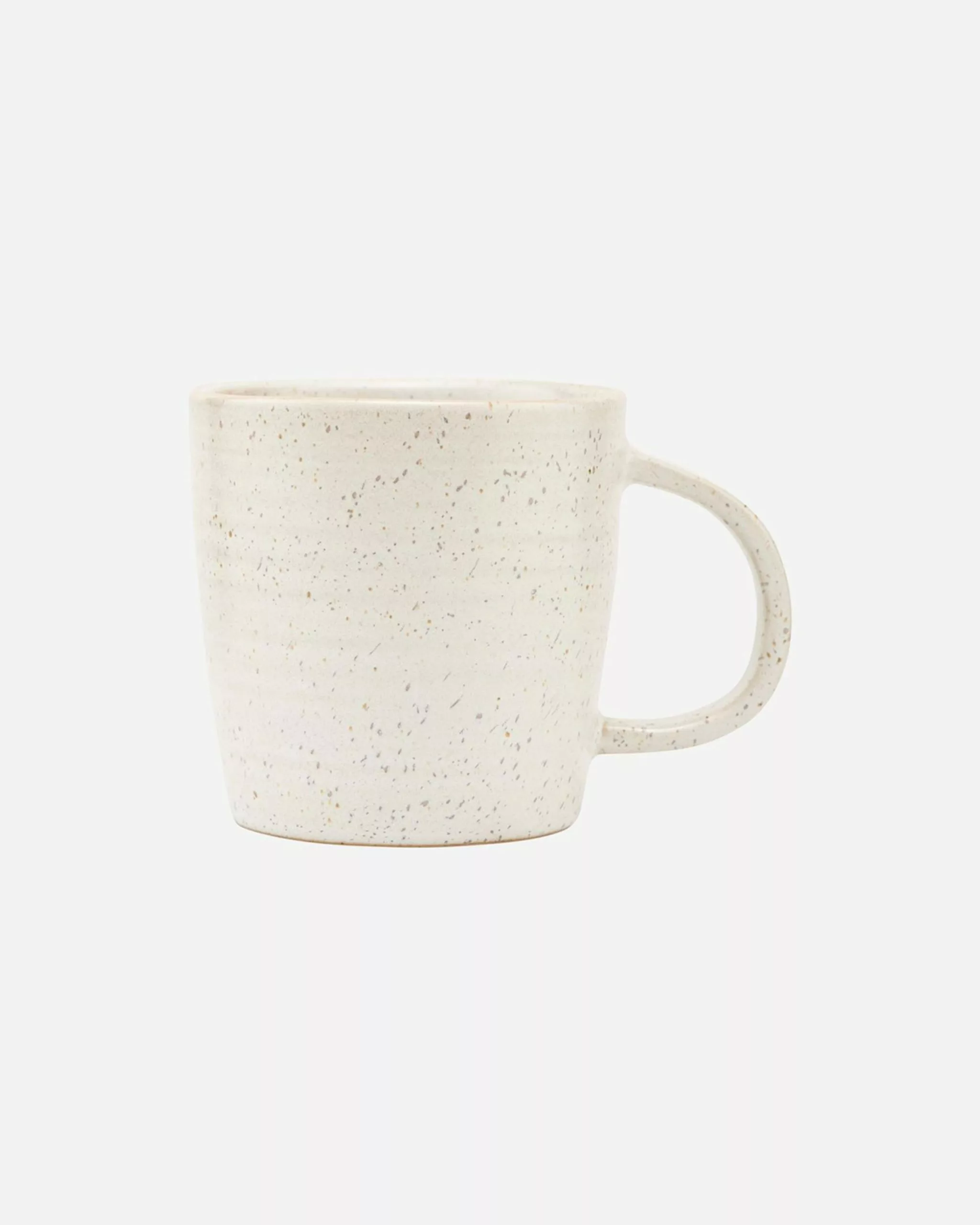 Pawn: The large handle creates a balance in the design and makes the cup comfortable to hold. It is made of porcelain and has been given a white and frosted glaze with plates, creating an everyday look and feel.