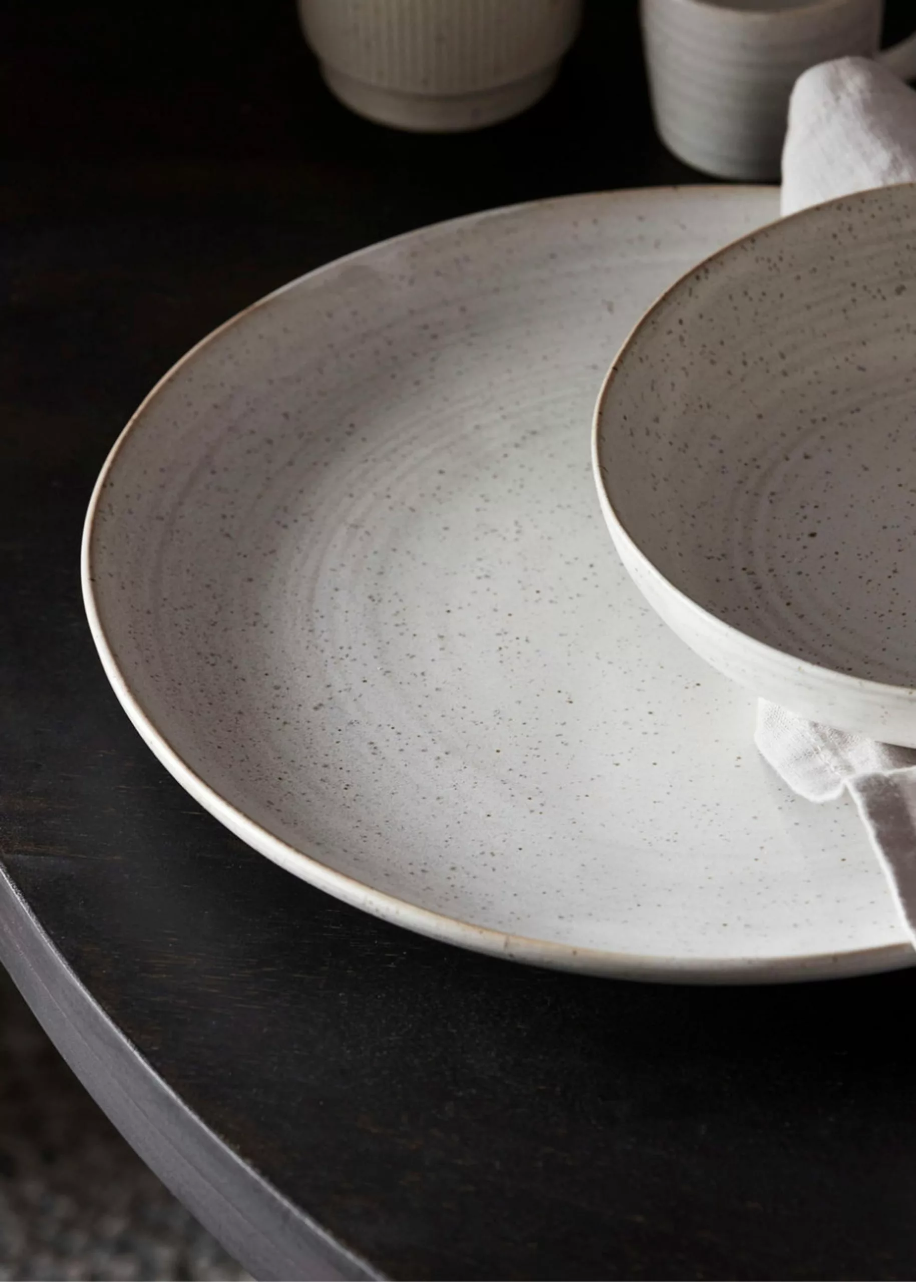 Dish: The white glaze with flecks creates a beautiful look that is modern for everyday use and informal gatherings. Add your favourite napkins and glasses. The perfect setting for great food and conversation.