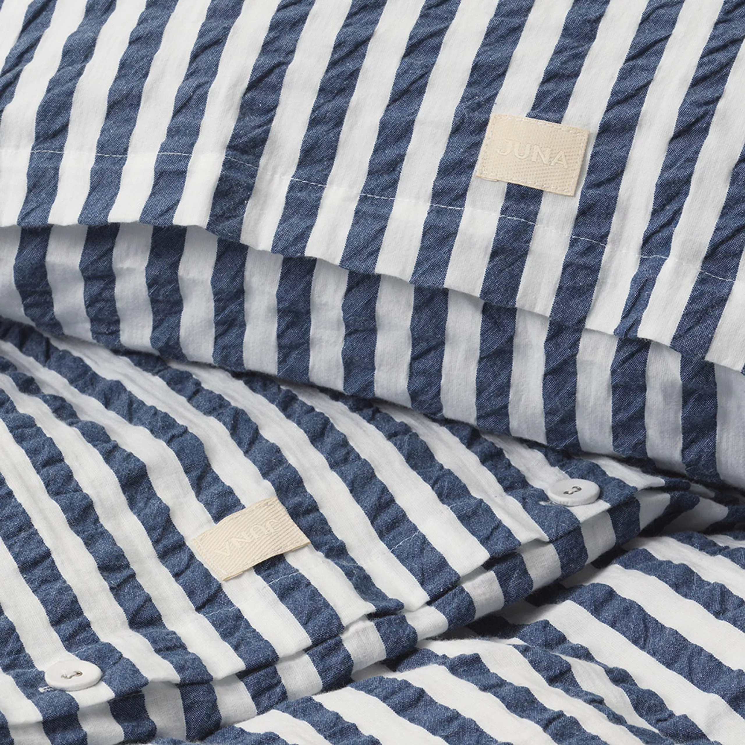 The beautiful 'Lines' bed linen from Juna is created in the same delicious quality as the classic 'Bæk&Bølge' bed linen, made of 100% cotton that is both OEKO-TEX® labelled and GOTS-certified. The bedding has the familiar textured texture, combined now with beautiful vertical lines in classic JUNA colours. The pillowcase closes with an envelope closure while the duvet cover closes with delicate matching buttons.