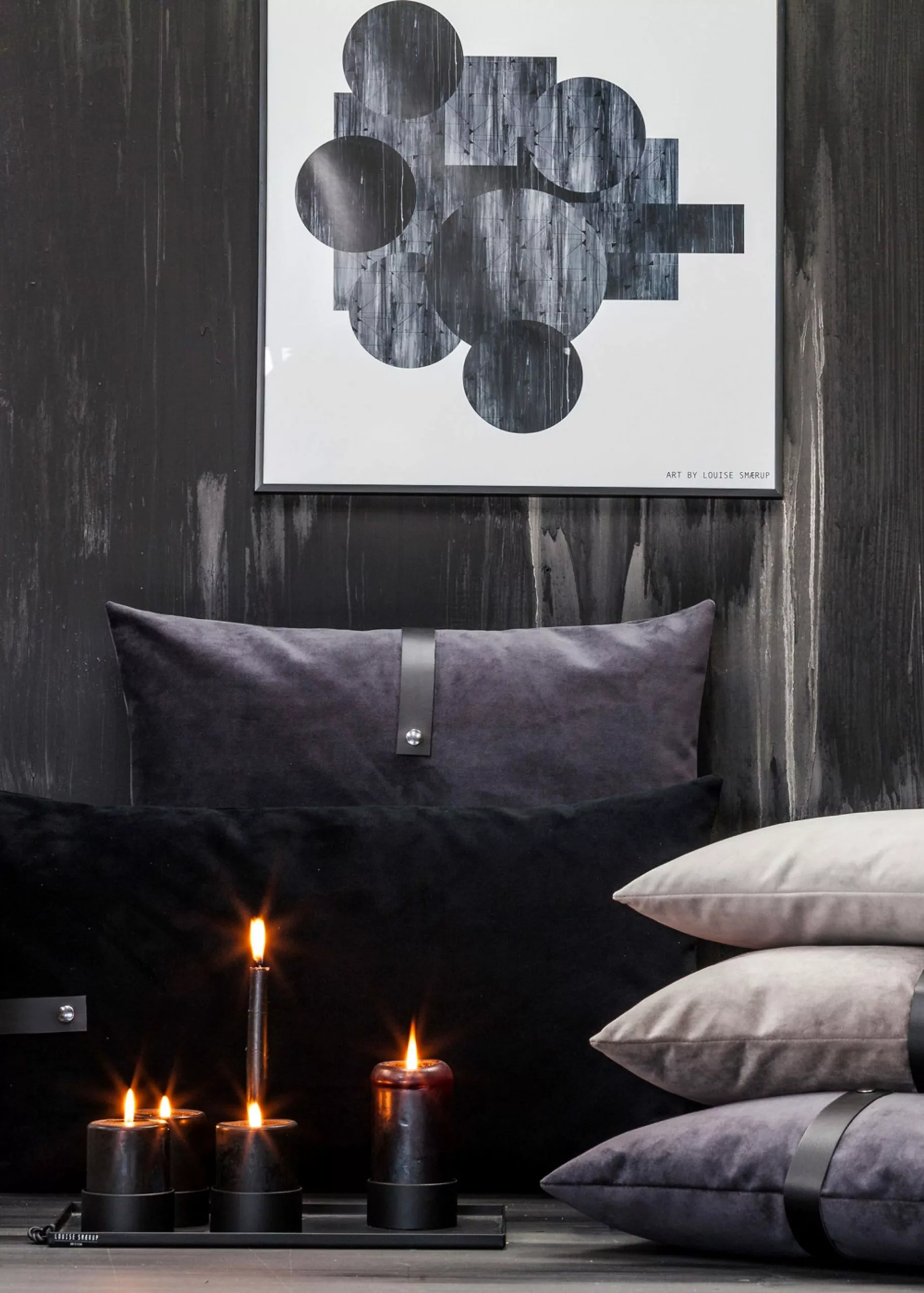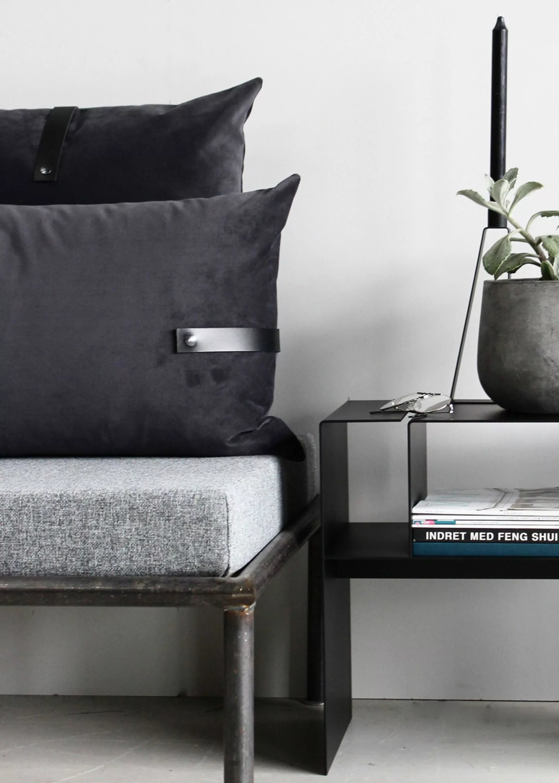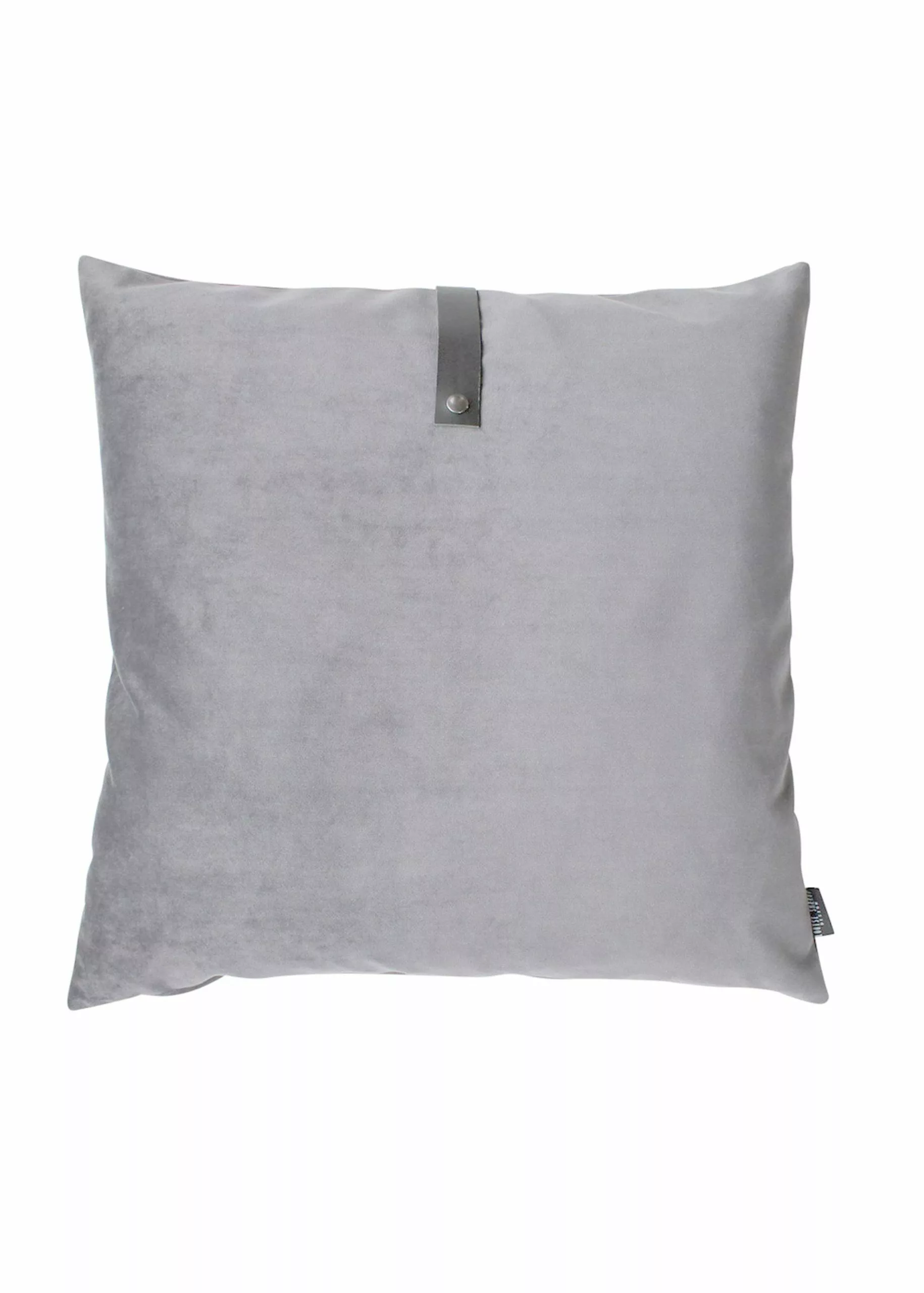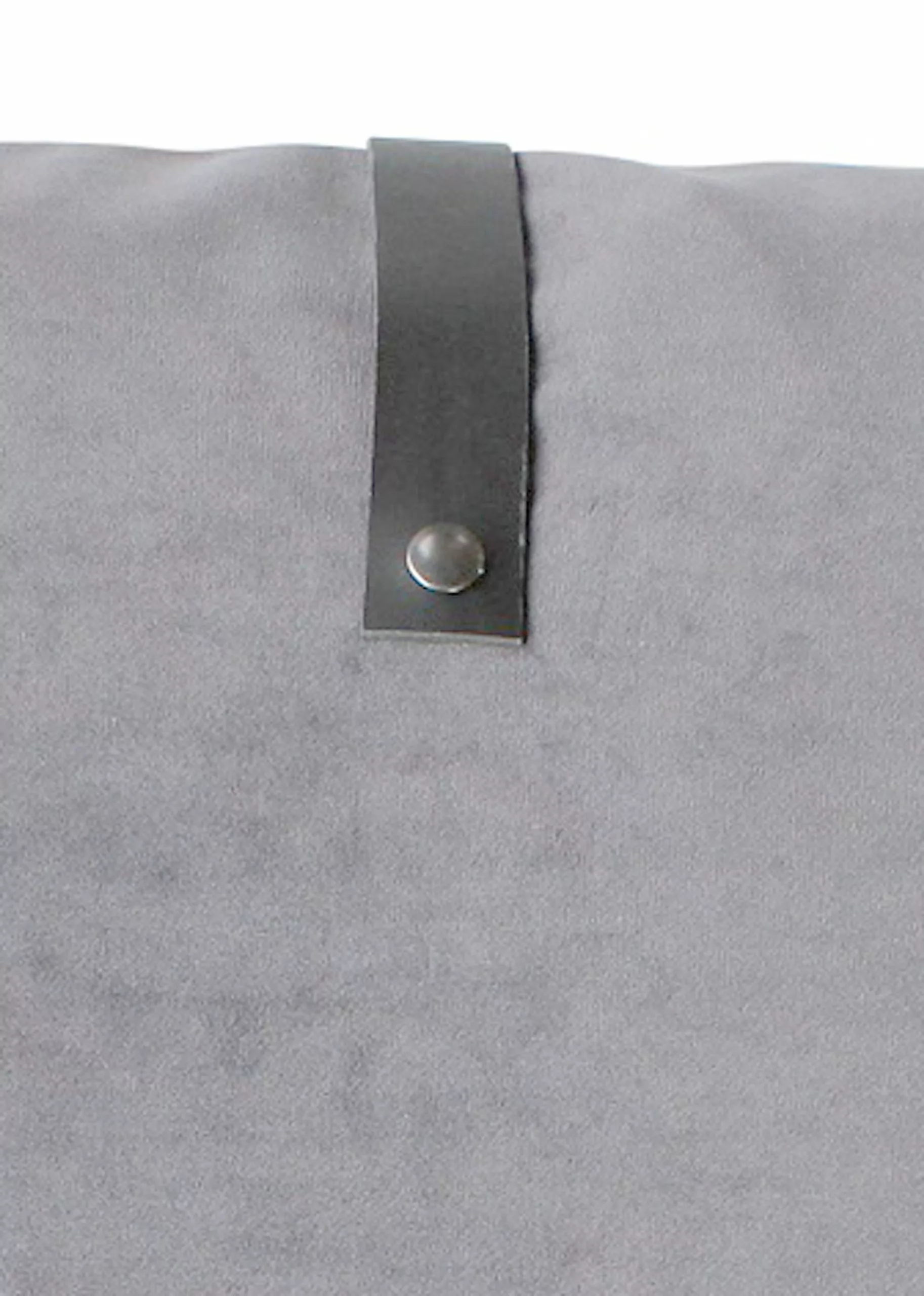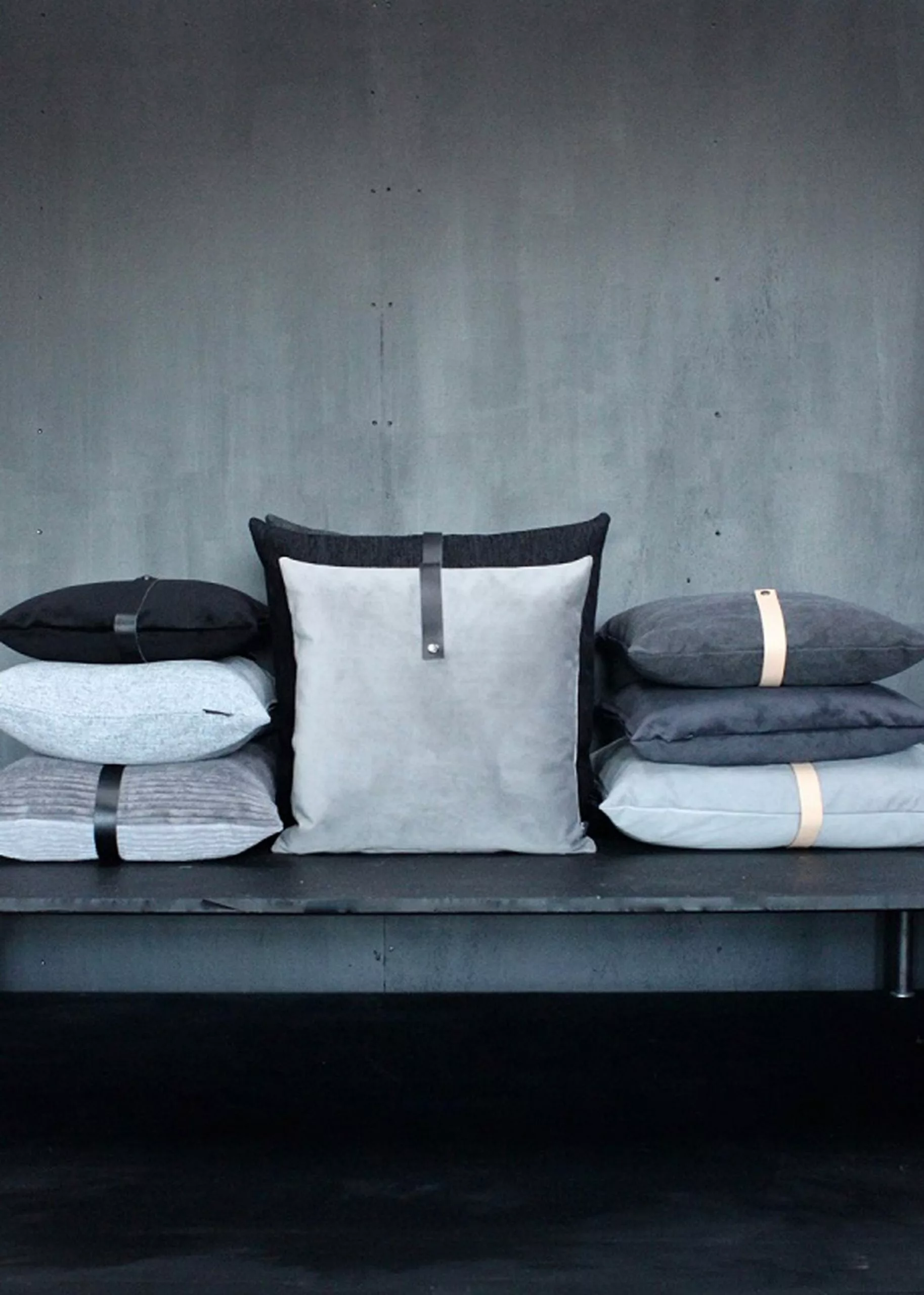Velour cushion of upholstery fabric with a rustic leather strap.