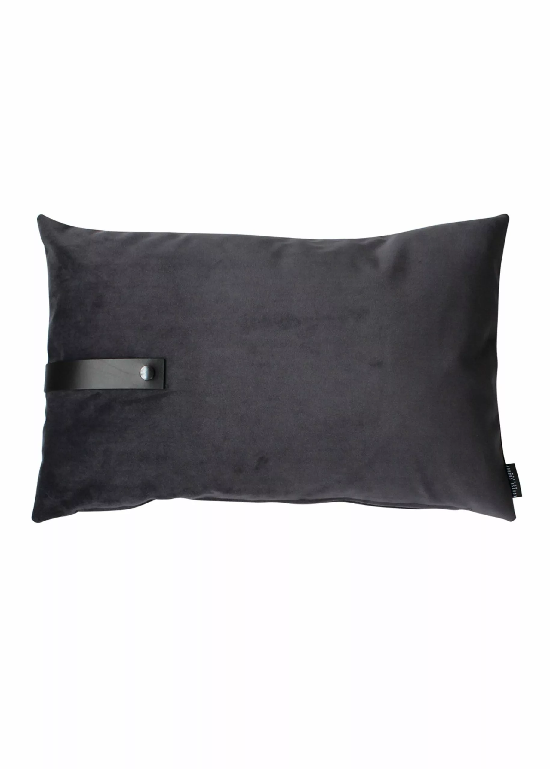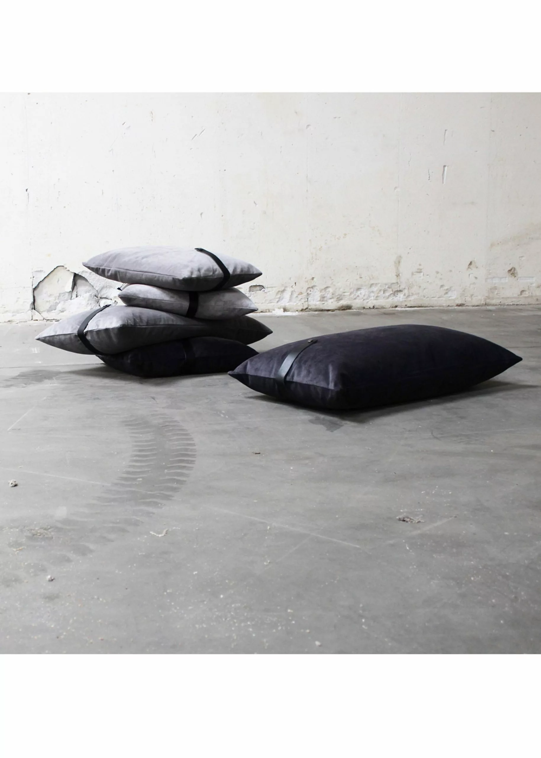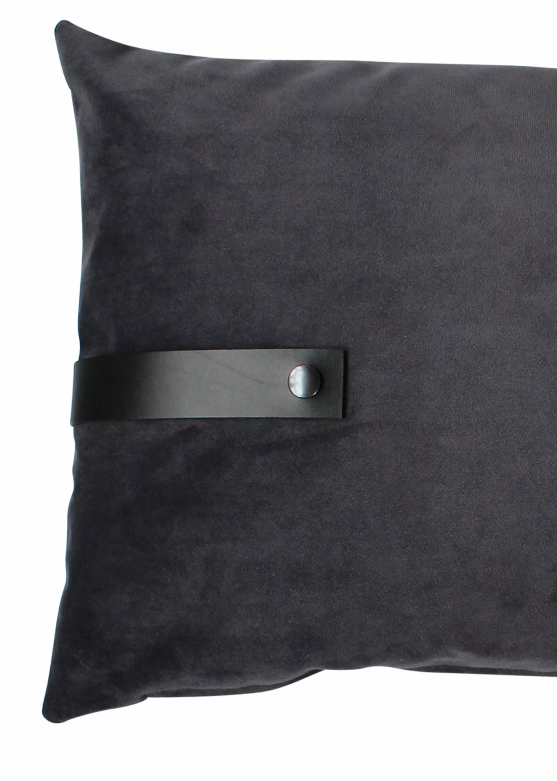 Velour cushion of upholstery fabric with a rustic leather strap.