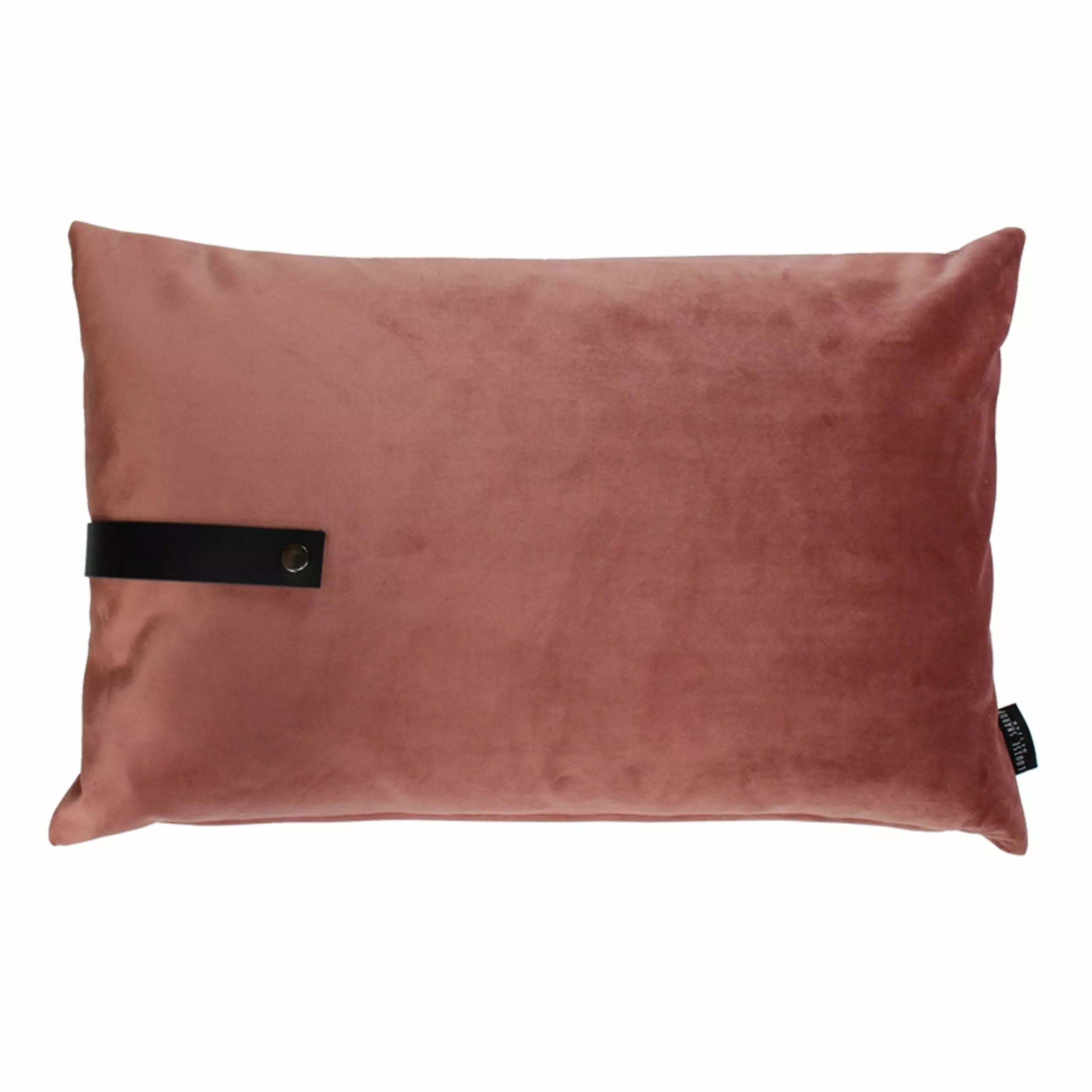 Velour cushion of upholstery fabric with a rustic leather strap.