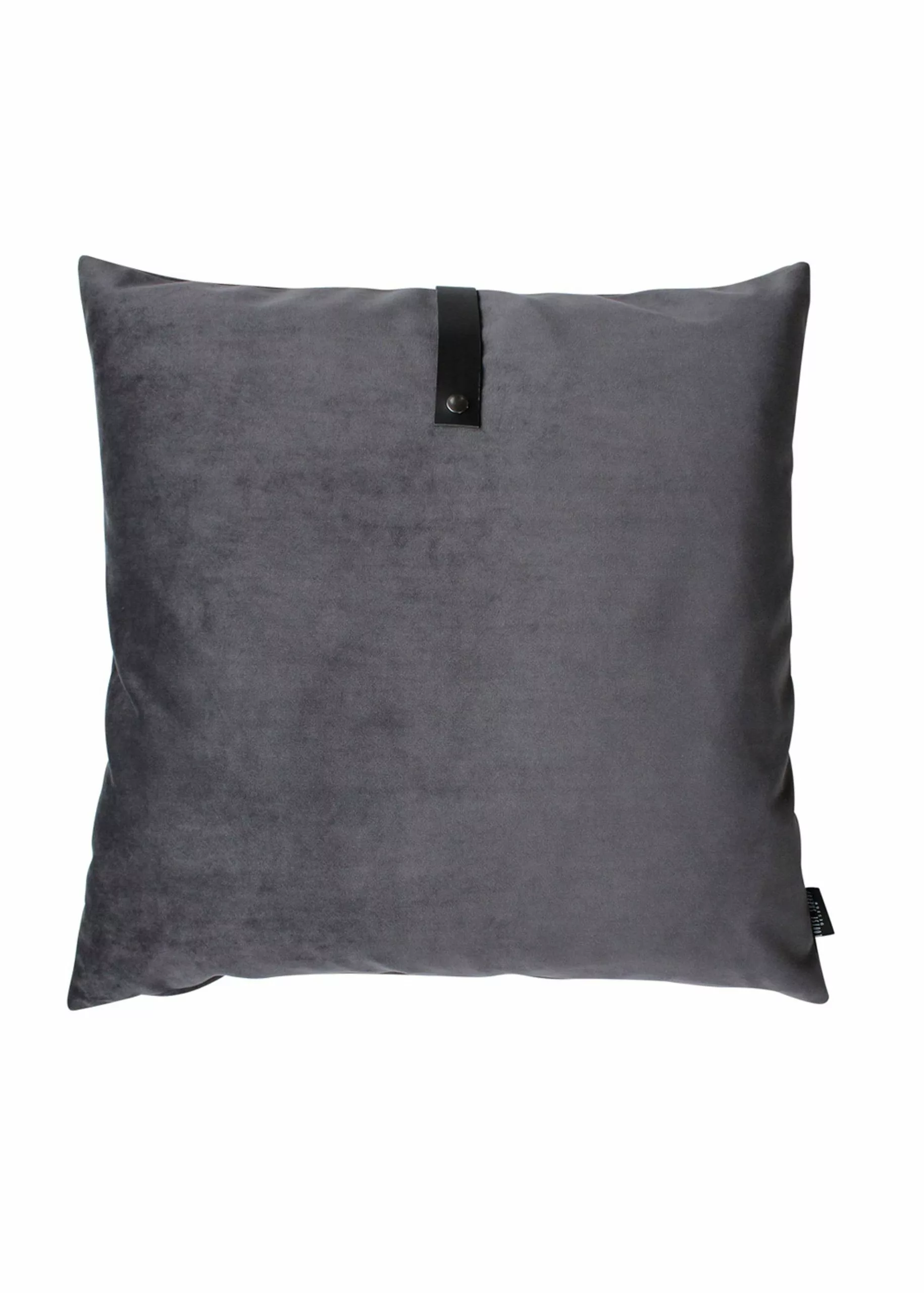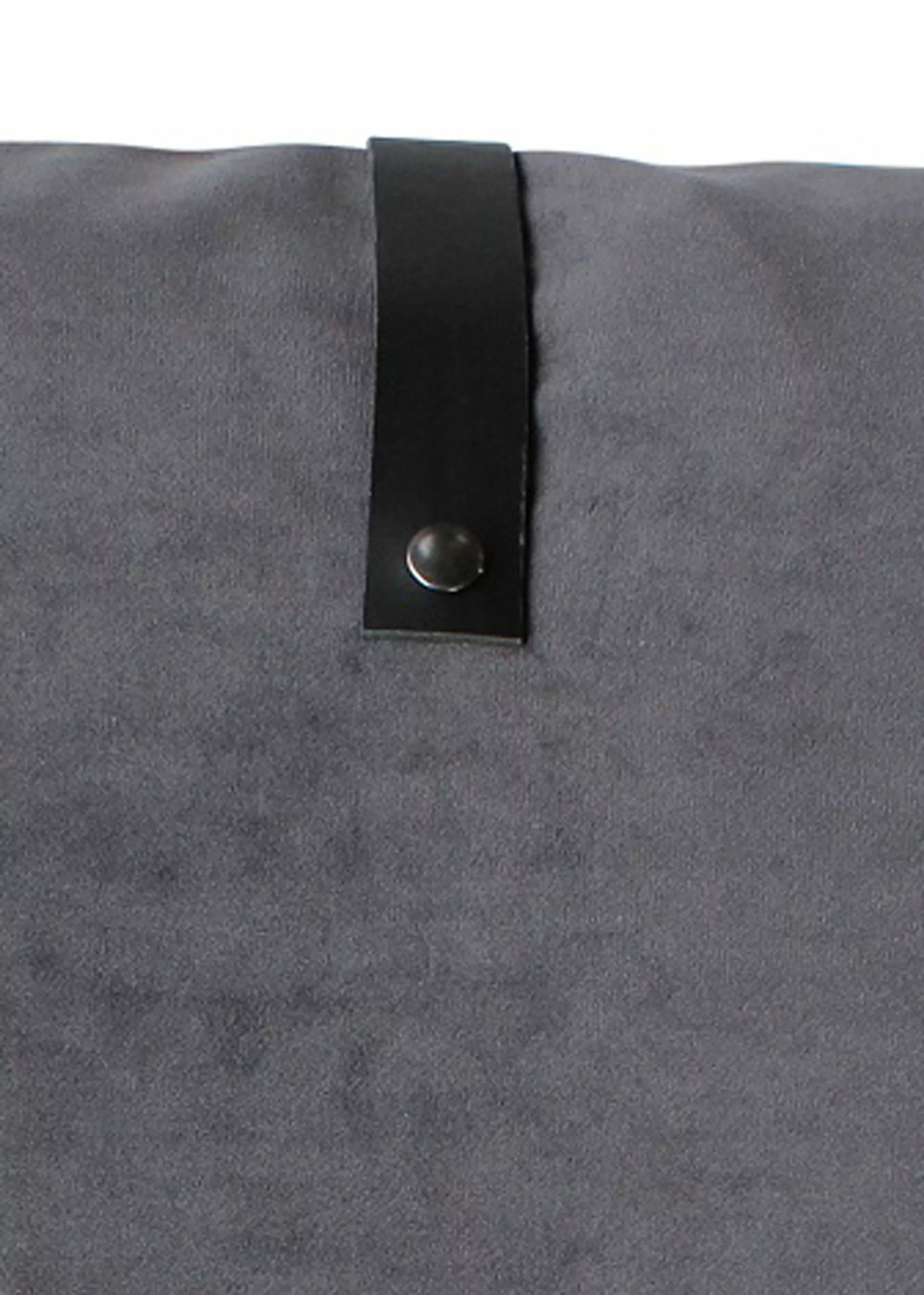 Velour cushion of upholstery fabric with a rustic leather strap.