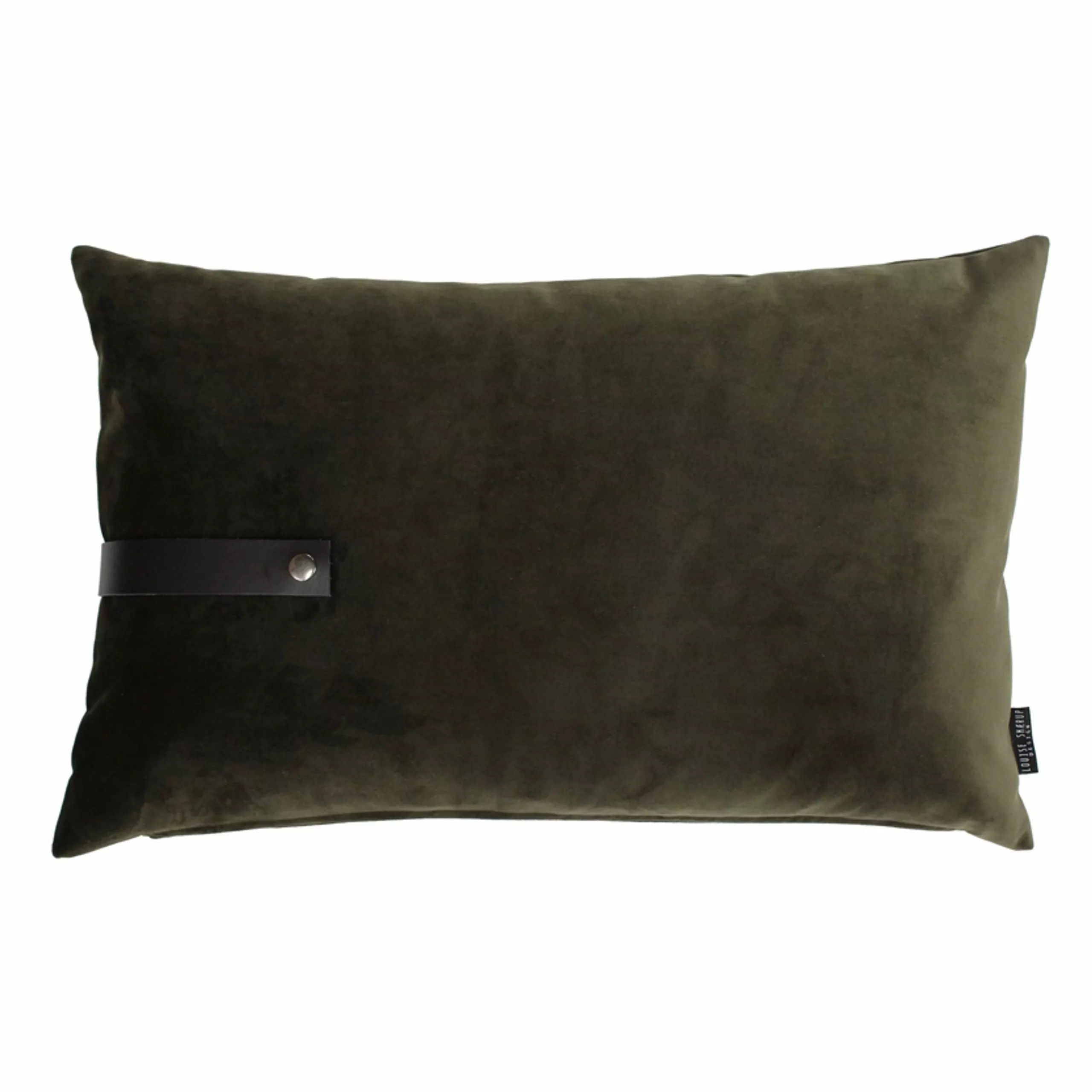 Velour cushion of upholstery fabric with a rustic leather strap.