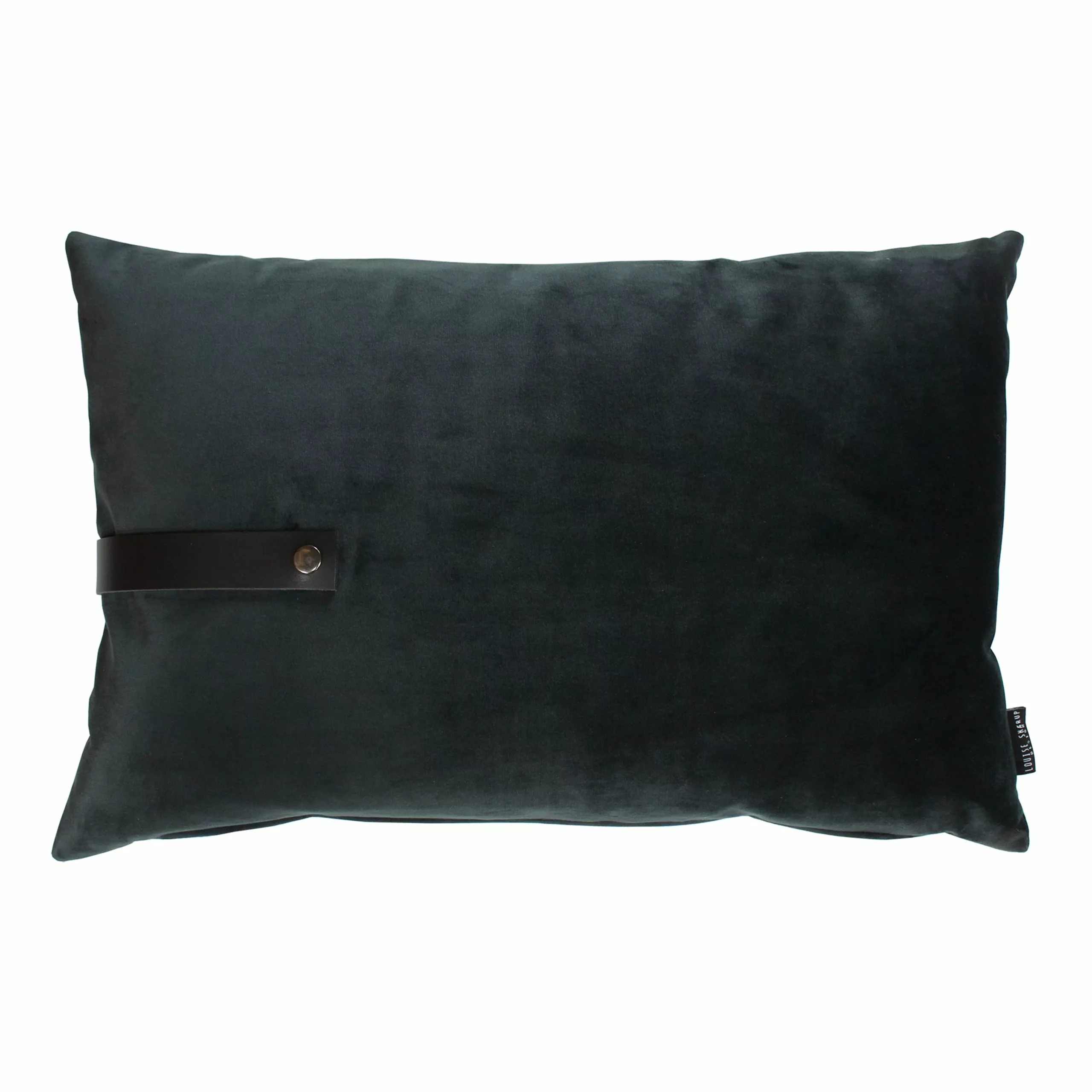 Velour cushion of upholstery fabric with a rustic leather strap.