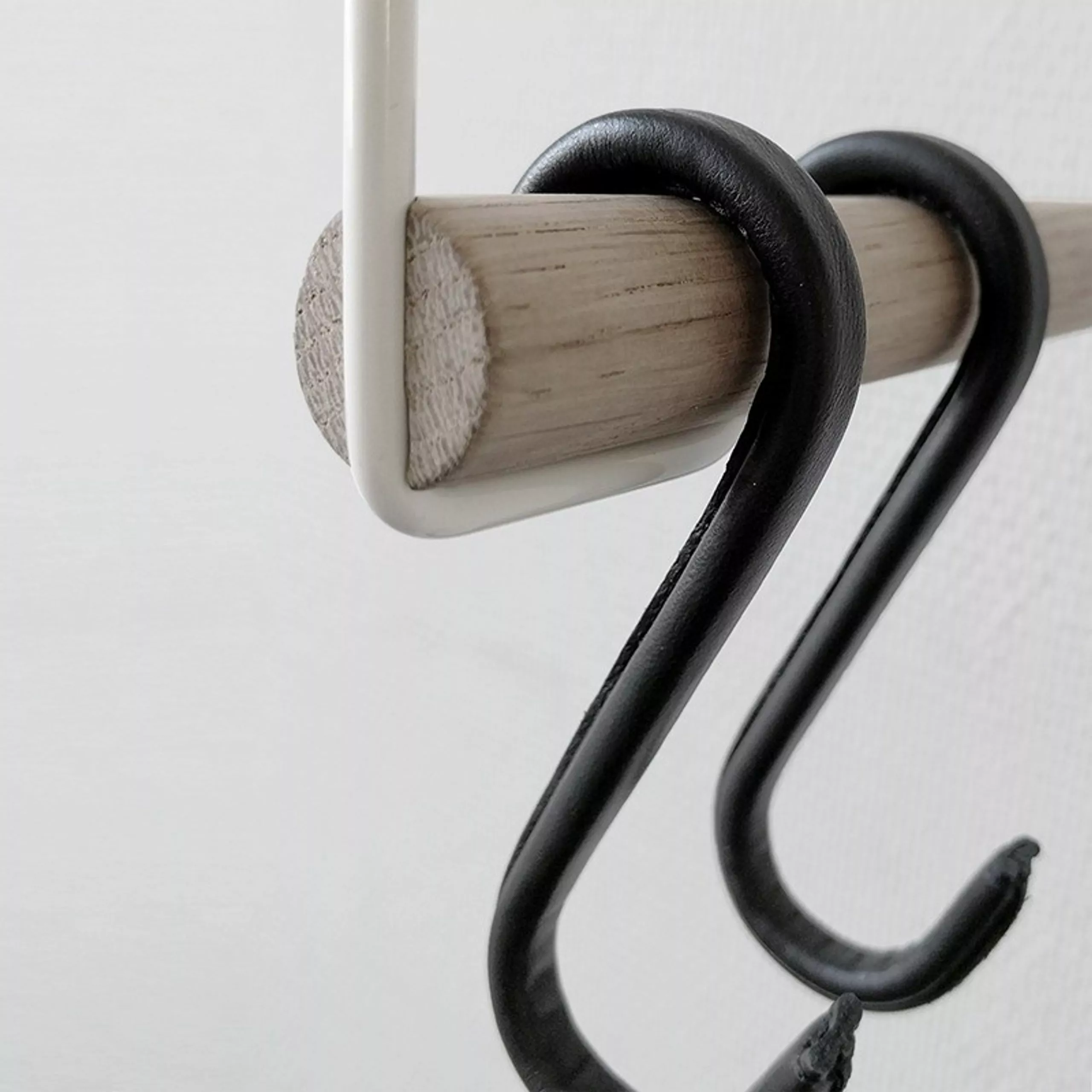 Upgrade is 3 s-hooks from Nordic Function. The s-hooks are made of steel covered with hand-sewn leather. Upgrade can be used for jackets, tea towels, towels and more instead of the traditional s-hooks made of metal. Upgrade has certain benefits. They are i.a. soft to the touch, and they do not make noise or scratch either.