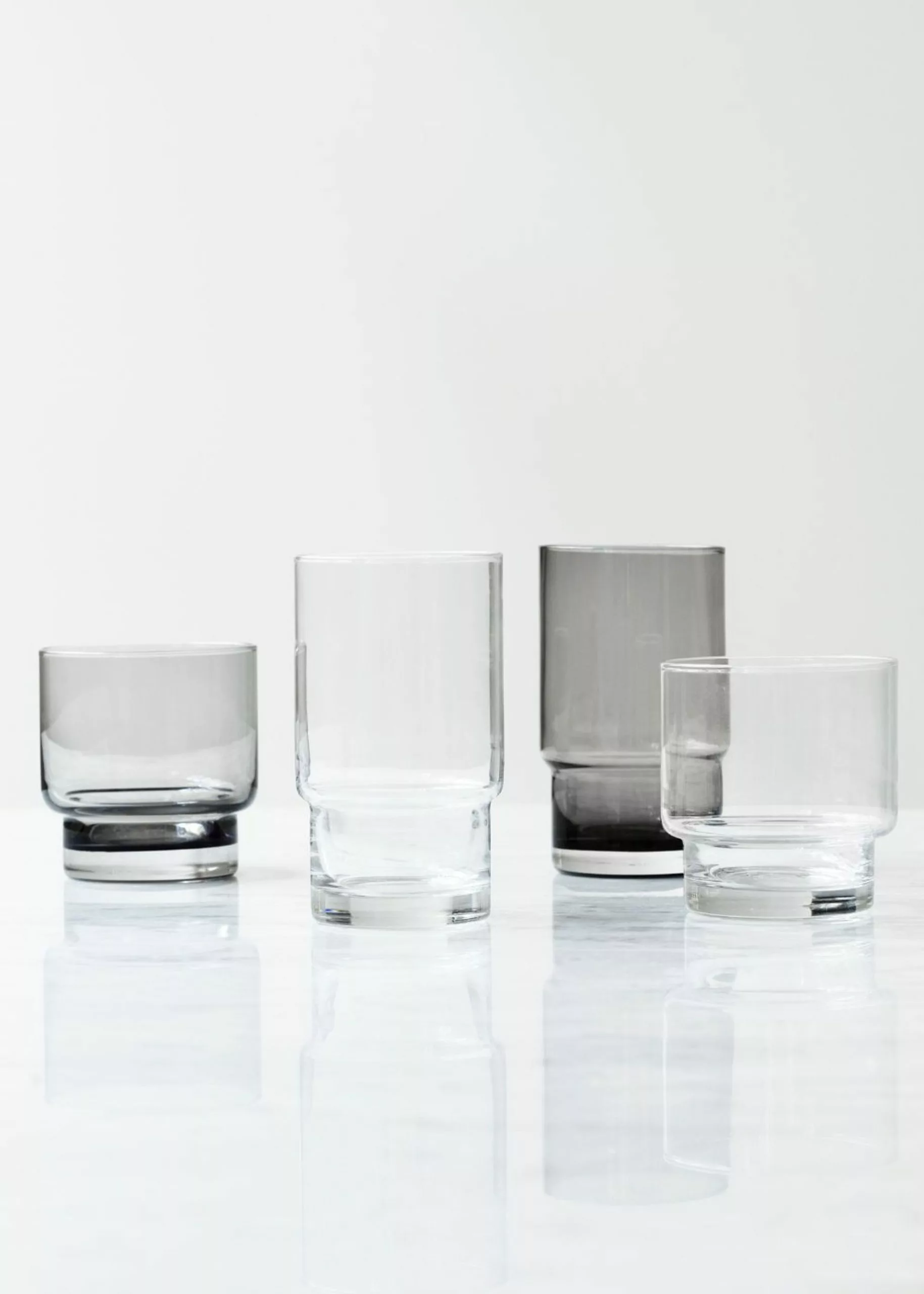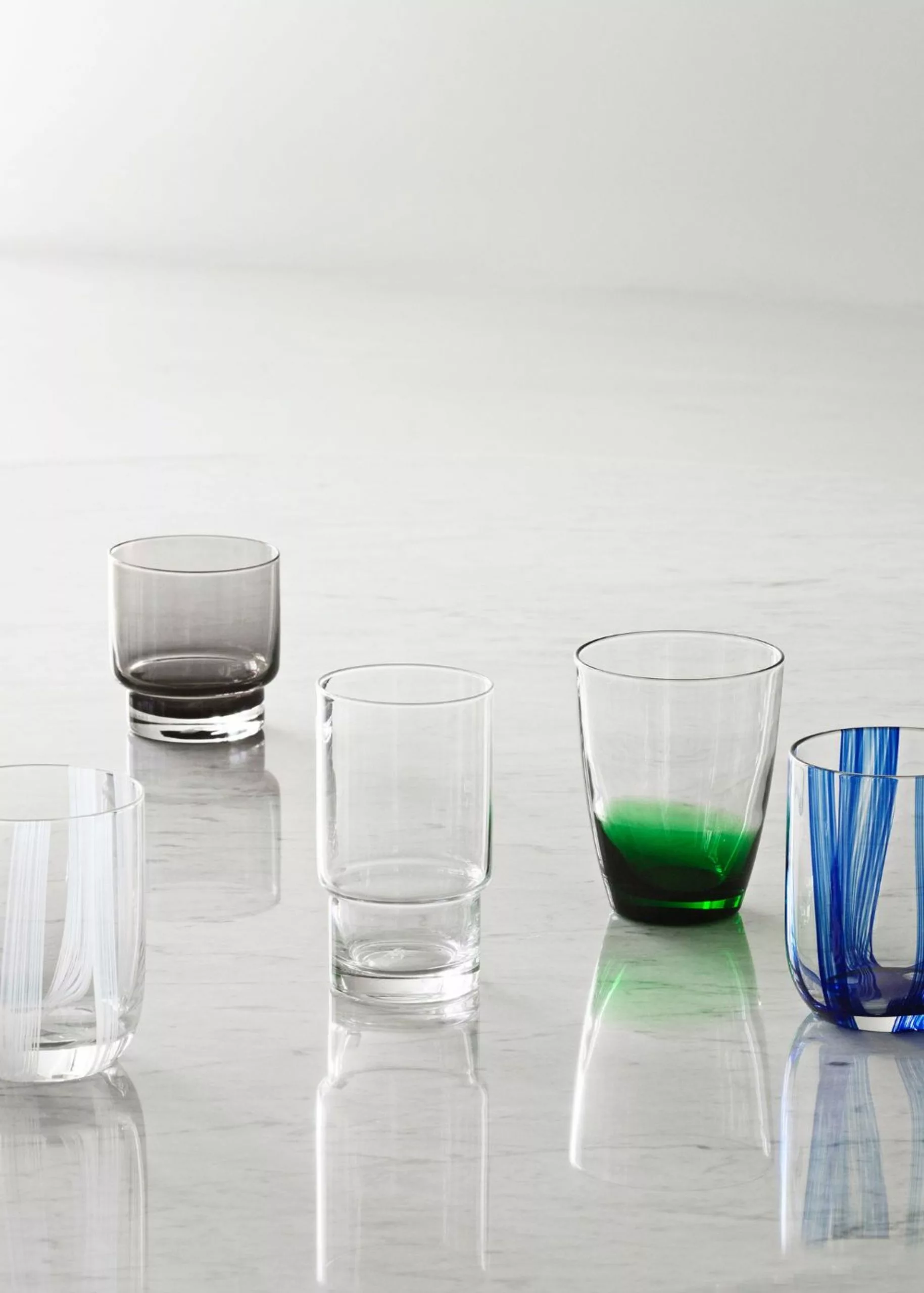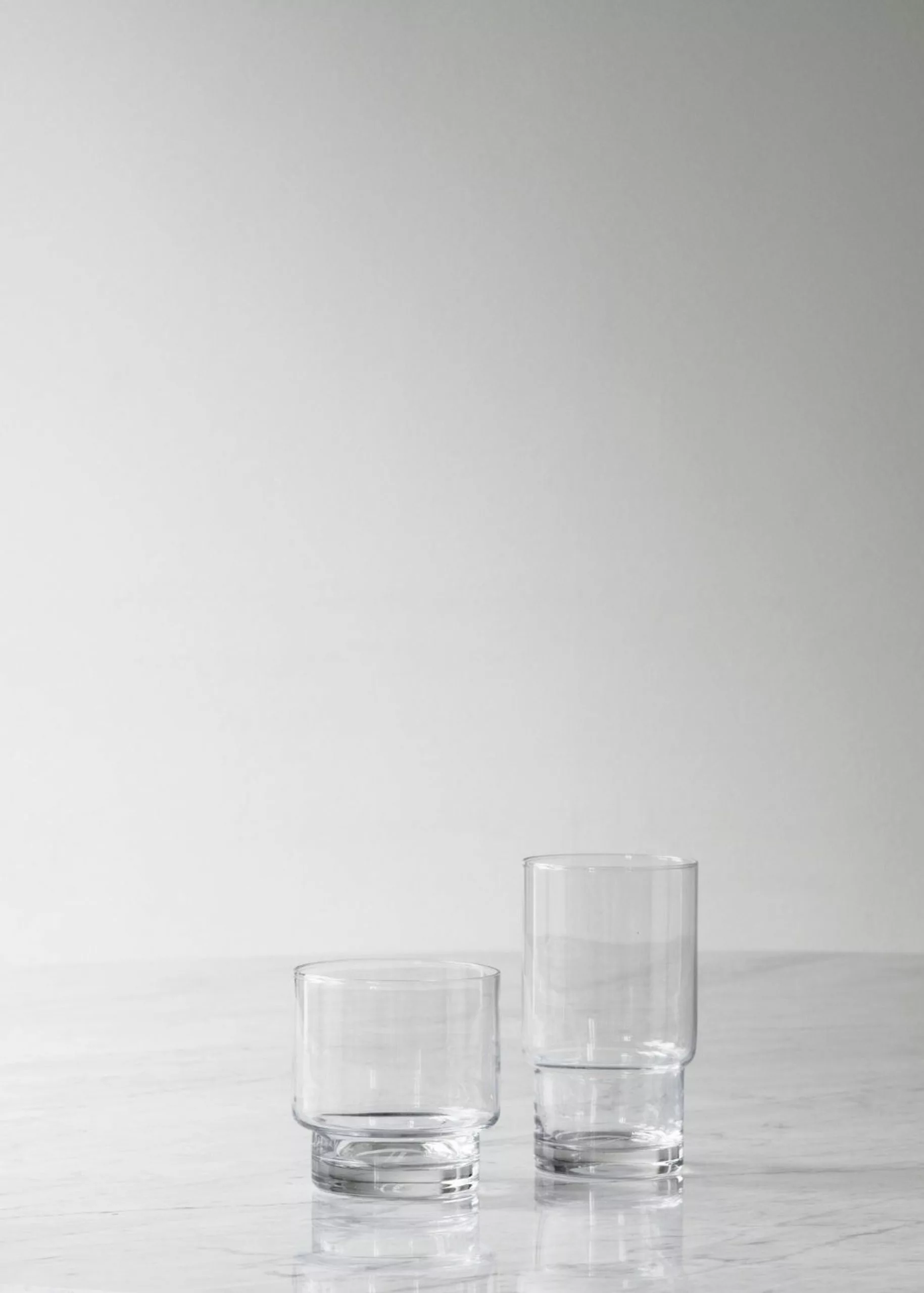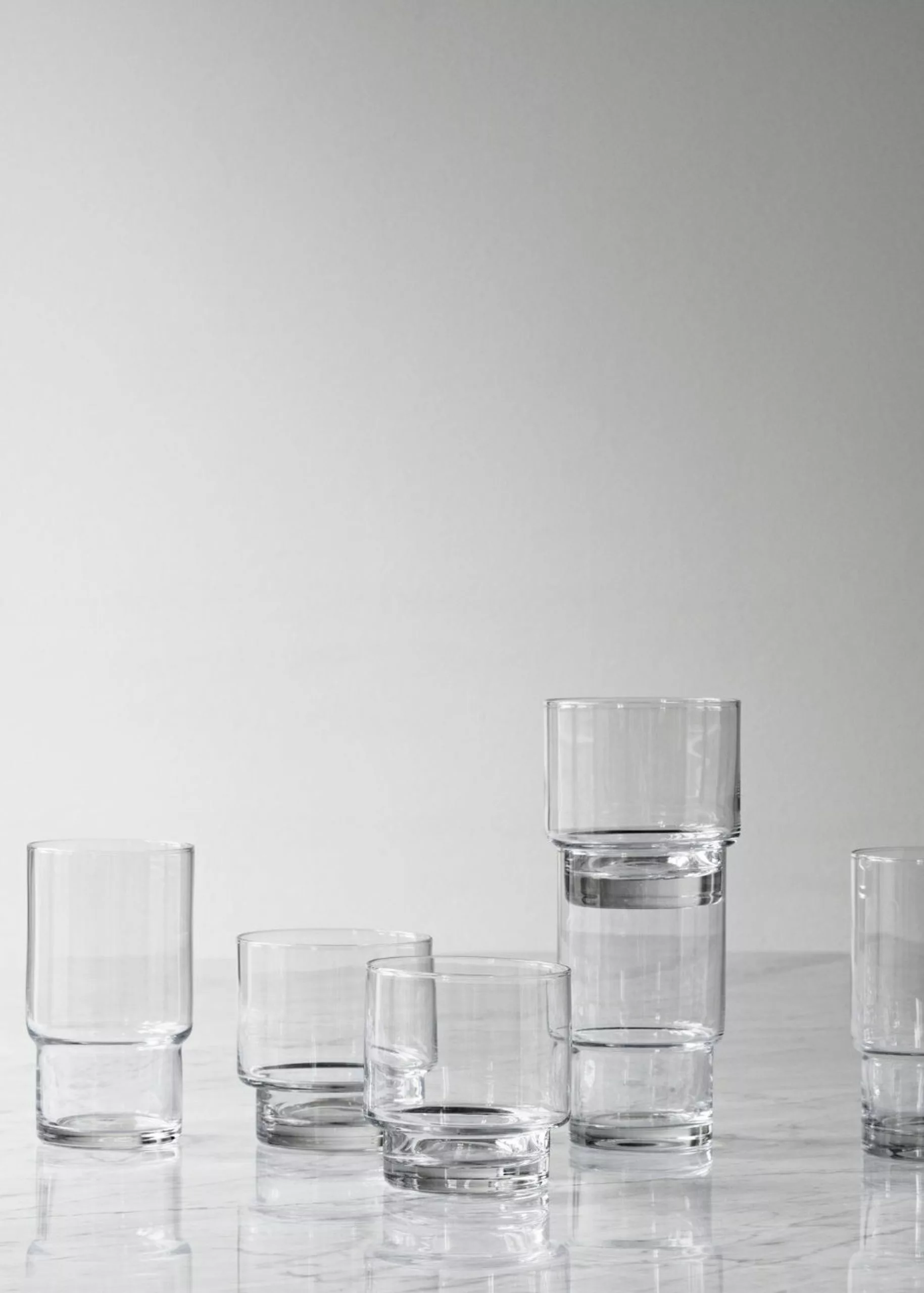 The Fit Glasses are part of Normann Copenhagen's series of glasses that are a little more than just glass. These glasses are not the standard glasses these glasses bring life to the table setting with a little colour. All the glasses in the series are not the same expression wise but they are the same size so they can be stacked. The glasses are completely unique which gives both a wild cool look on the shelf but also on the table.