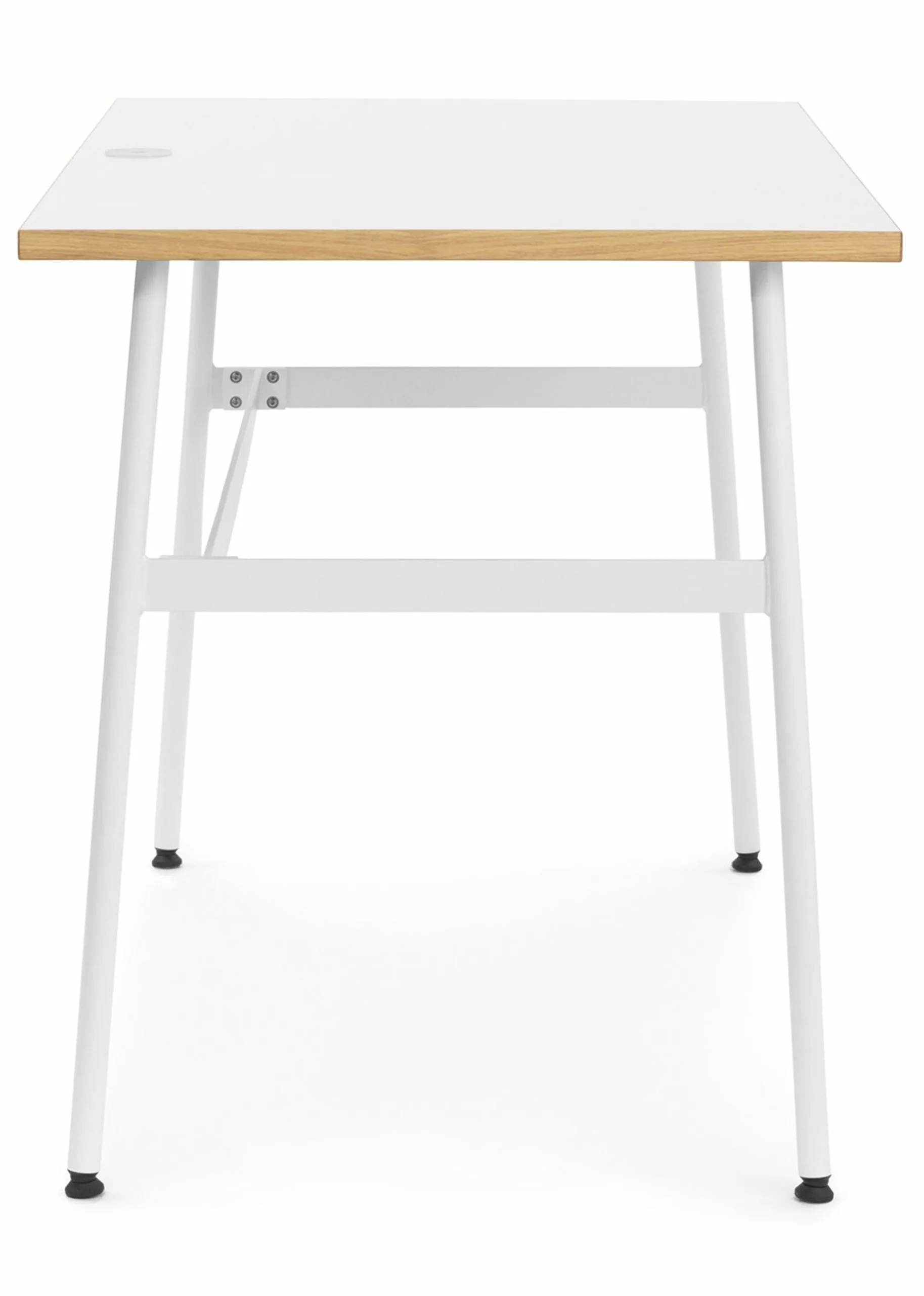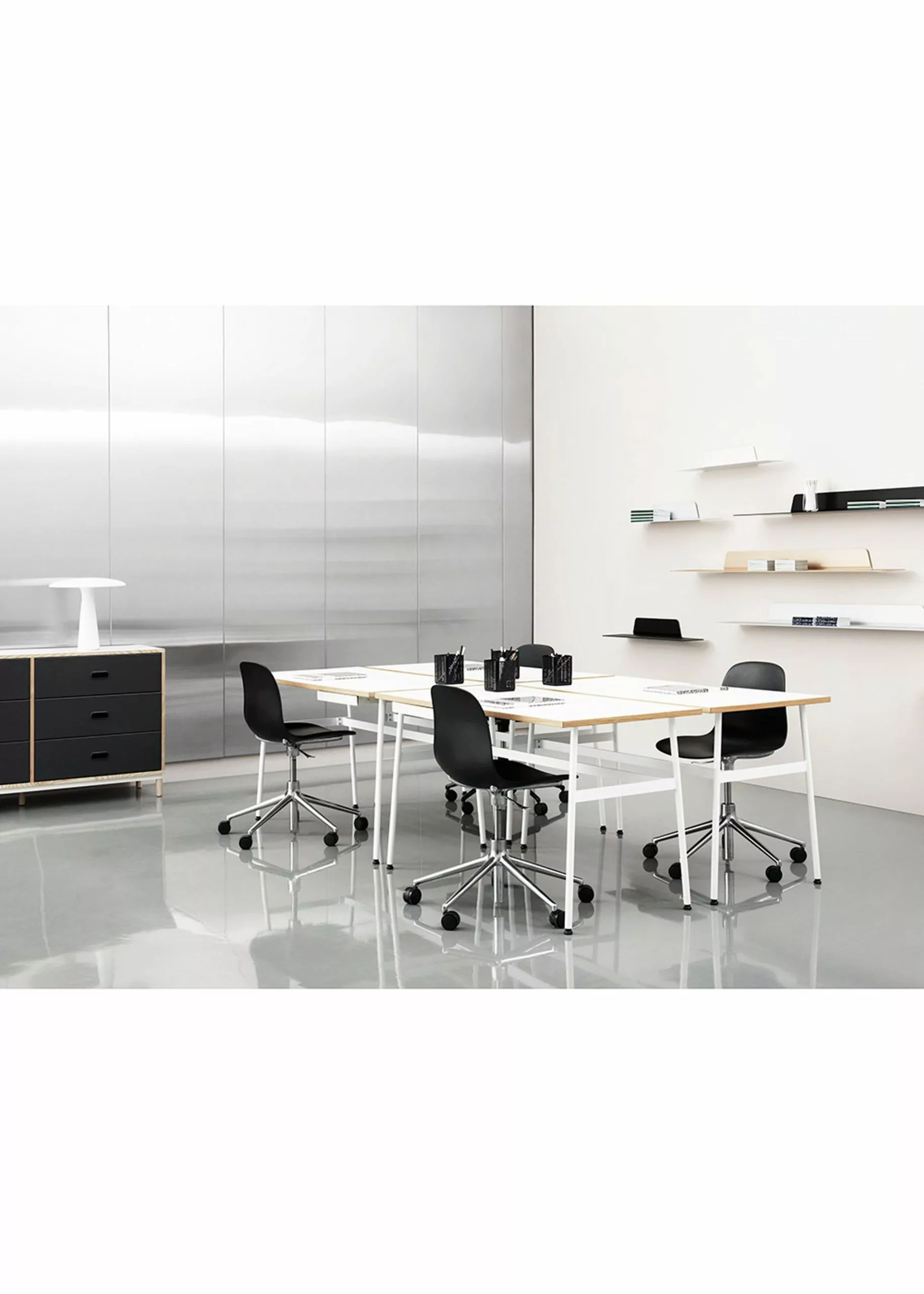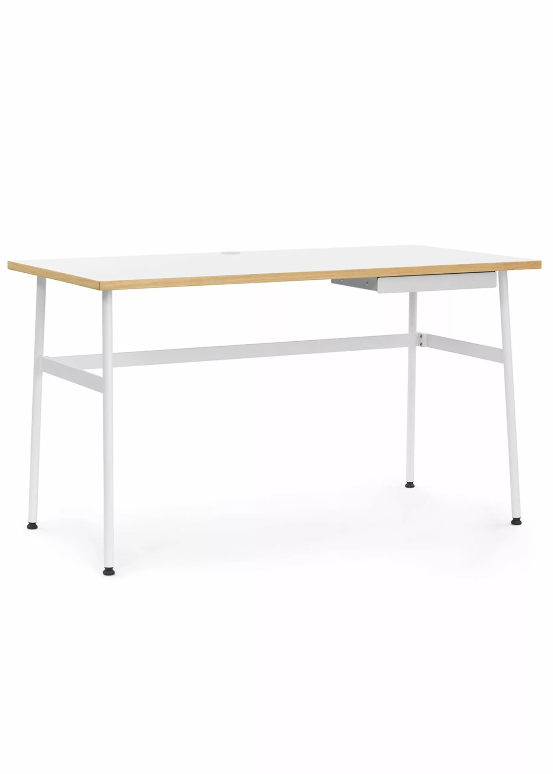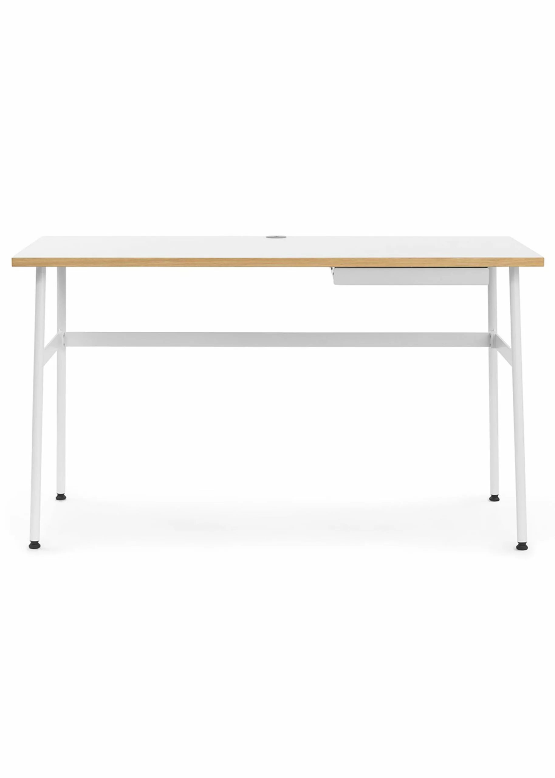 Journal is a modern desk by Normann Copenhagen. The table is made of oak veneer with laminated tabletop and the legs and shelves are made of powder coated steel. Clean the desk with a damp cloth. The table has a cable socket for your charger and a drawer with room for writing utensils.