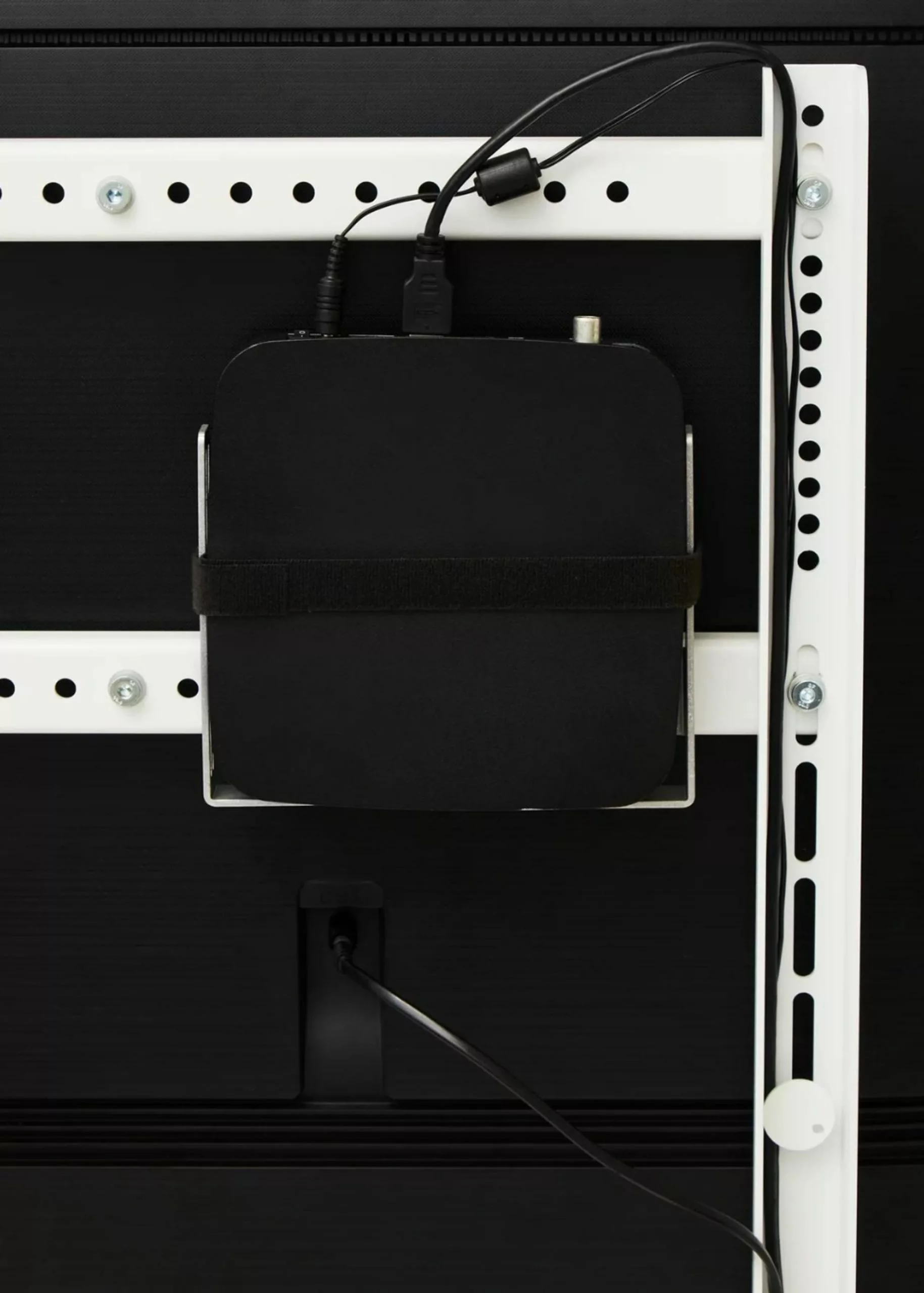The Box Mount from Pedestal is a functional design with an increased size in surface and platform, making it ideal for holding larger devices and consoles, including PlayStations or similar. The Box Mount is placed at the desired height on the stand behind the TV screen and then the device is attached.
