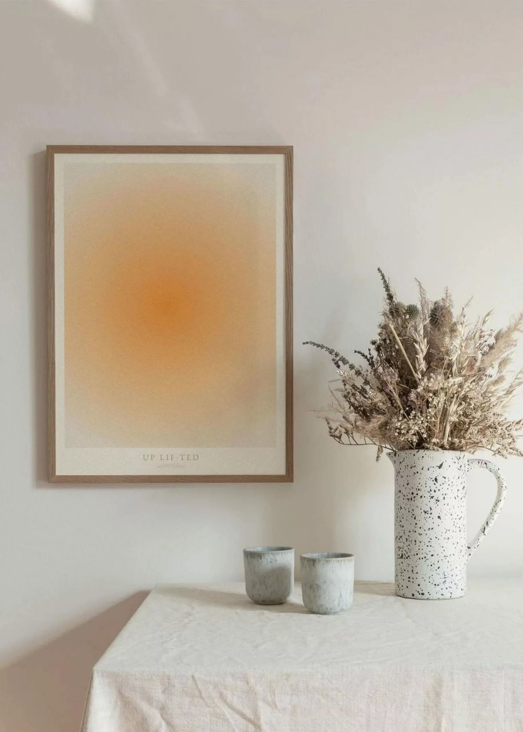 Uplifted is designed by artist Mie & Him. The poster is a graphically illustrated design that does not focus on a motif, but instead an impression and a feeling. Colors are characterized by their emotional contexts and this orange color that gently graduates towards the edge.