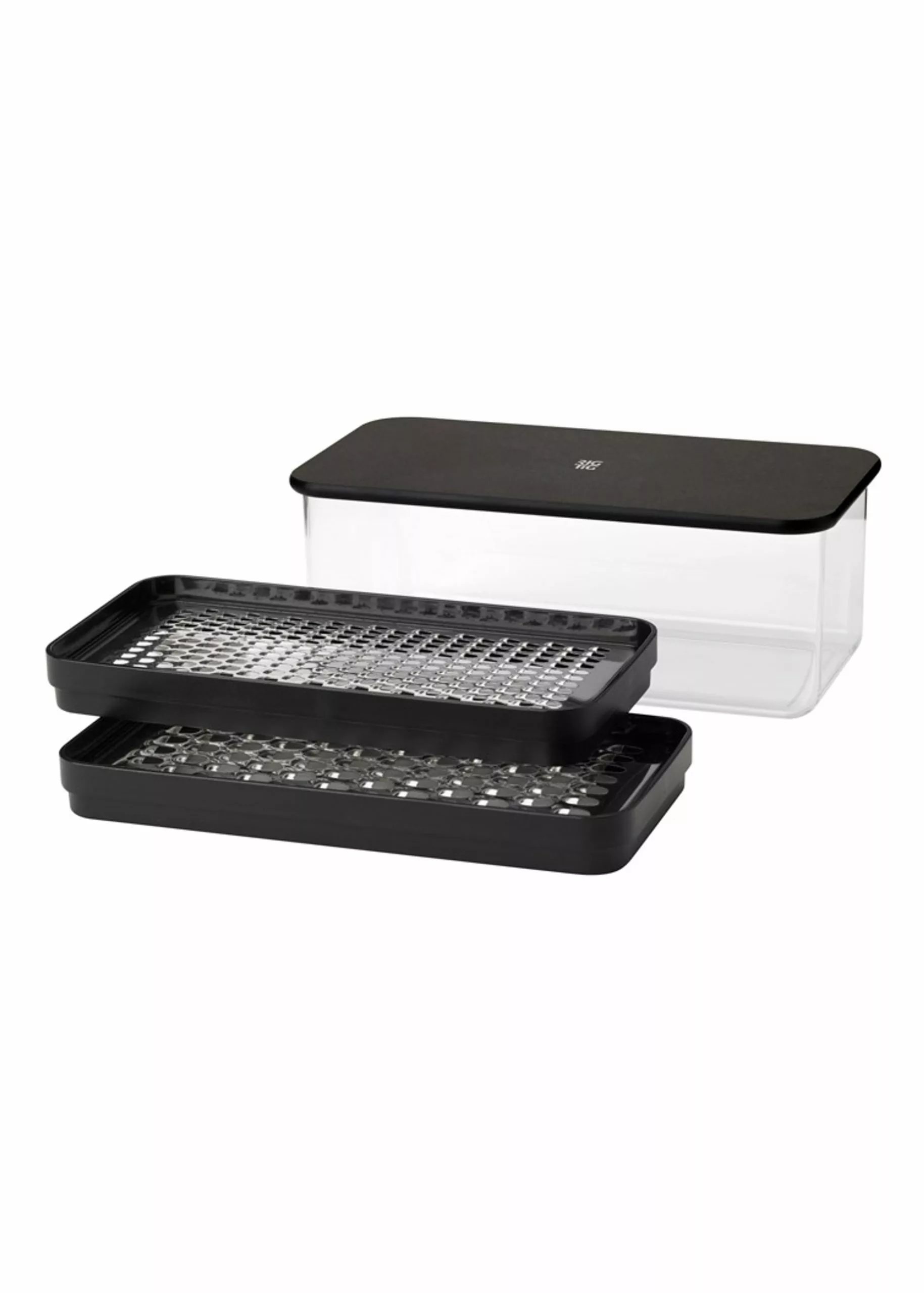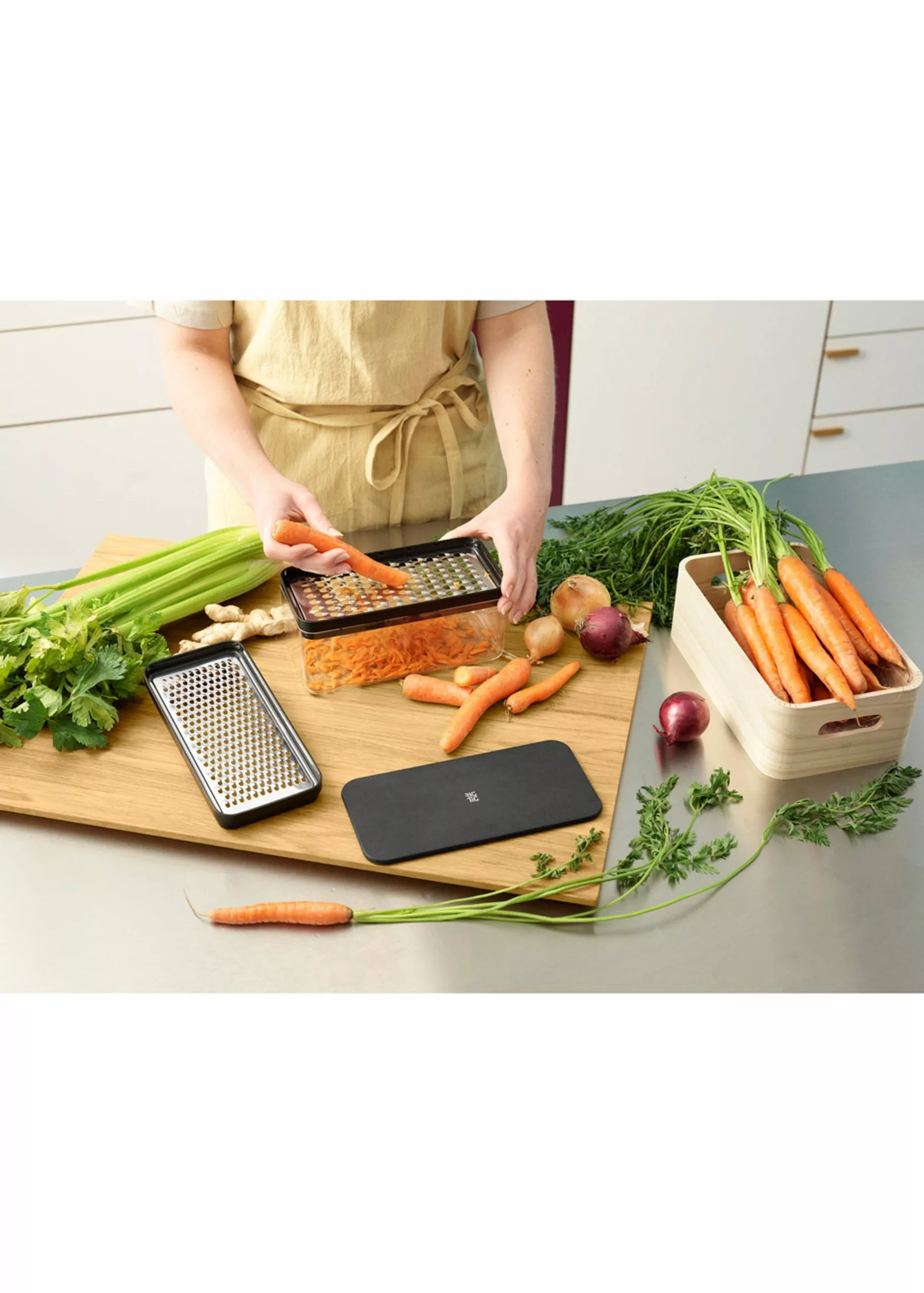 GRATE-IT is the perfect set for grating fruit or vegetables. The set consists of two graters, one coarse and one fine, a container for the grated fruits or vegetables and a lid. This makes cooking much easier and more convenient. Instead of having grated vegetables and fruits all over the kitchen table, the grated vegetables and fruits go straight into the container. This makes the set easy to use for both children and adults.