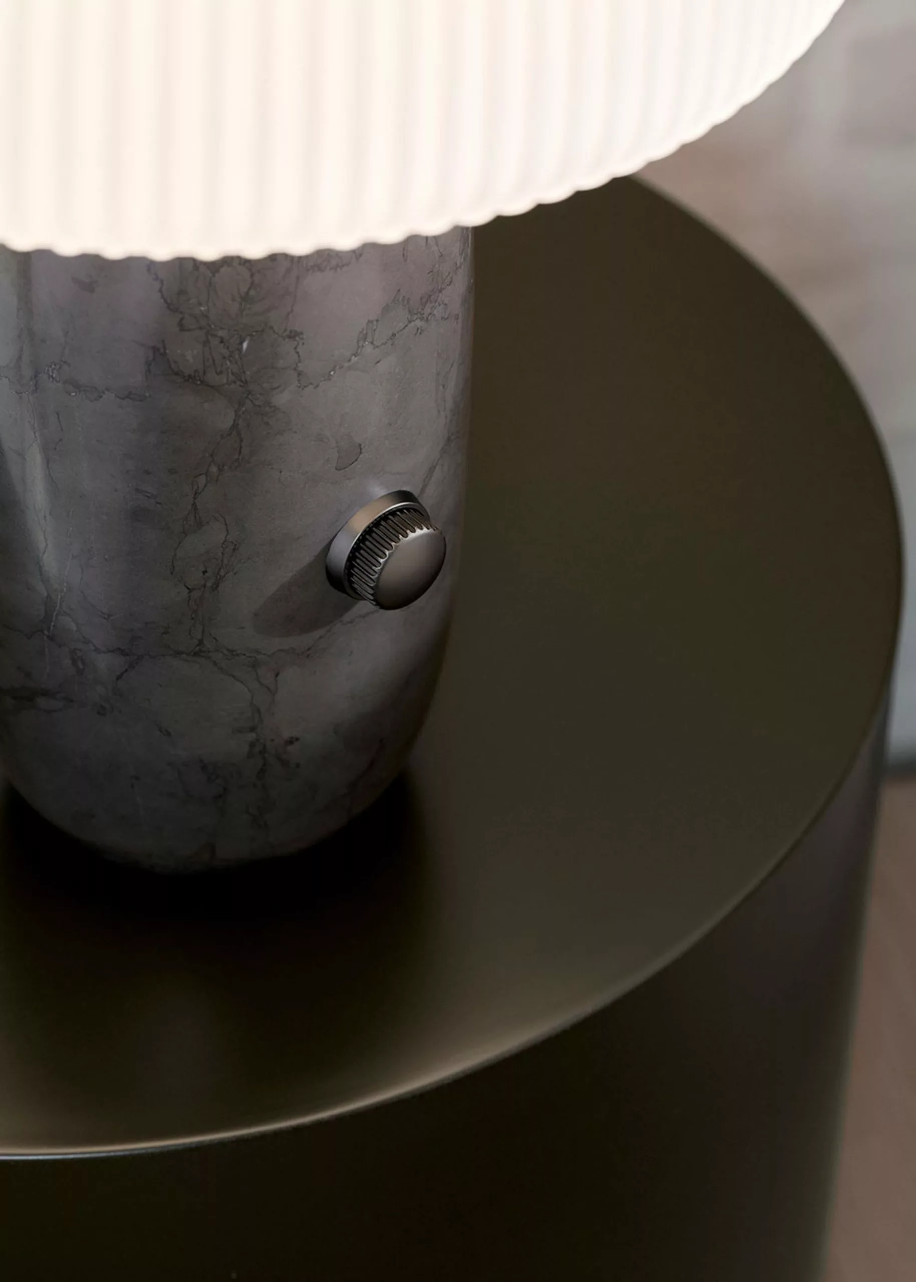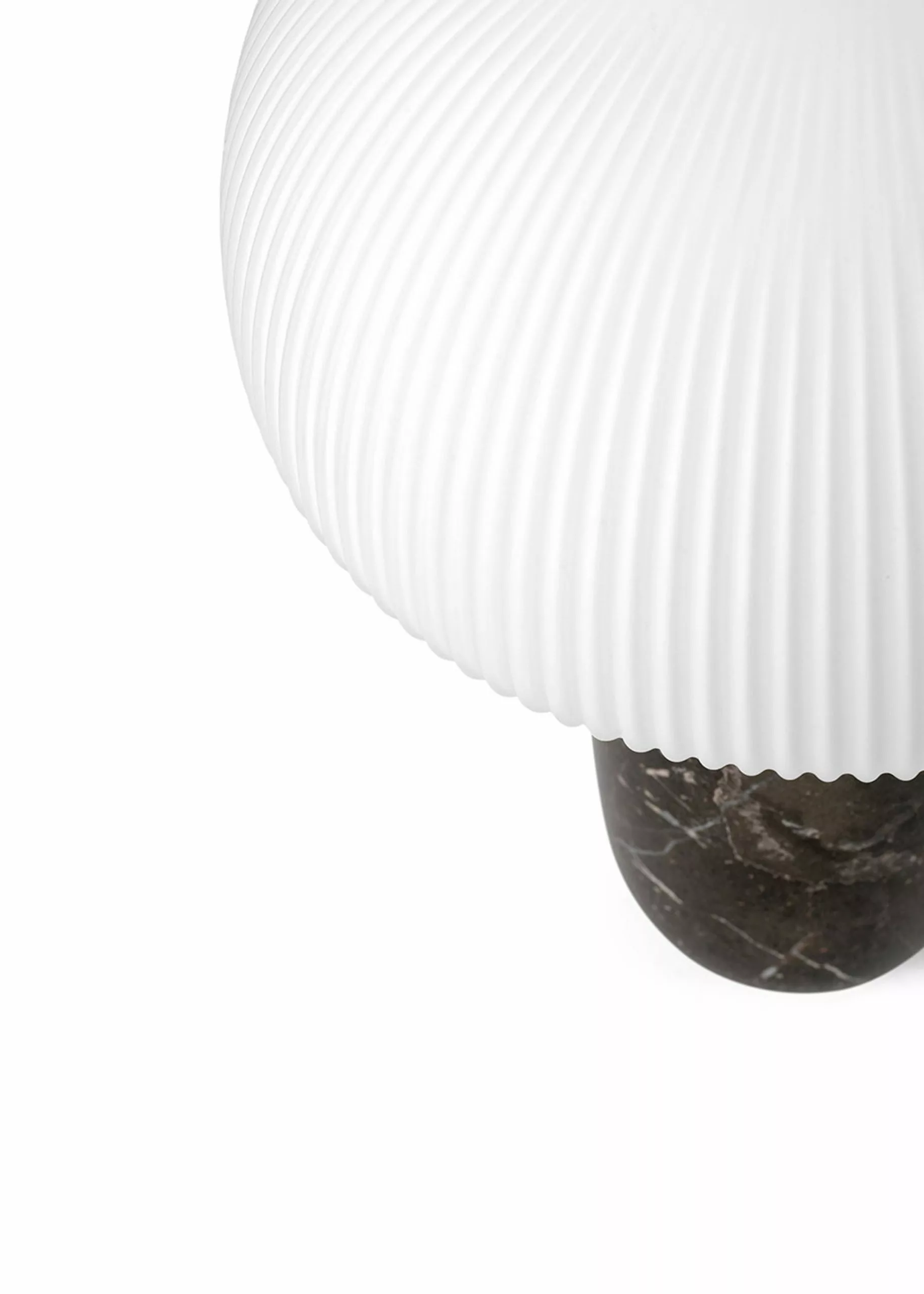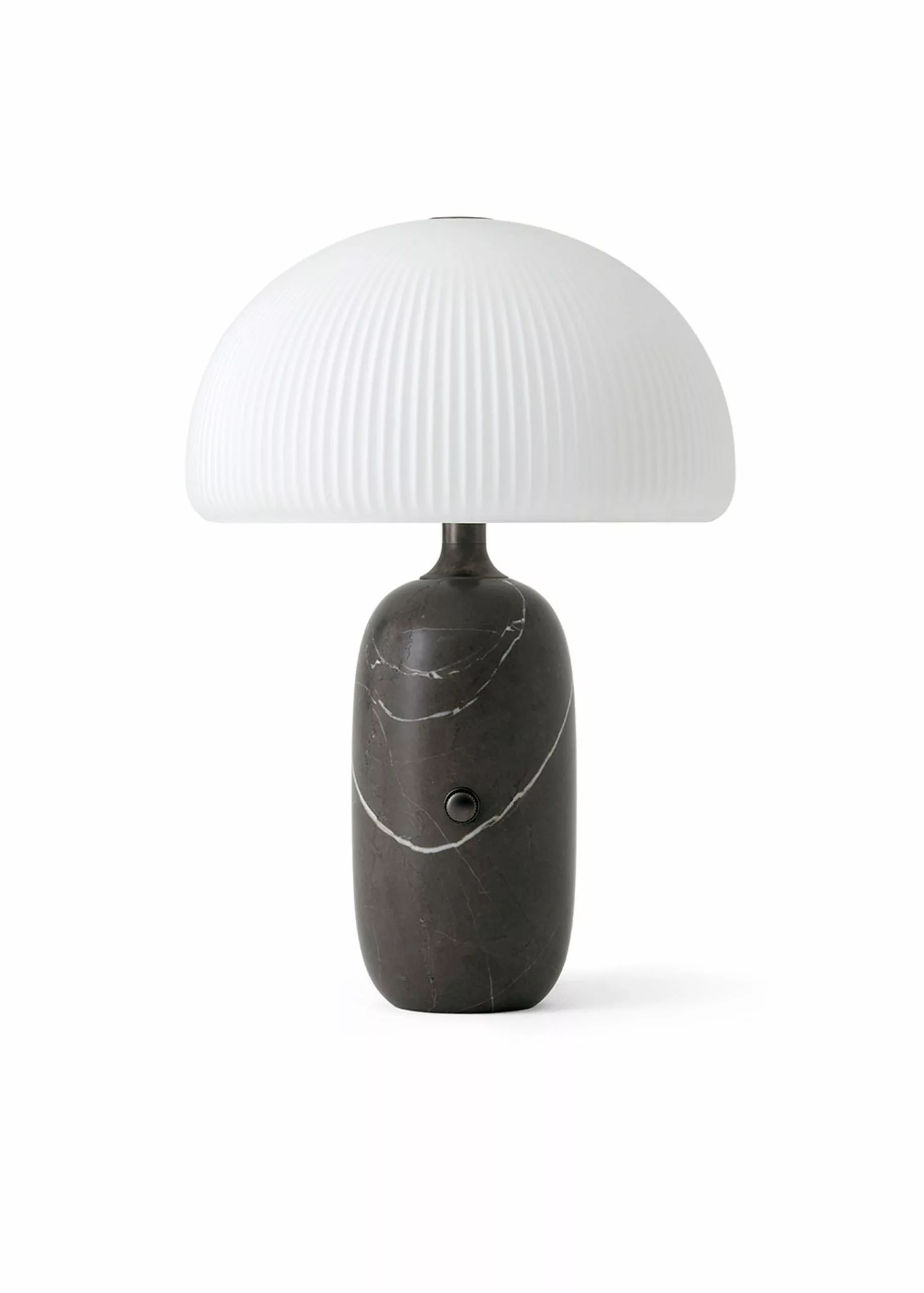 'Sculpture', as the name suggests, is characterised by its sculptural design, combining luxurious materials that together create an aesthetic expression. The lamp's base is made of polished marble which adds weight to the design and creates a solid base. The shade is composed of three layers of hand-blown opal glass that has a frosted surface with elegant slats. The lamp's mushroom-shaped shade and layers of opal glass provide a unique diffused light that creates a warm atmosphere in the room. A metallic dimmer is added to the lamp's base, allowing you to adjust the light as needed, making it ideal for the living room and bedroom.