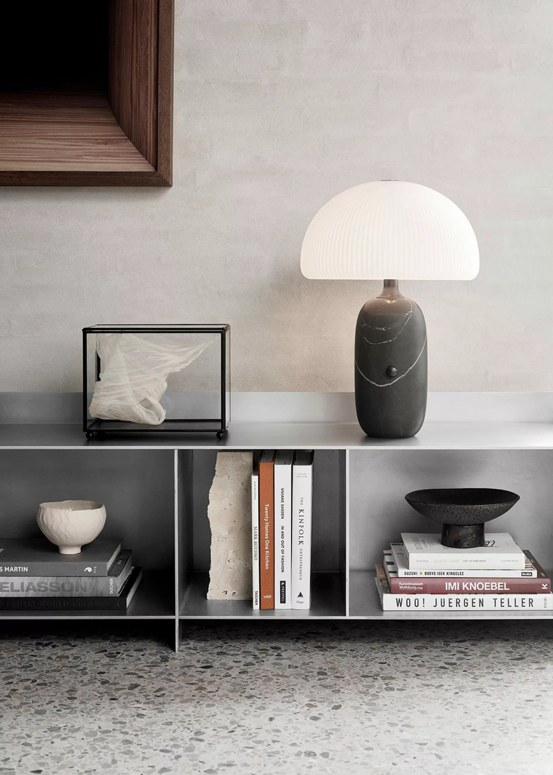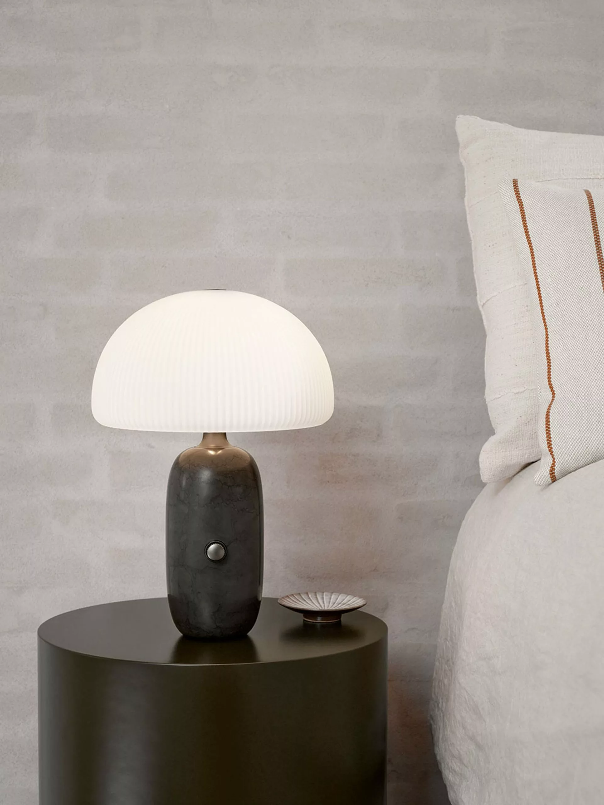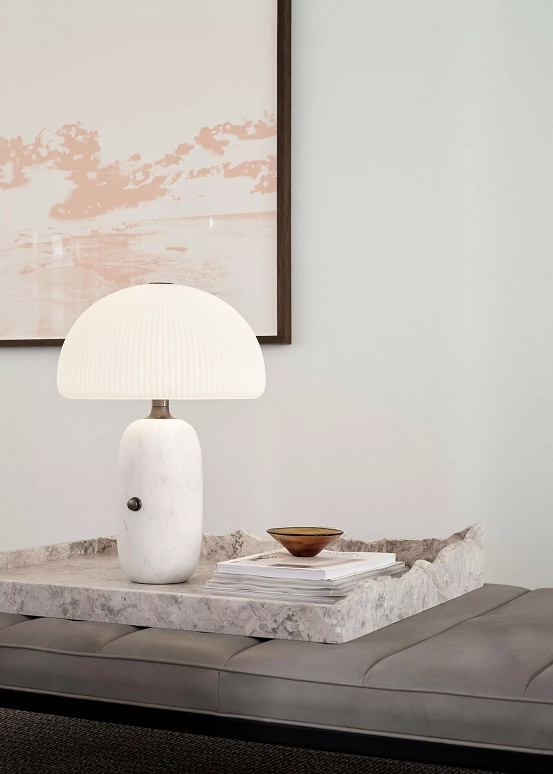 'Sculpture', as the name suggests, is characterised by its sculptural design, combining luxurious materials that together create an aesthetic expression. The lamp's base is made of polished marble which adds weight to the design and creates a solid base. The shade is composed of three layers of hand-blown opal glass that has a frosted surface with elegant slats. The lamp's mushroom-shaped shade and layers of opal glass provide a unique diffused light that creates a warm atmosphere in the room. A metallic dimmer is added to the lamp's base, allowing you to adjust the light as needed, making it ideal for the living room and bedroom.