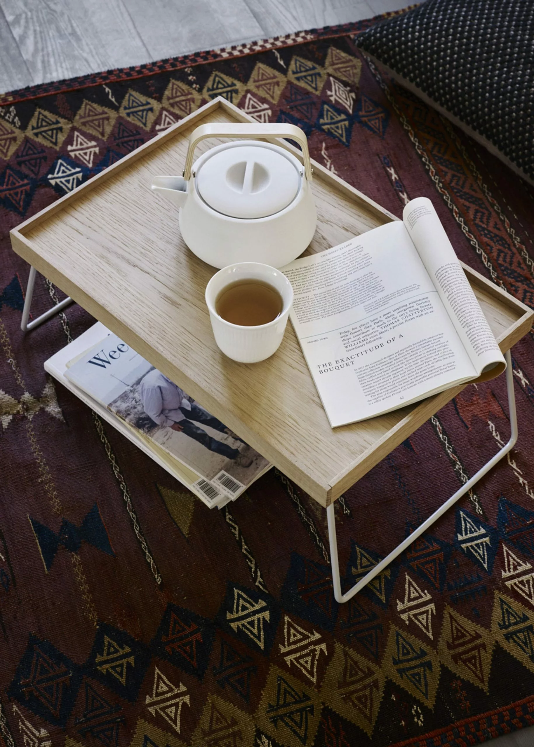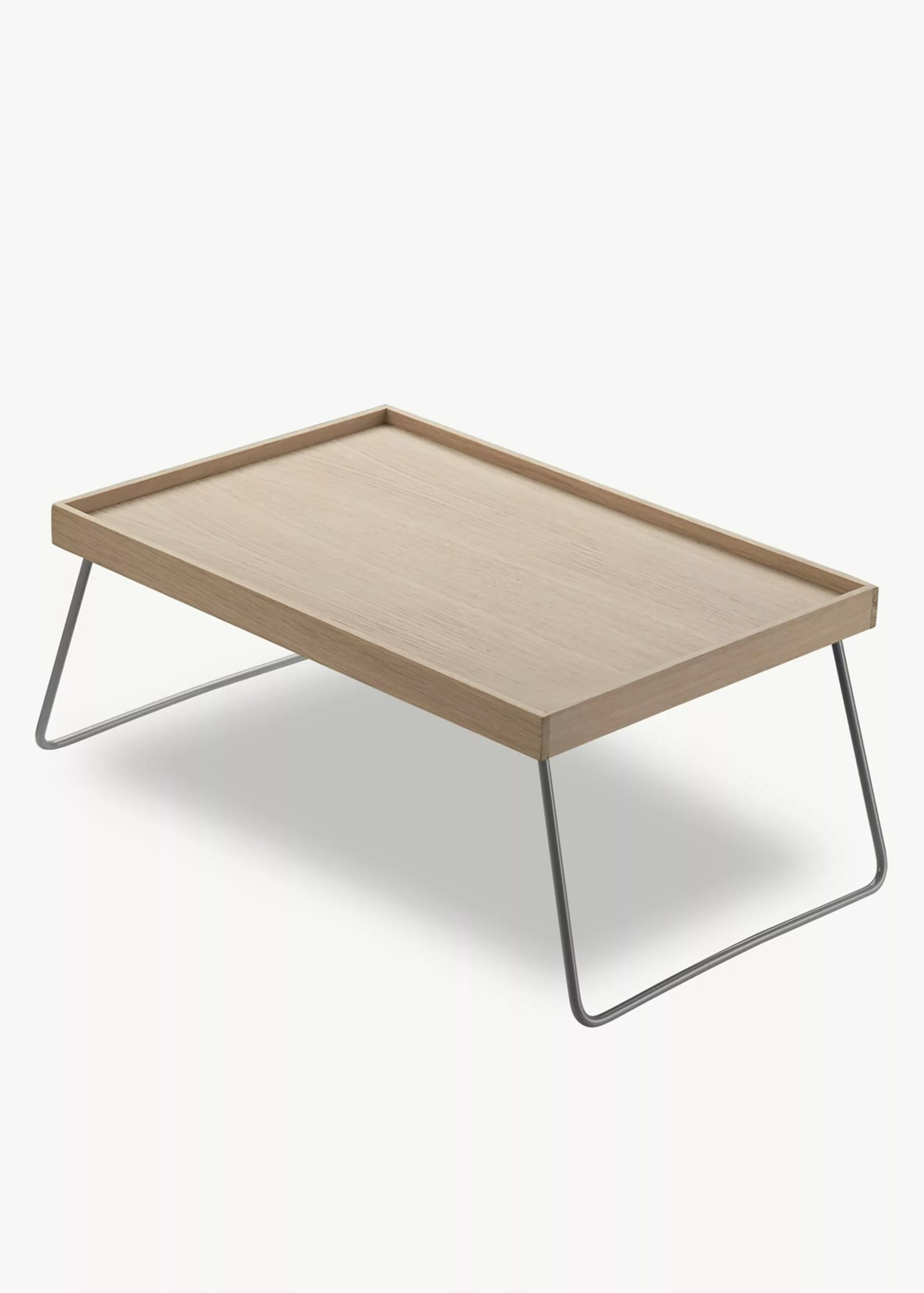 Fold in the legs, and you have a wide, classic serving tray in untreated oak looking like it is floating just above ground.