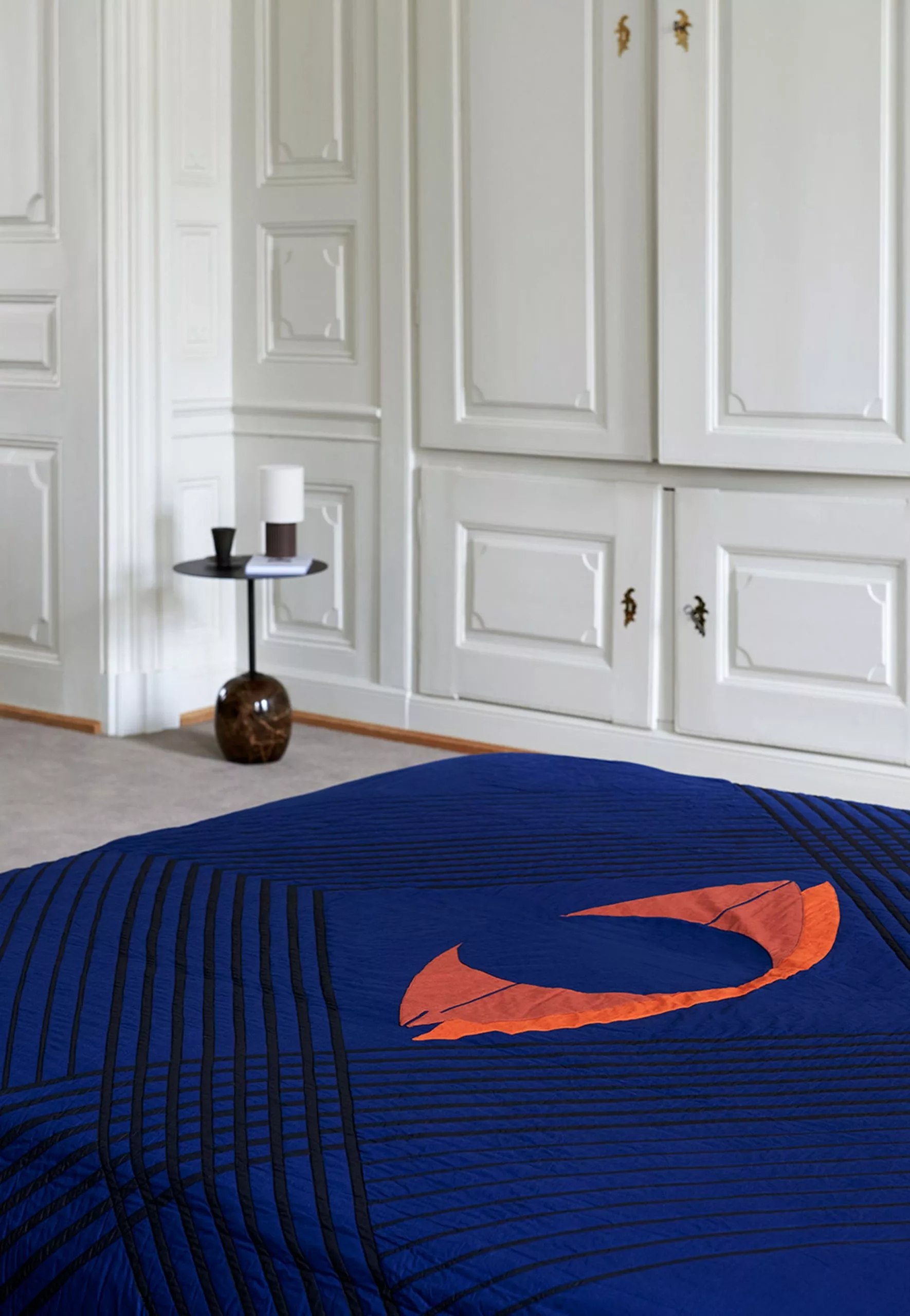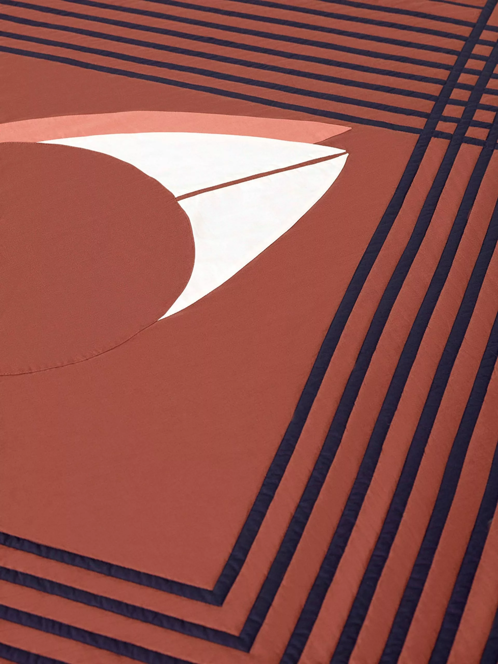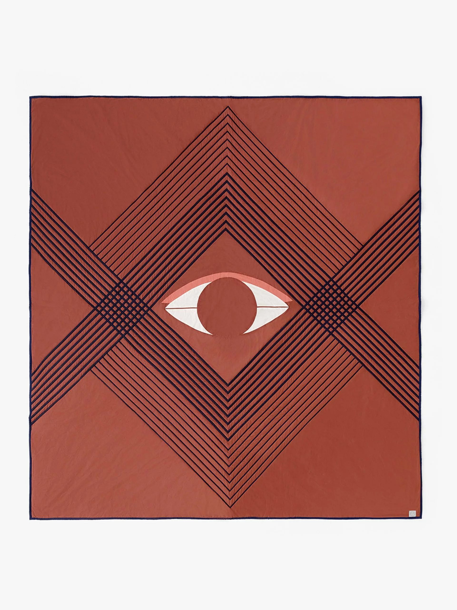 The Eye bedspread is designed by the contemporary brand All the Way to Paris. The bedspread depicts an eye in the centre of a geometric design. It is quilted by hand and made of organic cotton.
