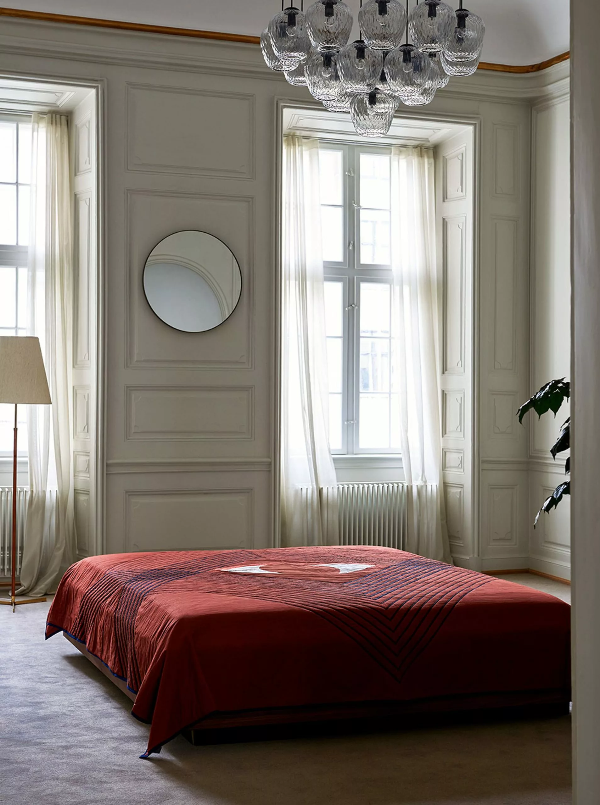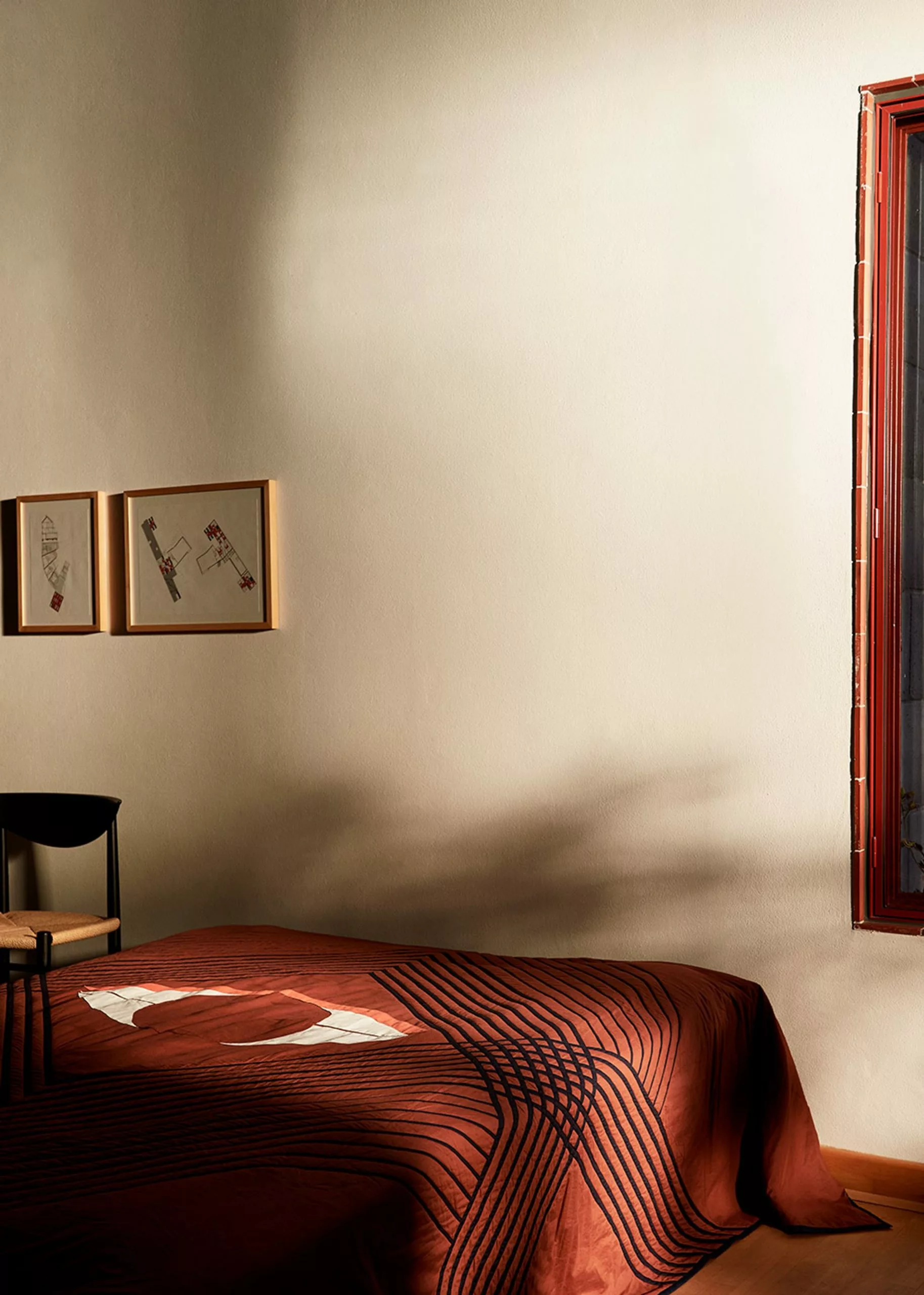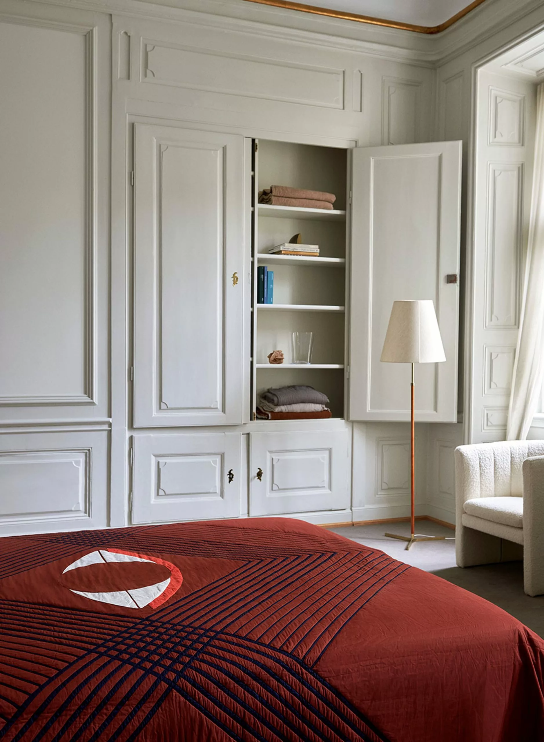 The Eye bedspread is designed by the contemporary brand All the Way to Paris. The bedspread depicts an eye in the centre of a geometric design. It is quilted by hand and made of organic cotton.