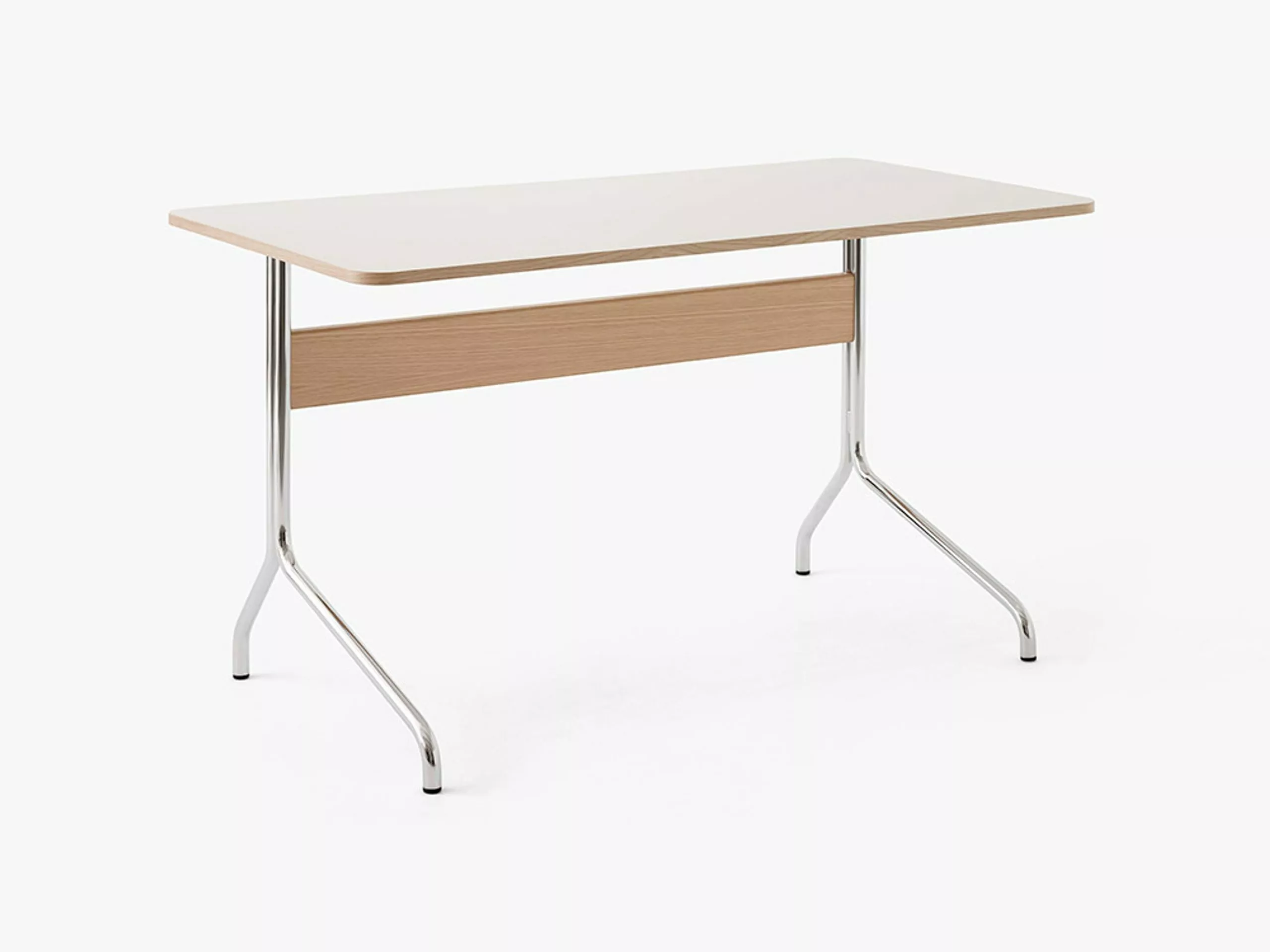 The Pavilion series is designed by Anderssen & Voll in 2021. The inspiration behind the series comes from the Langelinie Pavilion. The series originally only consisted of chairs, but later, a desk was designed. The desk was made to suit both the home space and the office. As it was designed at the start of the corona pandemic, the Pavilion desk was designed with home-working in mind. The desk is available in a version that has a back panel (AV17) and a version without the back panel (AV16).