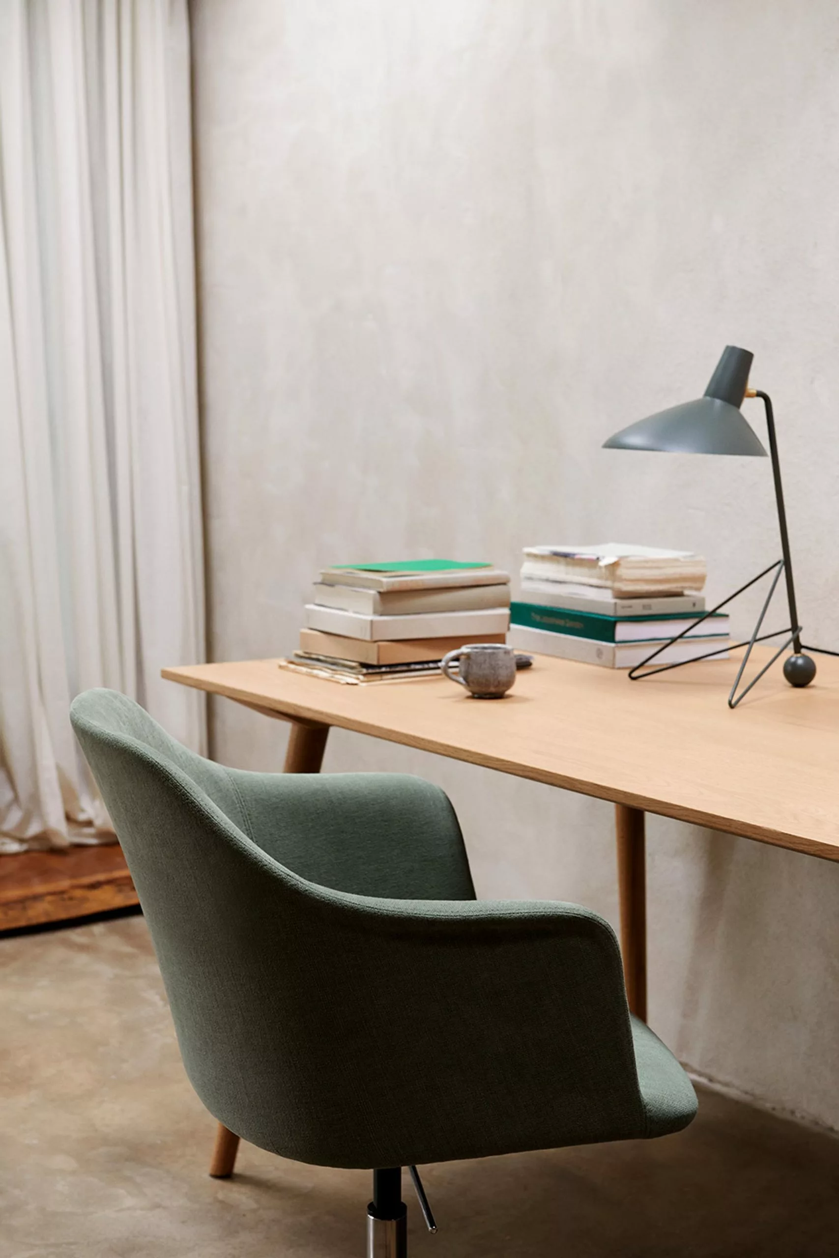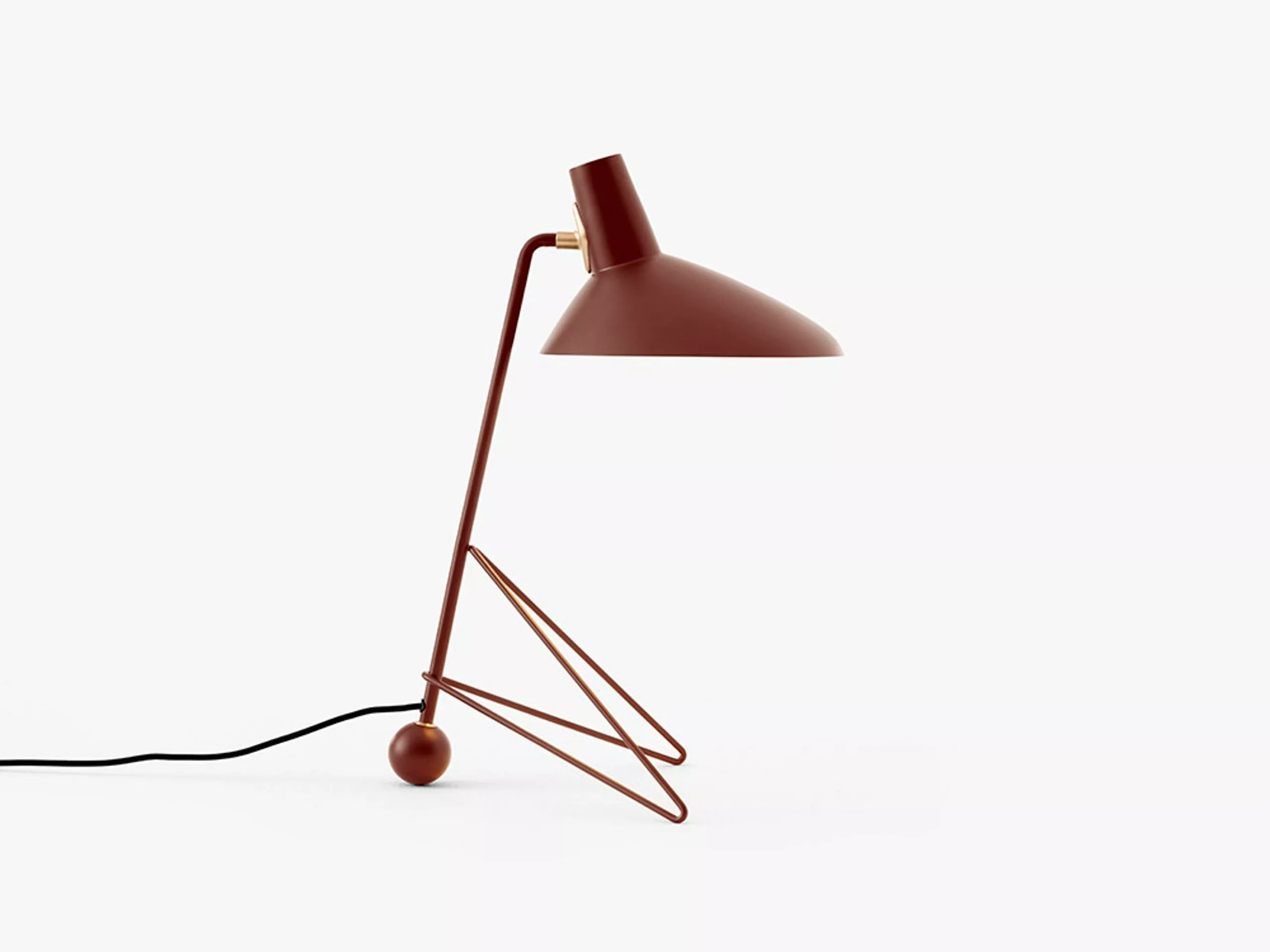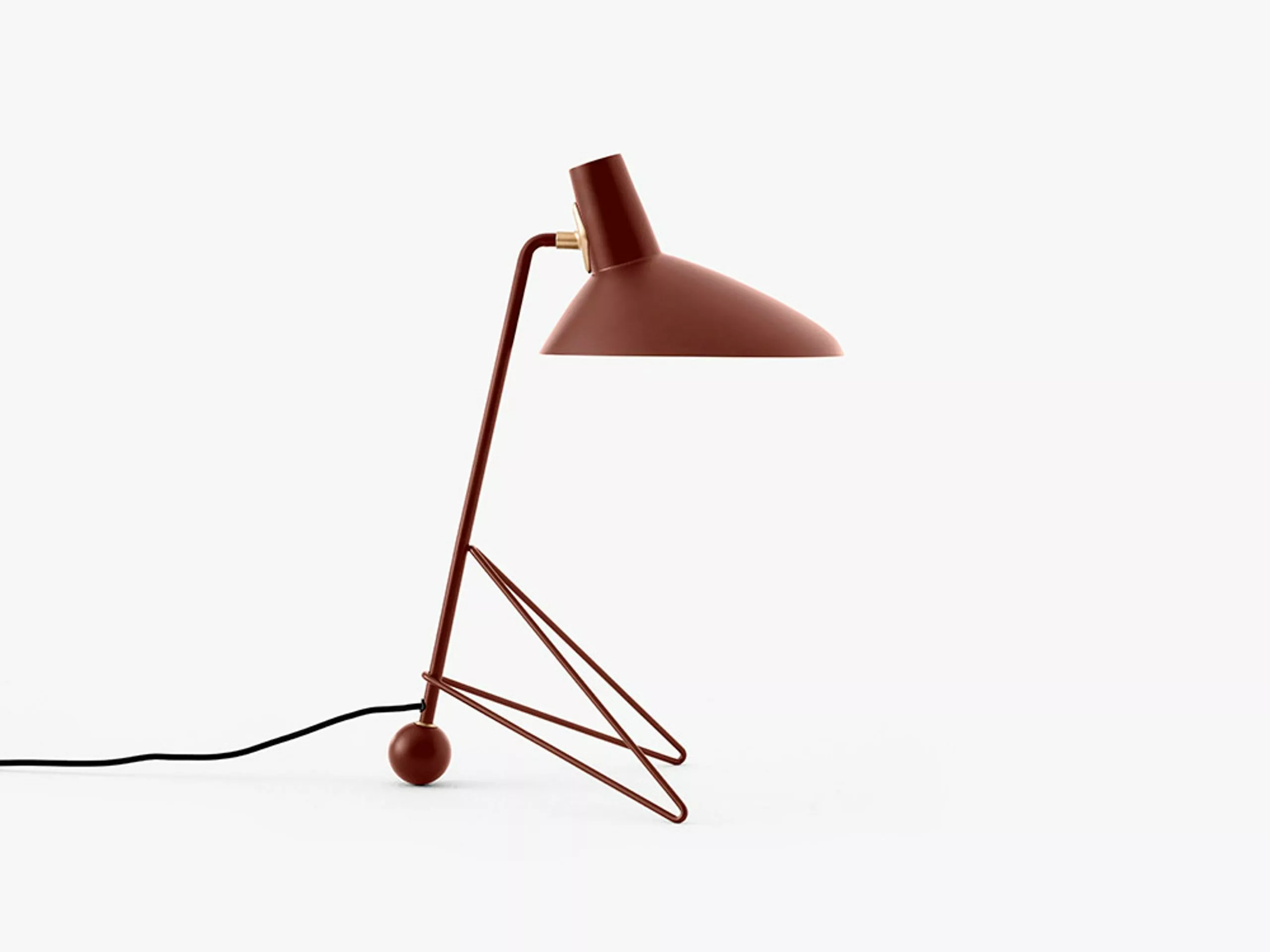 Tripod was designed by Hvidt & Mølgaard in 1953. The floor lamp is made of lacquered metal and brass. The lamp creates a fine balance between the sharp simplicity of the design and the softness of the curved edges of the base. The cord is made of fabric and comes with an on/off switch. Although the floor lamp was designed in 1953, it is the first time it is in production.