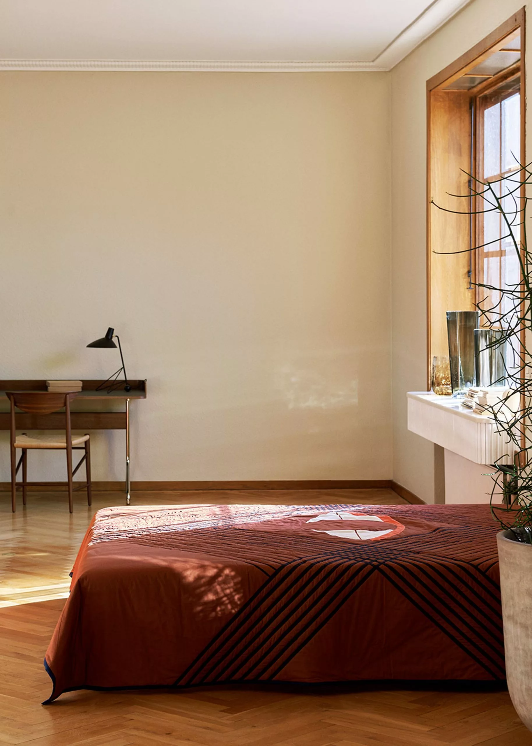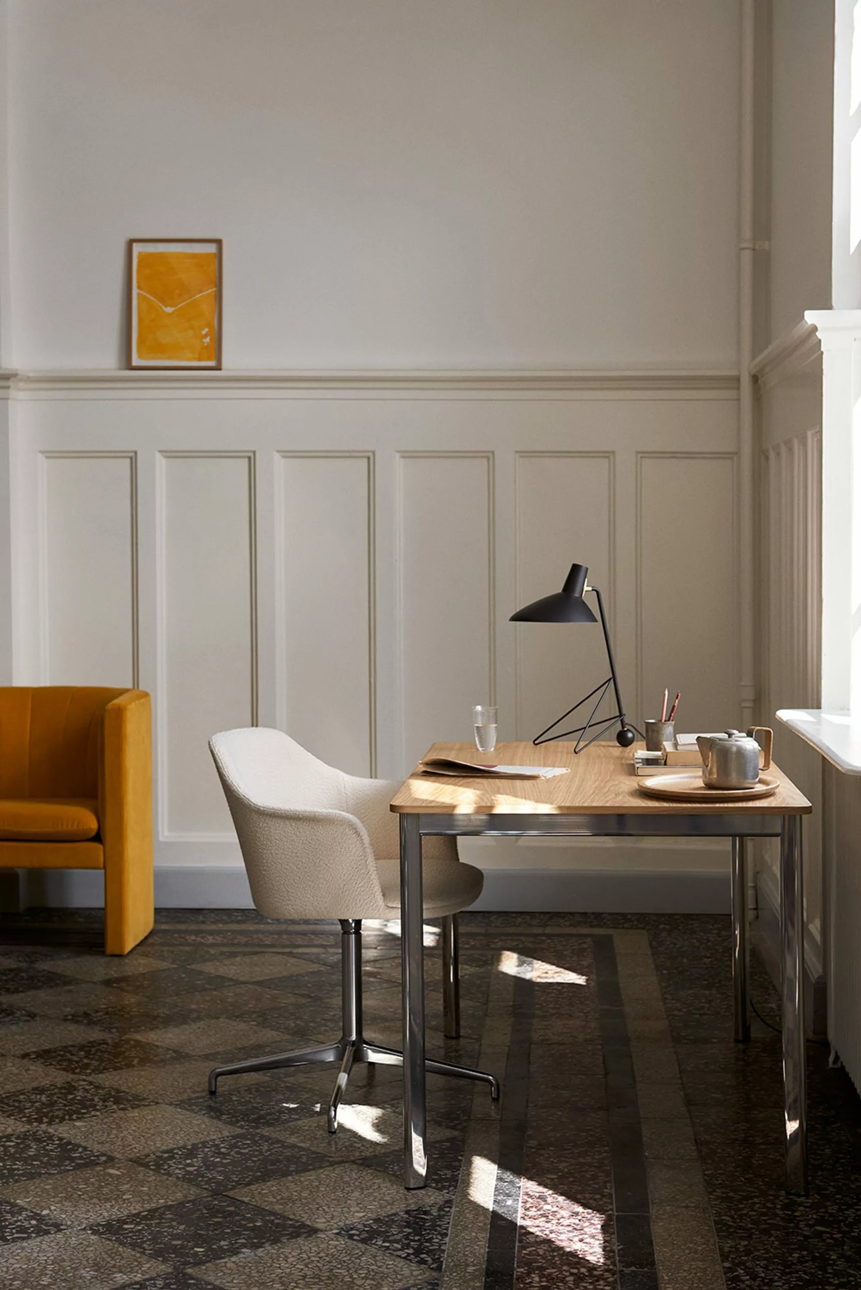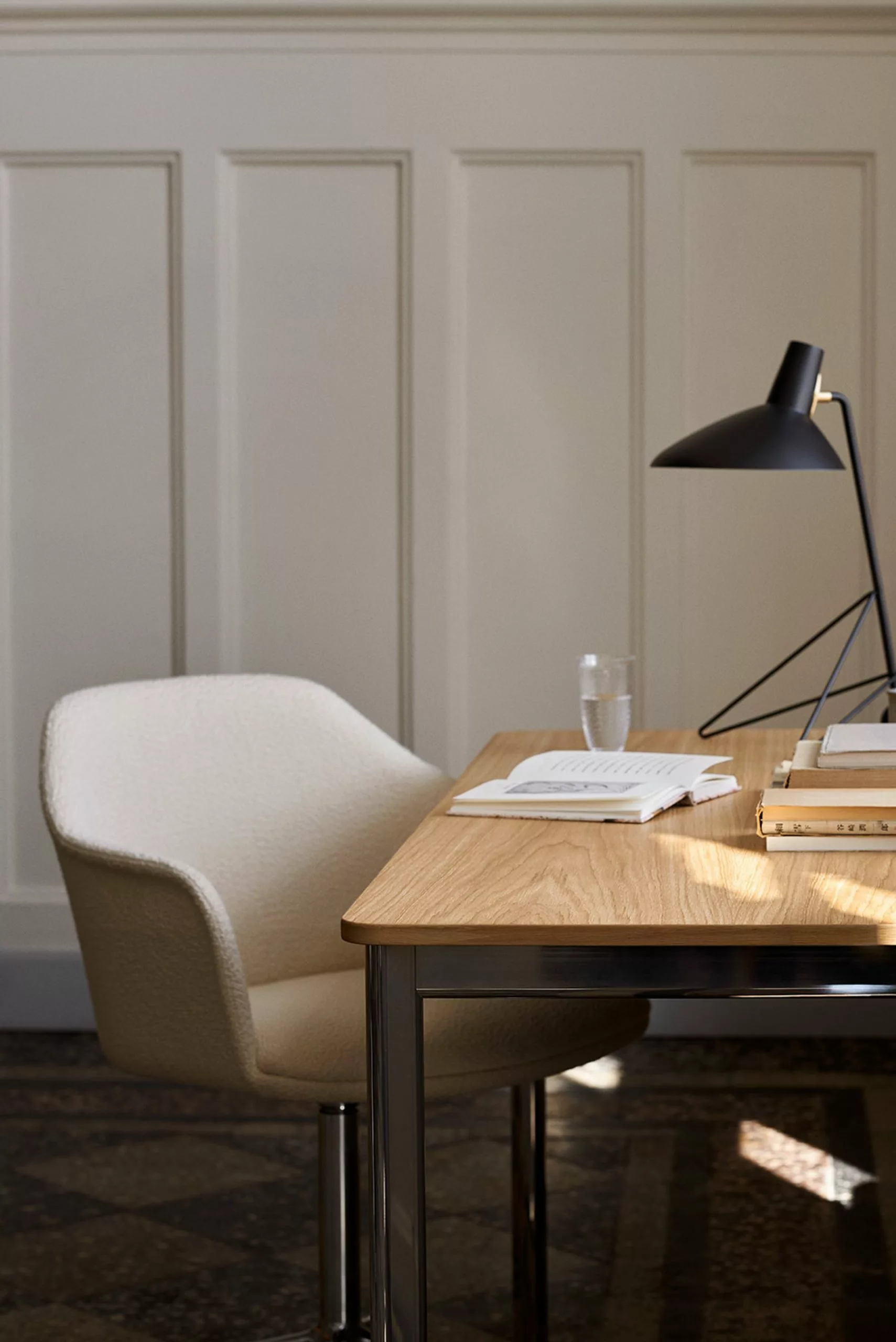 Tripod was designed by Hvidt & Mølgaard in 1953. The floor lamp is made of lacquered metal and brass. The lamp creates a fine balance between the sharp simplicity of the design and the softness of the curved edges of the base. The cord is made of fabric and comes with an on/off switch. Although the floor lamp was designed in 1953, it is the first time it is in production.