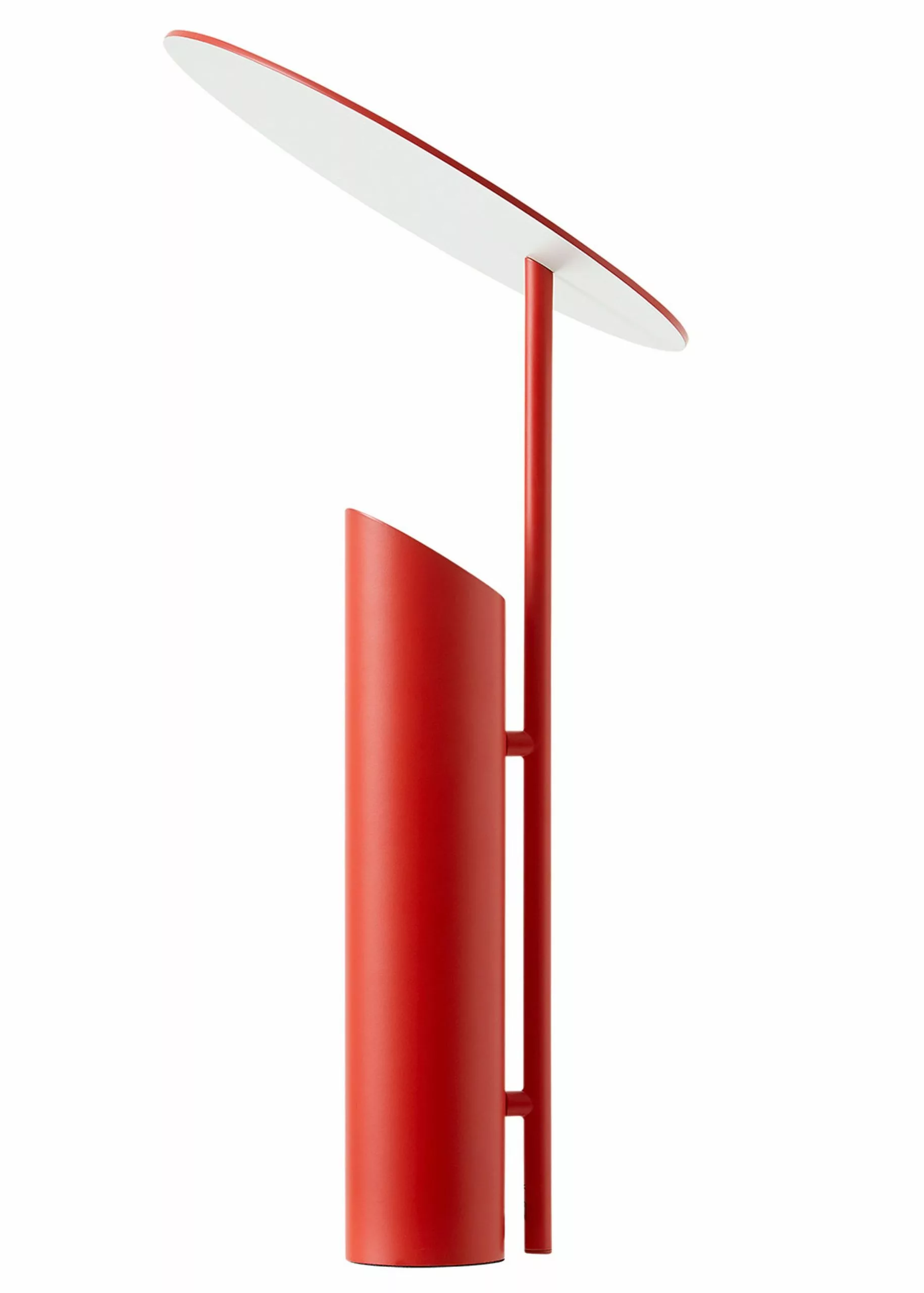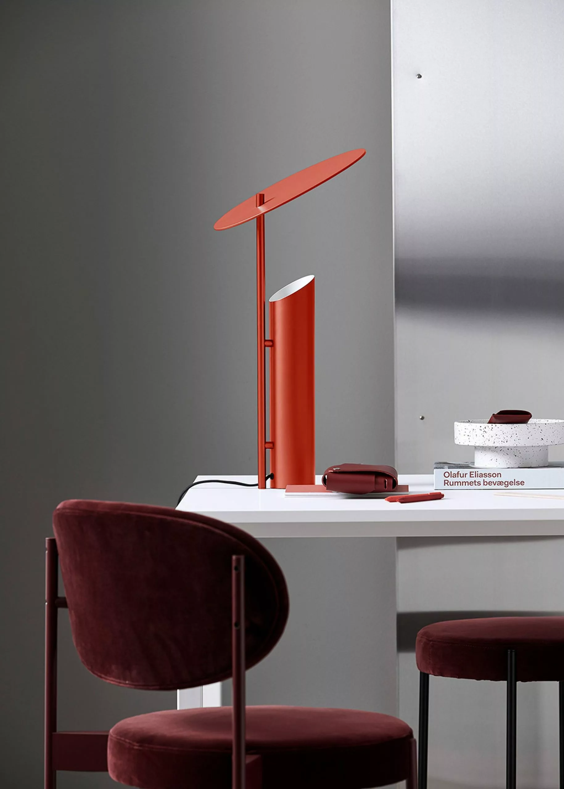 Reflect is designed by Verner Panton. The table lamp has a disc as lamp shade that reflects the light from the base of the lamp. All the parts are manufactured in steel. The lamp is available in grey or red.