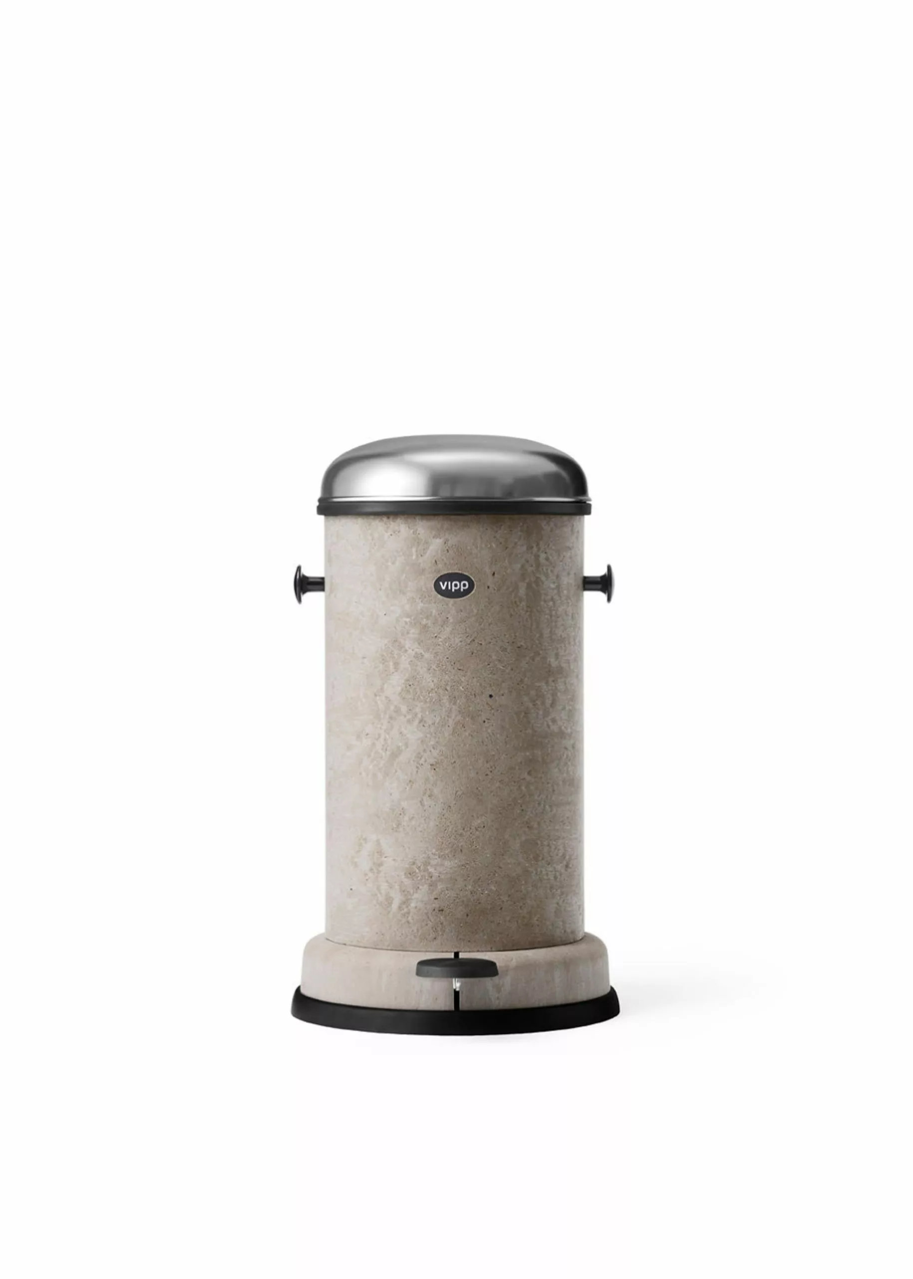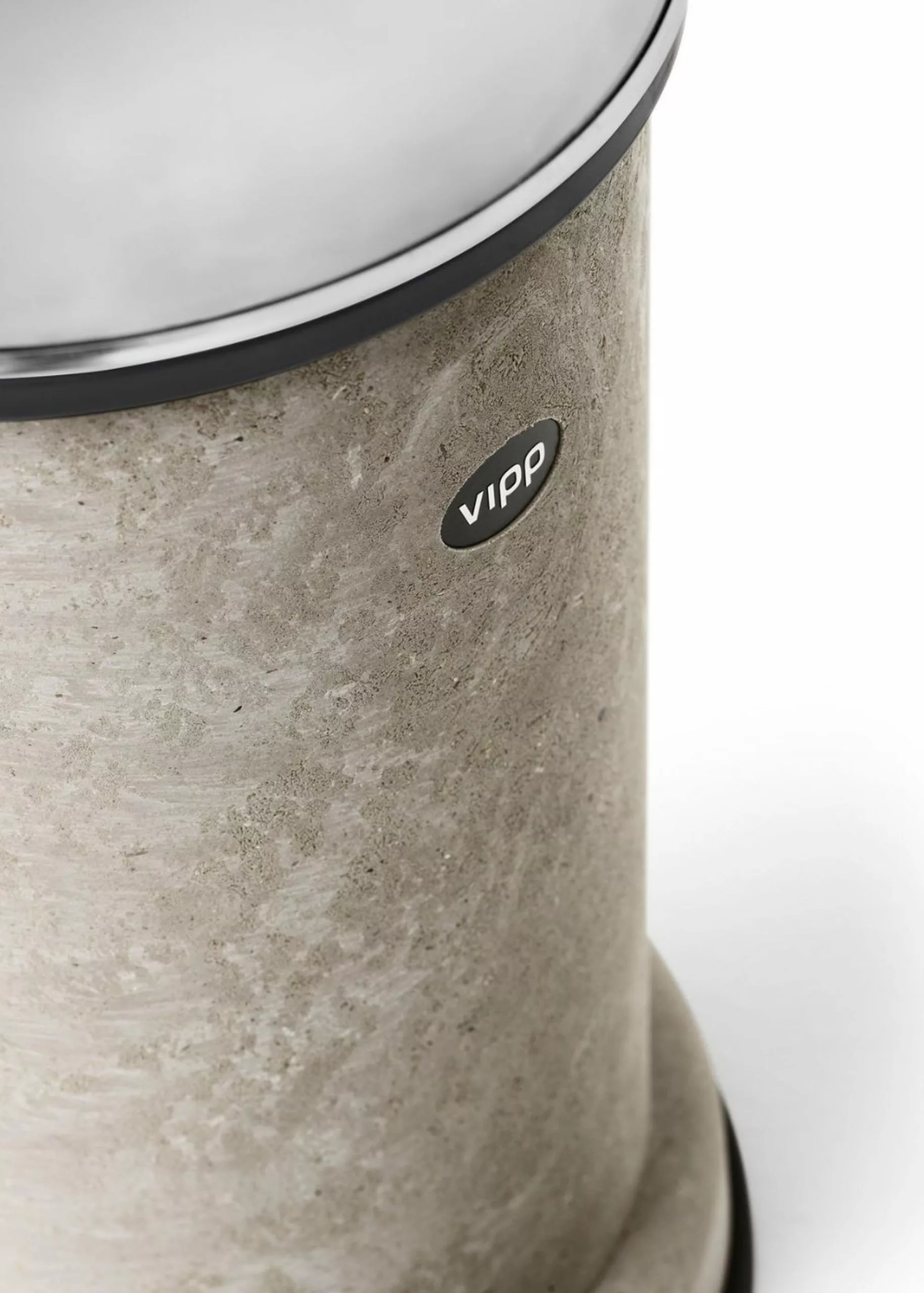 To minimise the use of steel, the bin's inner compartment is fitted with a metal ring for mounting Vipp's regenerated plastic liners, replacing the standard galvanised inner bin. The original dome-shaped stainless steel lid remains intact as a unique design feature of the original bin. Rubber components and pedal mechanism are replicated equally from the standard bin due to its proven longevity and durability.