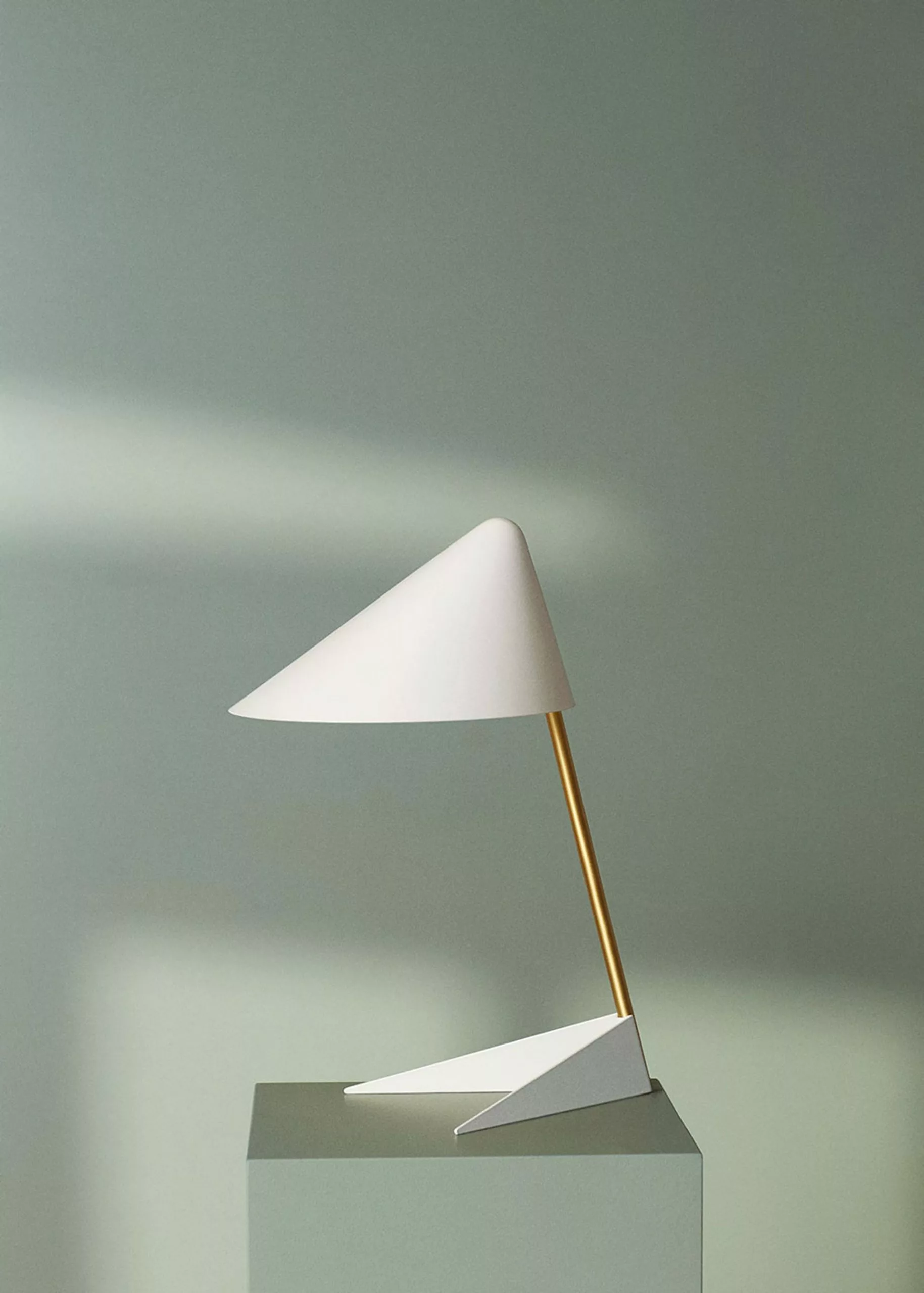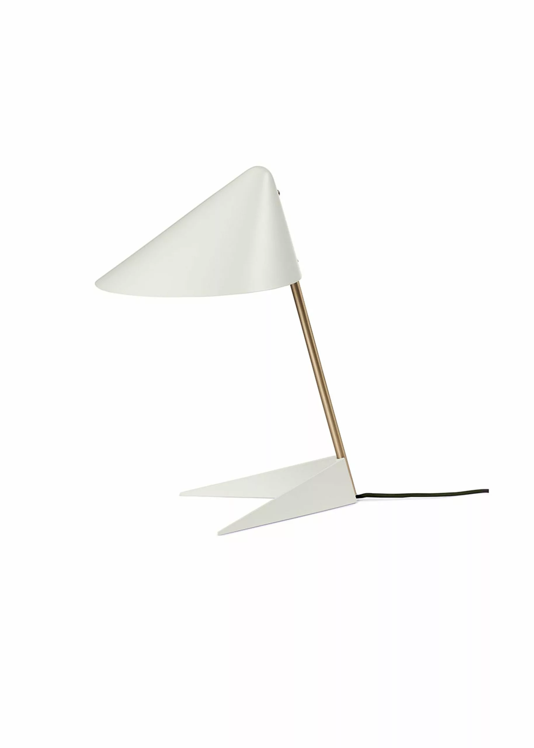 The 'Ambience' lamp, designed by Danish Svend Aage Holm-Sørensen, is at once a prime example of the modernist trends of the 1950s and Holm-Sørensen's unique sense of capturing light in figurative designs. The wide sculptural shade provides a focused yet soft light, resting on an elegant bipod base that together create an asymmetrical masterpiece of attractive light. In keeping with 50s design trends, the lamp is available in a combination of classic colours and brass, but also in a modern monochrome version in bold colours.